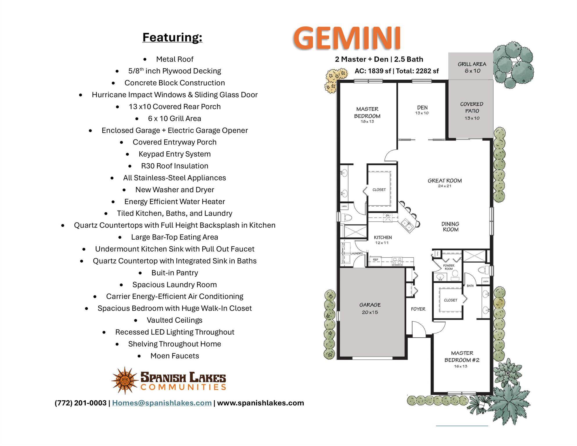 The Gemini model is ideal for multi-use living, offering 2 full master suites, 2.5 baths, and a den that's perfect as an office or guest space. Designed for privacy and flexibility, this layout is ideal for couples, caretakers, or anyone who loves to host. Concrete block construction, impact windows, and premium finishes throughout. Live maintenance-free in a vibrant 55+ community filled with resort-style amenities and friendly neighbors. All floorplans are built with 3/16th true plywood roof sheathing, hurricane tie straps, R-30 insulation, & hip roof designs ensuring big insurance premium discounts. Our homes are equipped with all energy efficient appliances.