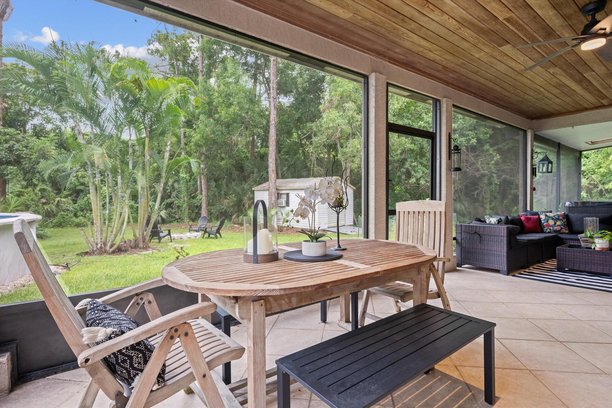 Two Homes for the price of One! Jupiter Farms Living - Freedom, Space, and Privacy! Welcome to this beautifully maintained home offering a 3 bedroom plus office/4th bedroom, 2 bath main house and a detached oversized garage with adjoining 1 bedroom, 1 bath guest quarters with full kitchen on 1.5 private, fenced, and gated acres in highly sought-after Jupiter Farms, this custom home is designed for both comfort and functionality. Upon entering this home, you are welcomed into a foyer that opens to the living room with vaulted ceilings and triple sliding doors with views to the very private backyard. The kitchen is truly the heart of this home and blends seamlessly with the living and dining rooms. The chef's kitchen boasts a center cooking island with an abundance of solid wood