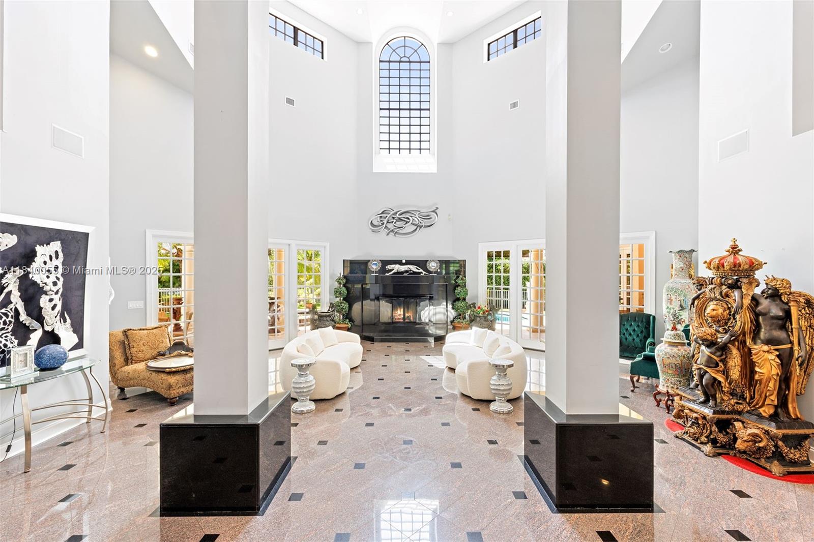 ROOF WILL BE BRAND NEW. Experience one of Eagle Trace’s finest estates! Nearly an acre with 8,000+ sq. ft., 6 bedrooms, 9 baths, and 3-car garage. Soaring 30-ft ceilings, marble floors, and natural light set the tone. Resort-style amenities include heated pool, spa, sauna, steam shower, fireplace, and wet bar. A dramatic foyer with sweeping staircase opens to spacious living areas and a chef’s kitchen with granite counters, large island, and Jenn-Air appliances. Upstairs loft is perfect for a game or media room. The grand primary suite offers pool views, custom closets, and a spa bath with Jacuzzi, dual vanities, and bidet. Circular drive and ample parking add convenience. In the exclusive gated golf community of Eagle Trace, this rare home blends luxury, comfort, and privacy.