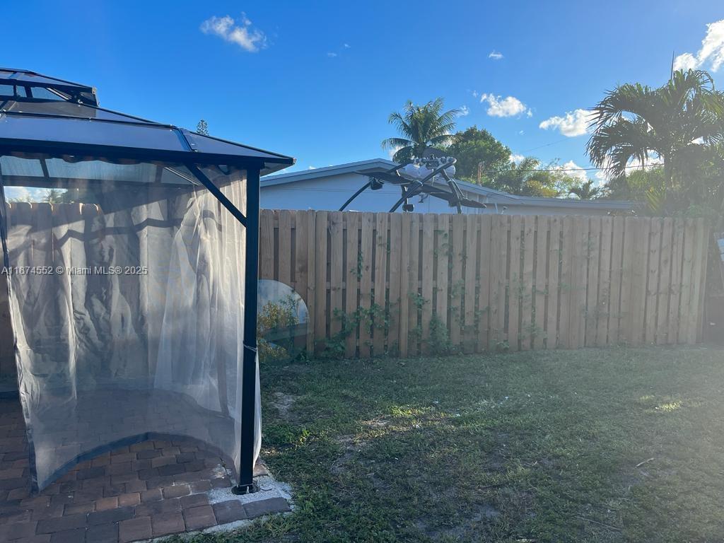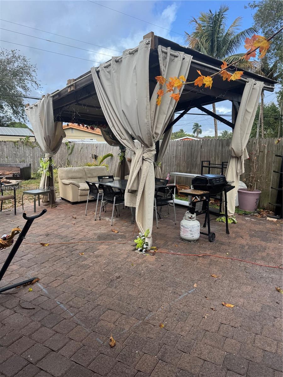 Gorgeous HOUSE, with lot of potential, the house is a 3 bedroom and 2 bathrooms and the family room has been converted into a 4th bedroom with private bathroom and private entrance, plus the house has in the back a studio with full bathroom , huge backyard and a nice terrace to BBQ, on both sides of the house has Gazebos, all Fenced around the backyard and in front of the house, Parking for 5 cars, NEW ROOF 2025, Hurricanes panels for all the windows in the house.