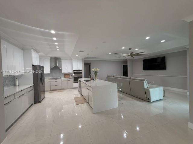 2025 Spacious 5-bedroom, 3-bath home with office and den/family room. with a 5V metal roof, impact windows/doors, and fenced yard. The kitchen and laundry feature 42'' high cabinets, quartz countertops, and a glass backsplash. Porcelain tile enhances main areas; Crown molding, baseboards, and a luxurious primary suite with walk-in closets, designer shower, and free-standing tub . Includes new kitchen stainless steel appliances. Supersized circular driveway, covered patio, and gutters. Move-in ready!