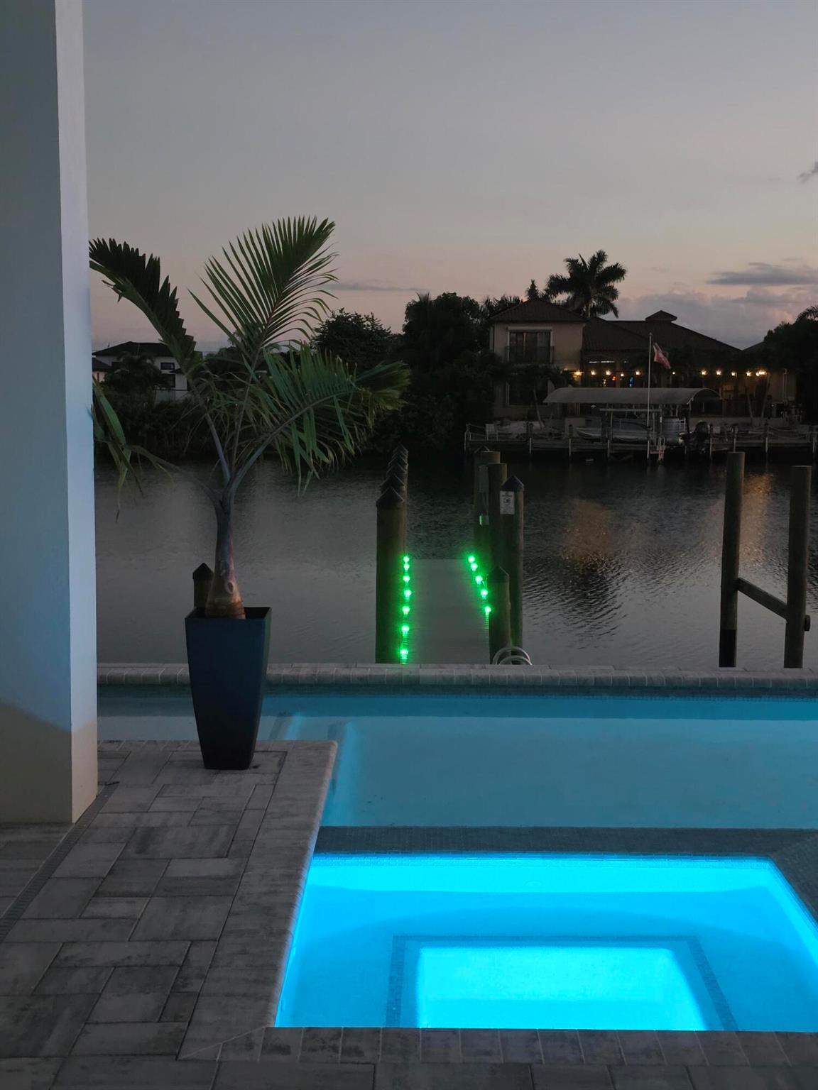 NEW CONSTRUCTION one-of-a-kind custom-designed home, not a builder's model. Featuring 3 bedrooms, 3 bathrooms, and a versatile den or office that can be used as a permitted fourth bedroom. The home overlooks a 260-foot-wide south-facing canal with no bridges to the Gulf. Dock with 2 slips. Inside, the home offers 2,653 square feet of open-concept living with 14ft. soaring ceilings and 10-foot impact sliders that lead to a nearly 800 square foot covered lanai. The outdoor space includes a summer kitchen, bar, and a large fully automated saltwater pool with custom spa and sun shelf, all controllable from your phone. The primary suite features a spa-inspired bath with dual vanities, seven-foot LED backlit mirrors, a soaking tub, and a double-entry his and her shower.