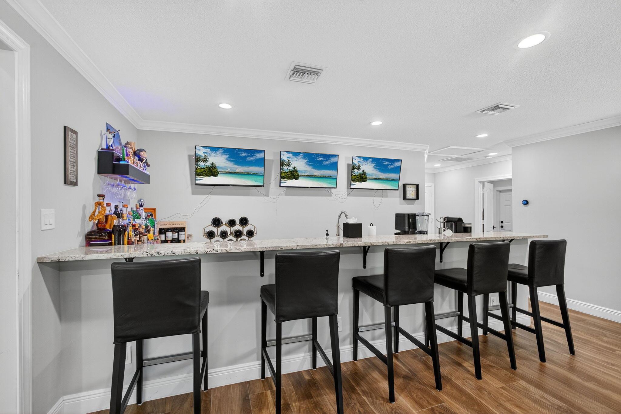 Rare Lakefront Estate on 1.3+ Acres - Fully Remodeled, No HOA!Seize this extraordinary opportunity to own a stunning 5-bedroom + office, lakefront home on a sprawling 1.3+ acre lot, free from HOA restrictions. This meticulously remodeled CBS-constructed residence blends luxury and functionality with top-of-the-line features. Enjoy peace of mind with impact glass windows, a new metal roof, and a secure front entry gate. The gourmet kitchen is a culinary masterpiece, boasting high-end appliances, custom cabinetry and oversized Island.The home's open-concept design showcases vaulted ceilings, creating an airy and grand atmosphere. Relax in the state-of-the-art movie theater w/ full Sports Bar or unwind by the brand-new 17x34 pool and Hot tub, complete with a fully equipped summer kitchen