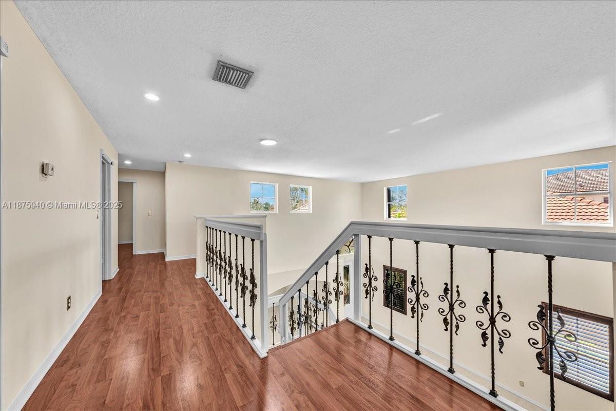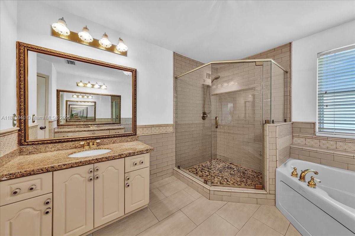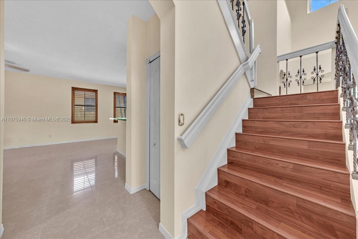 Welcome to this spacious 4-bedroom, 2.5-bath home located in a desirable gated community. The expansive kitchen with wood cabinetry seamlessly flows into the oversized family room, creating the perfect setting for entertaining or everyday living. Downstairs features elegant plantation shutters, while upstairs boasts impact windows and impact French doors both front and back for peace of mind. The primary suite offers a renovated bathroom with dual granite-top vanities and a frameless glass-enclosed shower. Neutral colors throughout and abundant windows allow natural light to flood the home, highlighting its open and inviting design.