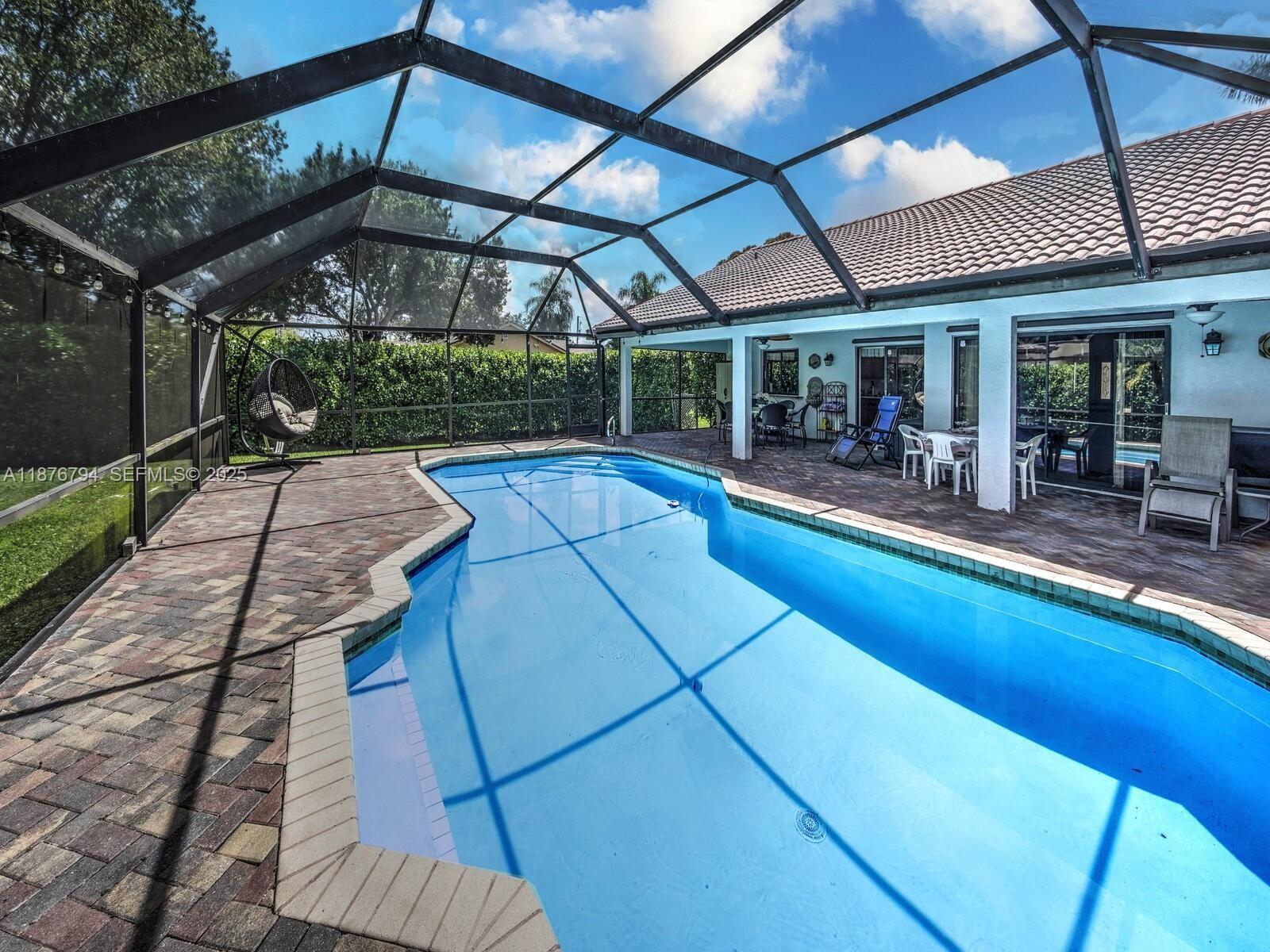 This beautiful 4 bedrooms and 2 bathrooms single-home features a bright eat-in kitchen with oak cabinets, spacious counter space, vaulted ceilings, a security system, and a recently remodeled bathroom. Perfect for families with children and pets, for entertainment and serene relaxation in a domed screened pool, surrounded by a beautiful landscape oasis. All living areas have access to the pool and deck. Covered patio area for barbequing with cool deck surface. Two-car garage, spacious living areas, and dining room. The perfect home for holiday gatherings or simply enjoying the Florida lifestyle in a great community. NO HOA