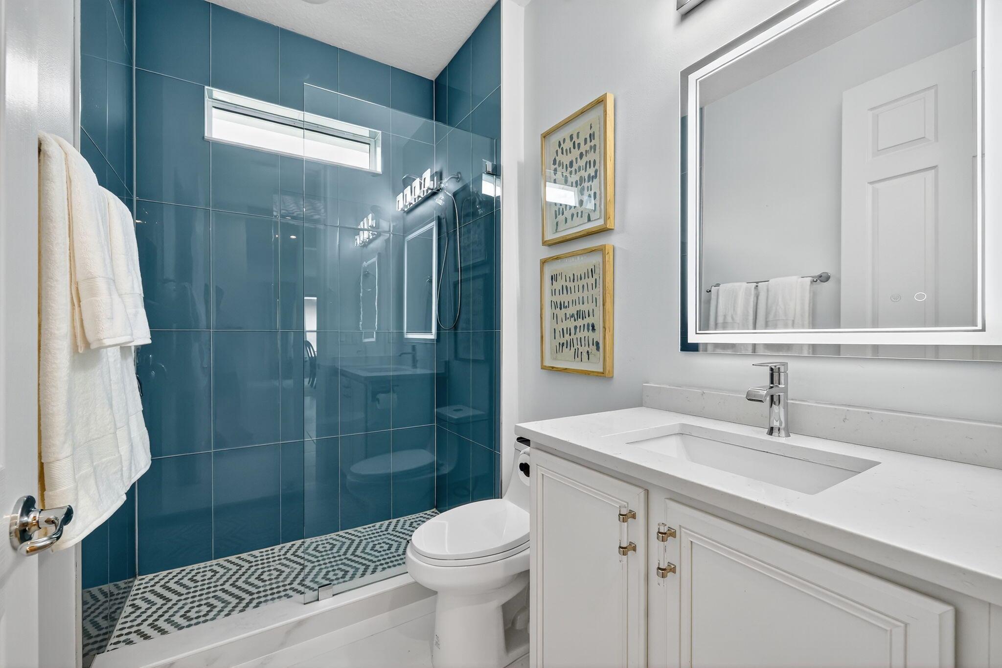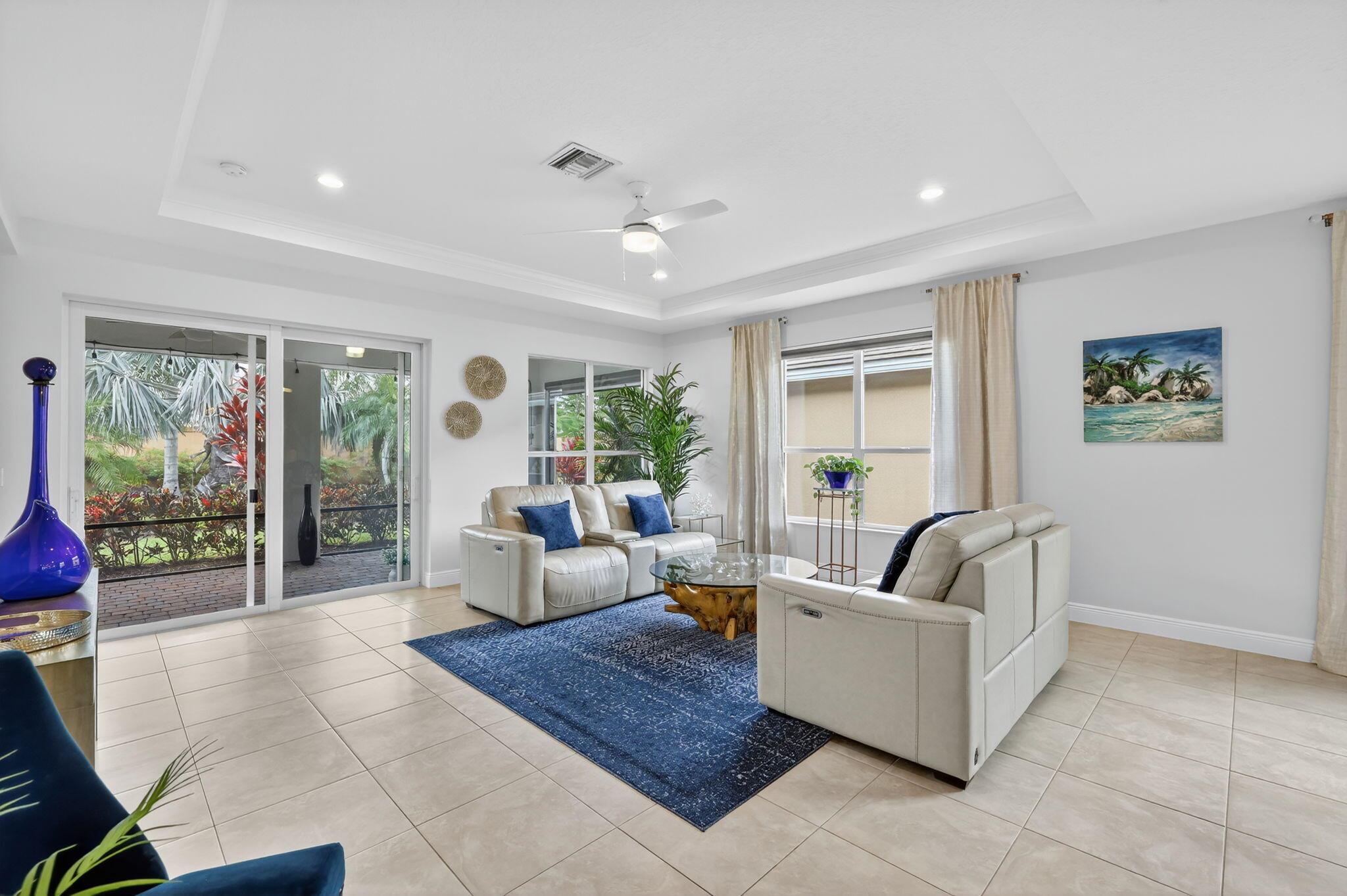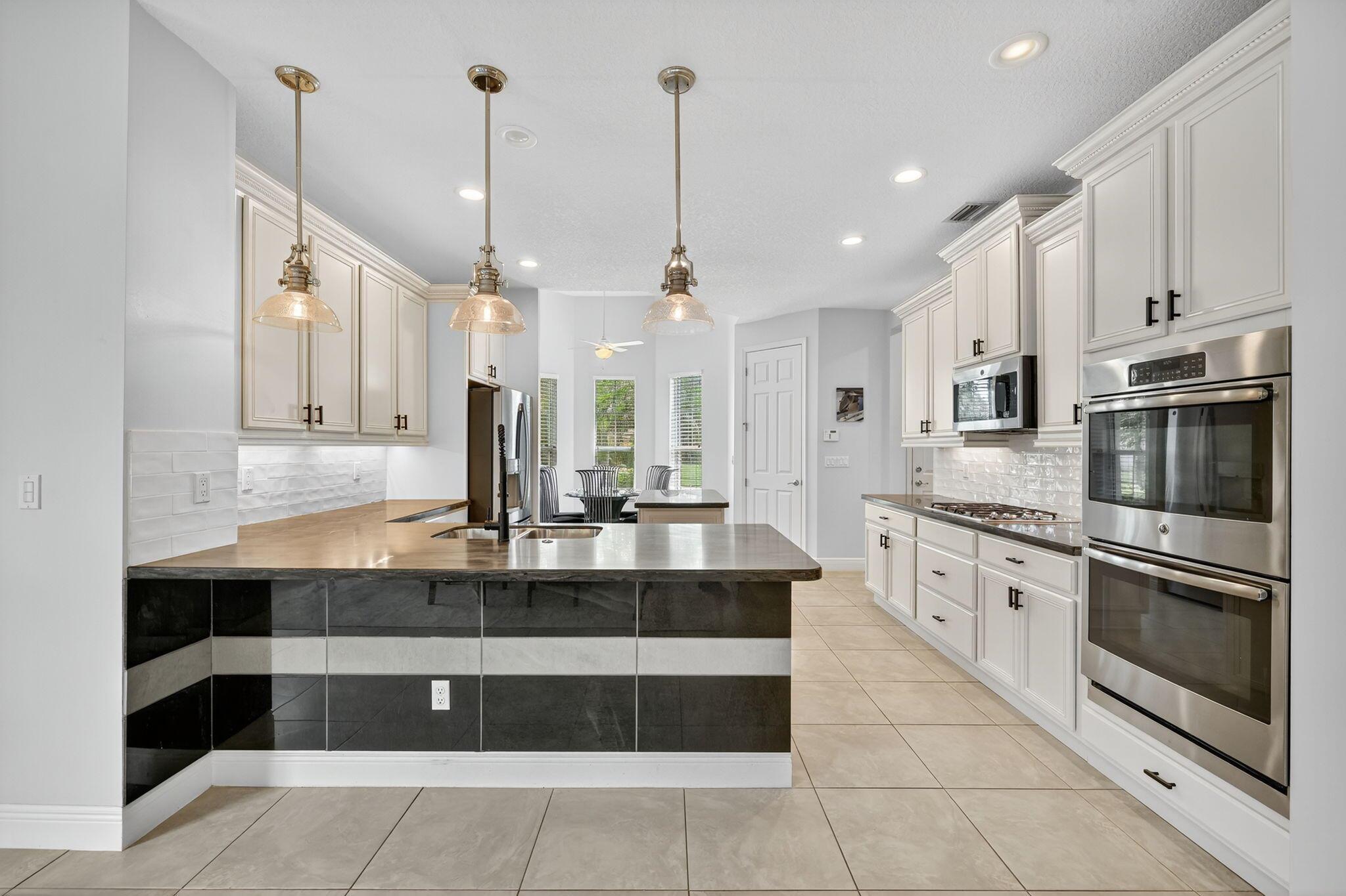 Reduced $50,000! Model-perfect true 3-bedroom, 2-bath home offering 2,262 sq. ft. of beautifully designed living space. The spacious eat-in kitchen features upgraded countertops, center island with breakfast bar, dual wall ovens, gas range, and a walk-in pantry--ideal for cooking and entertaining. The great room showcases elegant coffered ceilings and sliding glass doors that open to the covered lanai complete with an electric roll-down shade. Enjoy a private backyard with no neighbors behind, plus hurricane impact glass throughout for year-round security and peace of mind. The primary suite offers coffered ceilings, a massive walk-in closet, and a stunning remodeled bathroom featuring a large walk-in shower and double vanities. Located in Vitalia at Tradition, a premier 55+ active lifesty