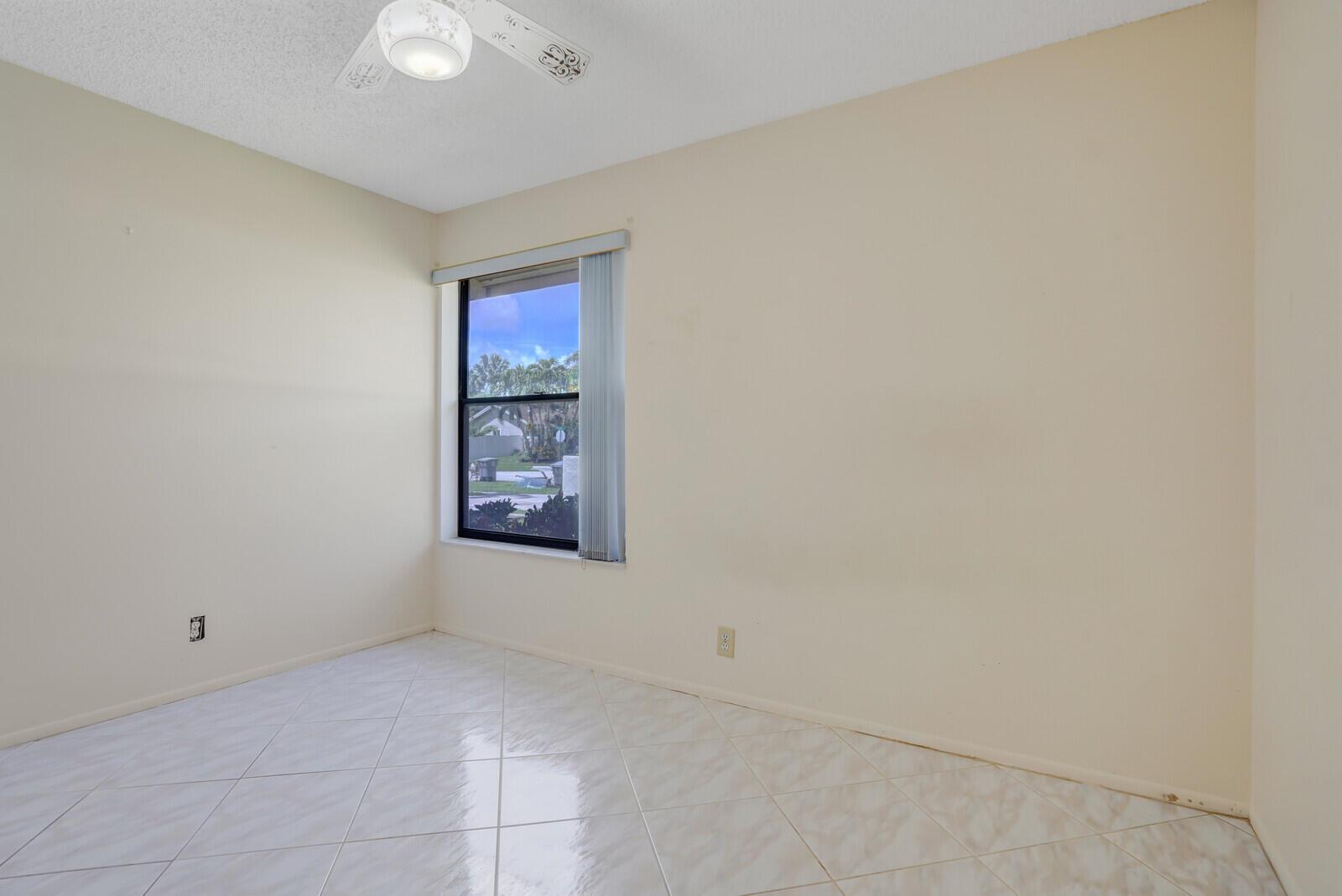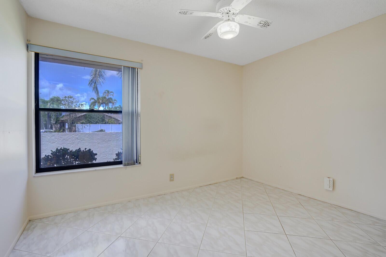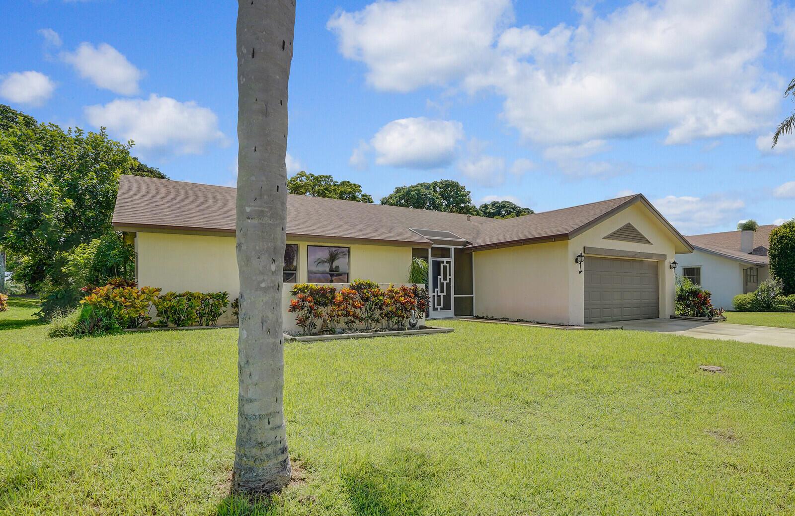 Incredible VALUE! Superb views are seen from this 'RARE'' 3-bedroom, 2-bath, 2-car garage, PLUS BONUS ROOM DEN/OFFICE, (can easily become a 4th BEDROOM by adding a closet) one-story single-family home directly on the Palm Beach County Southwinds Golf course. Large and private backyard with a covered and screened patio almost the full width of the home! The roof was installed 7/17/2020, A/C installed 9/14/2024 and upgraded kitchen cabinets with solid surface countertops. Living areas are fully tiled! INCREDIBLY LOW HOA just $75 MONTHLY. Newly upgraded community lighted amenities include pool, Gathering place, playground area, tennis, pickleball and basketball courts. Highly rated schools. No membership or dues required to play on the Palm Beach County Golf Course. Just pay and play