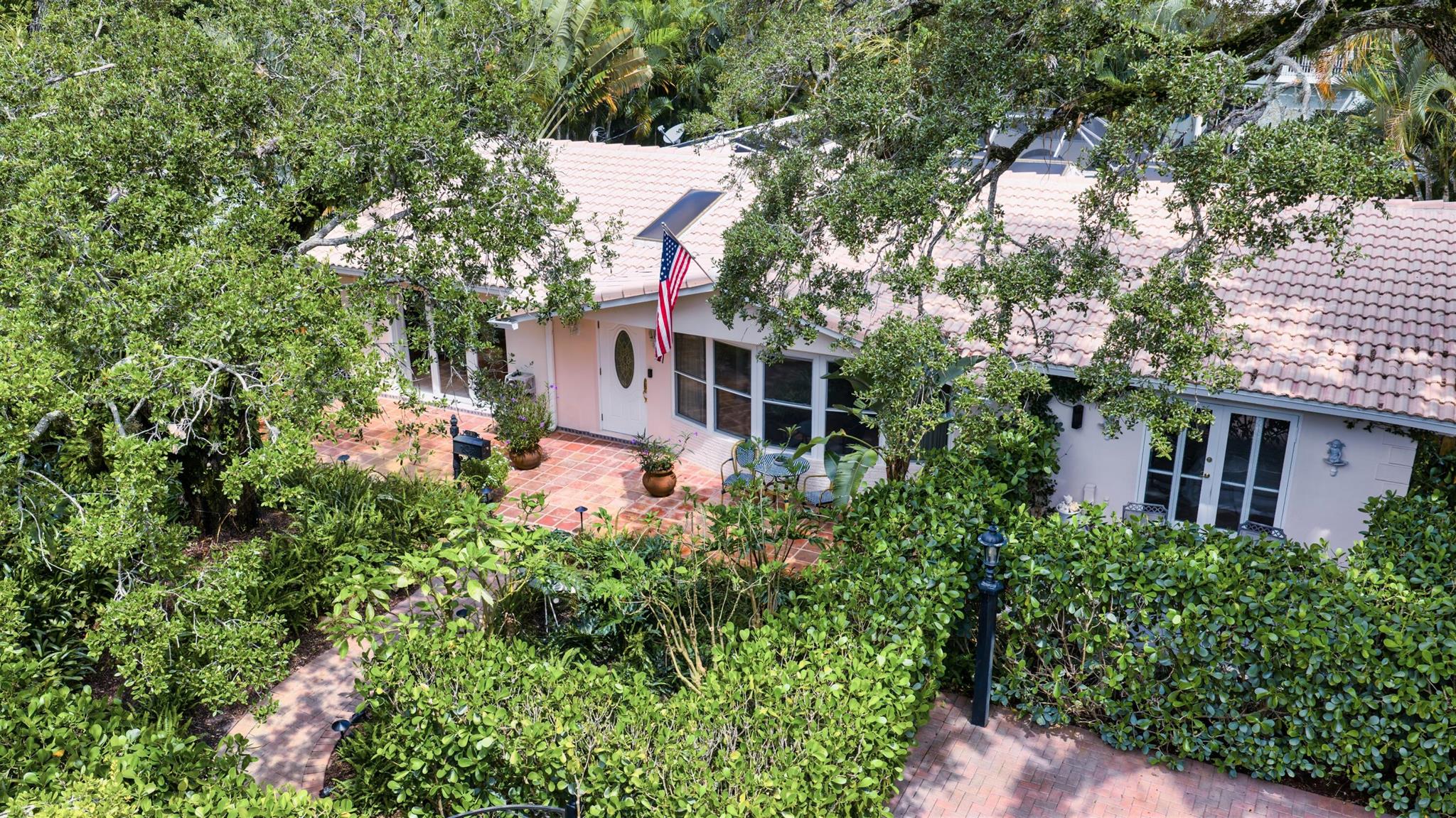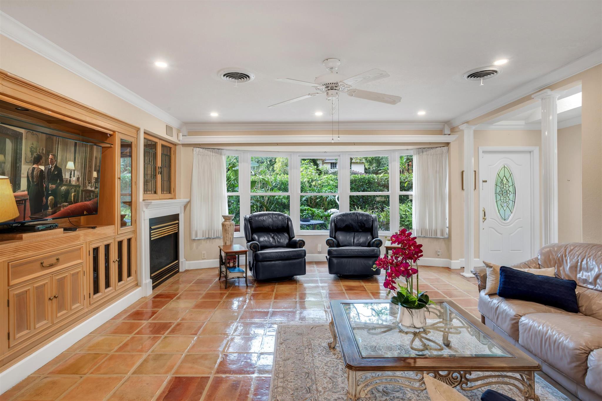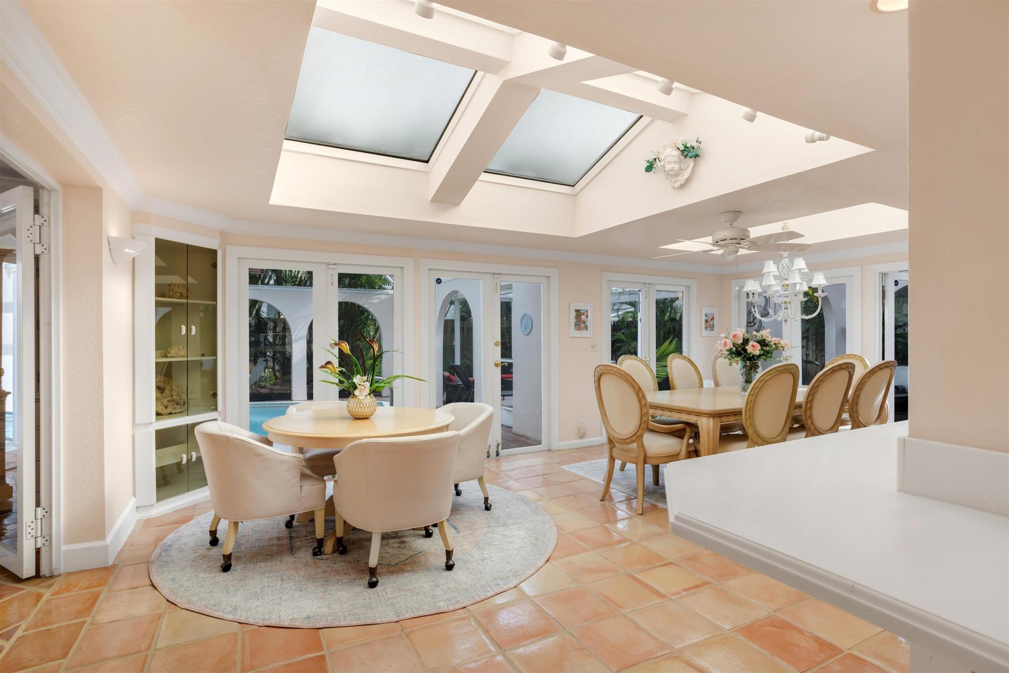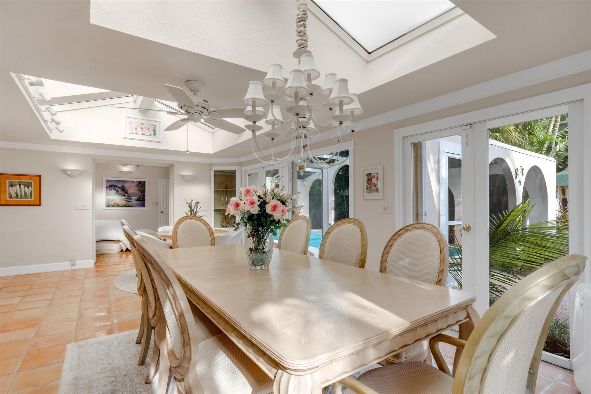 In an exquisite setting and radiating the charm of its era, this beautifully maintained residence is ideal for embracing South Florida's coveted lifestyle. With three bedrooms and 2,408+/- total square feet, its well-conceived floor plan was designed to optimize garden and pool views, seamlessly blending indoor and outdoor spaces. Details throughout include skylights making the interiors light and bright, custom built-in cabinetry, handsome moldings and clay-tile flooring. In the living room, a bay window overlooks the front gardens, while a fireplace adds a welcoming cordiality. The dining area comprises two areas, both defined by skylights and featuring French doors accessing the pool terrace. Just adjacent, the kitchen is fitted with cerused-wood cabinetry, mirrored backsplashes and a p