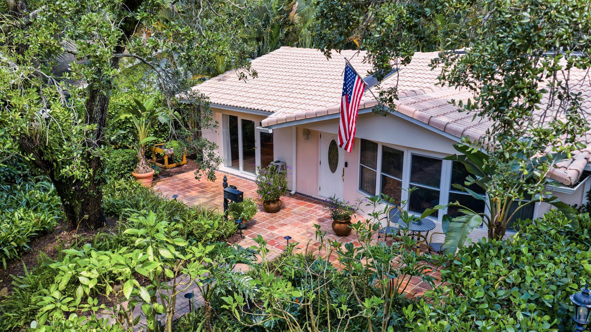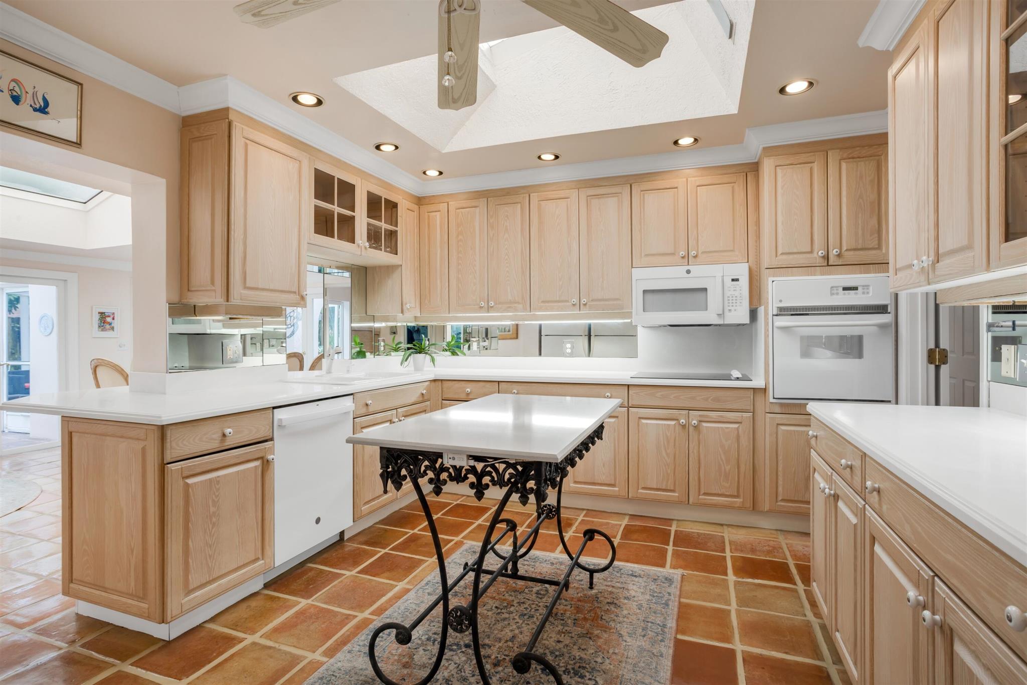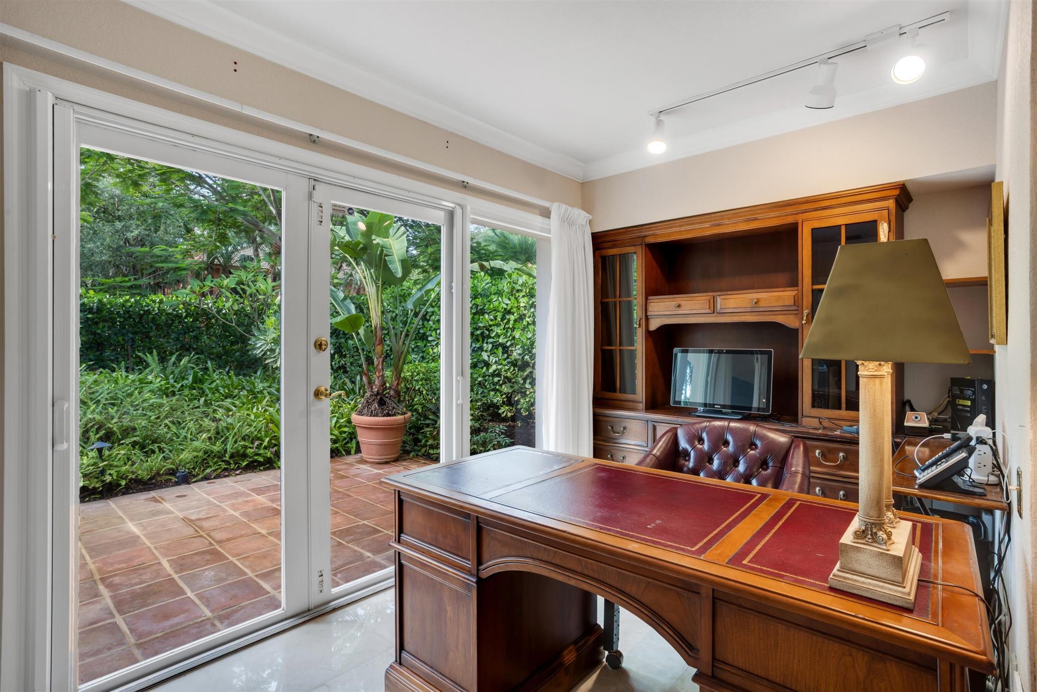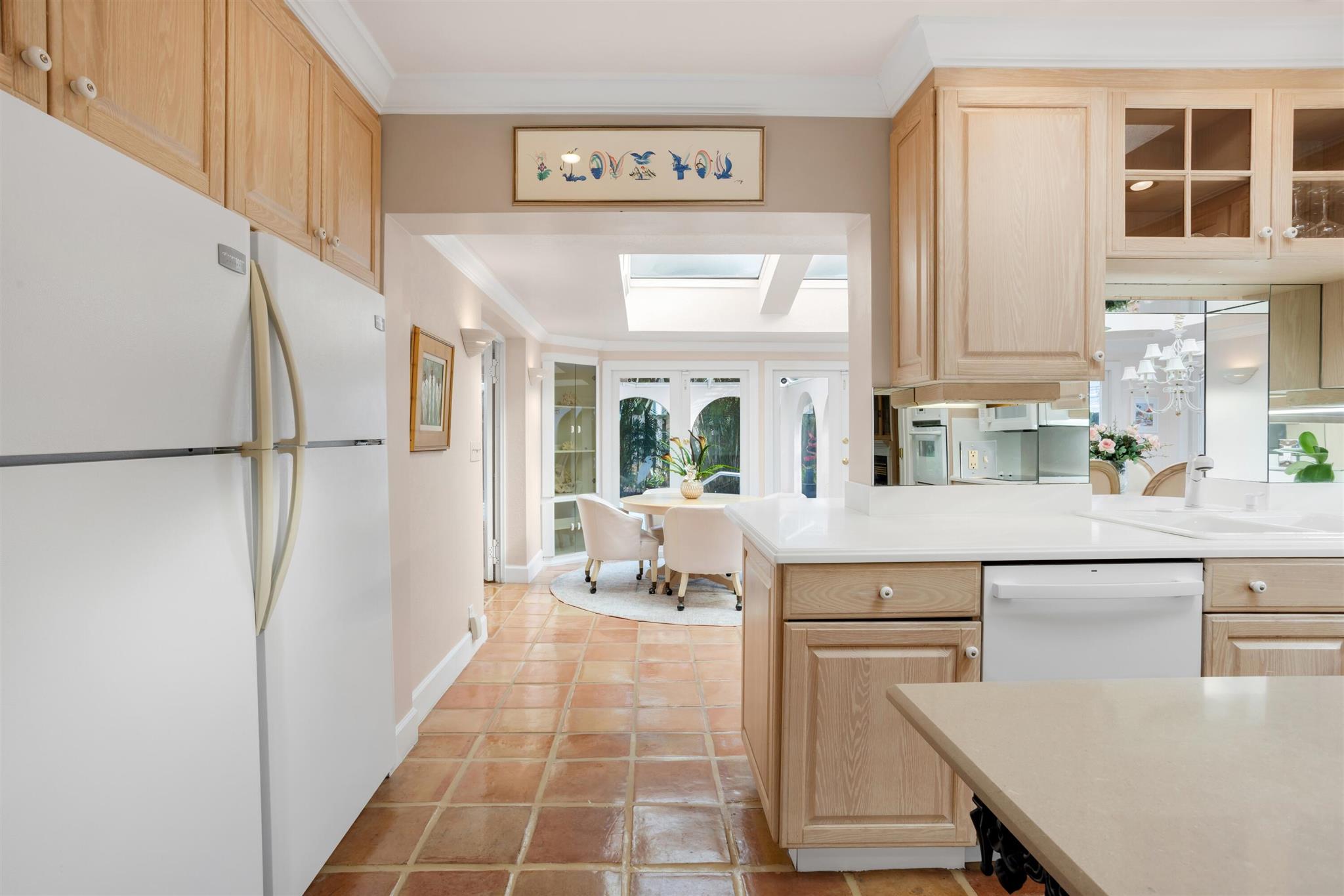 In an exquisite setting and radiating the charm of its era, this beautifully maintained residence is ideal for embracing South Florida's coveted lifestyle. With three bedrooms and 2,408+/- total square feet, its well-conceived floor plan was designed to optimize garden and pool views, seamlessly blending indoor and outdoor spaces. Details throughout include skylights making the interiors light and bright, custom built-in cabinetry, handsome moldings and clay-tile flooring. In the living room, a bay window overlooks the front gardens, while a fireplace adds a welcoming cordiality. The dining area comprises two areas, both defined by skylights and featuring French doors accessing the pool terrace. Just adjacent, the kitchen is fitted with cerused-wood cabinetry, mirrored backsplashes and a p