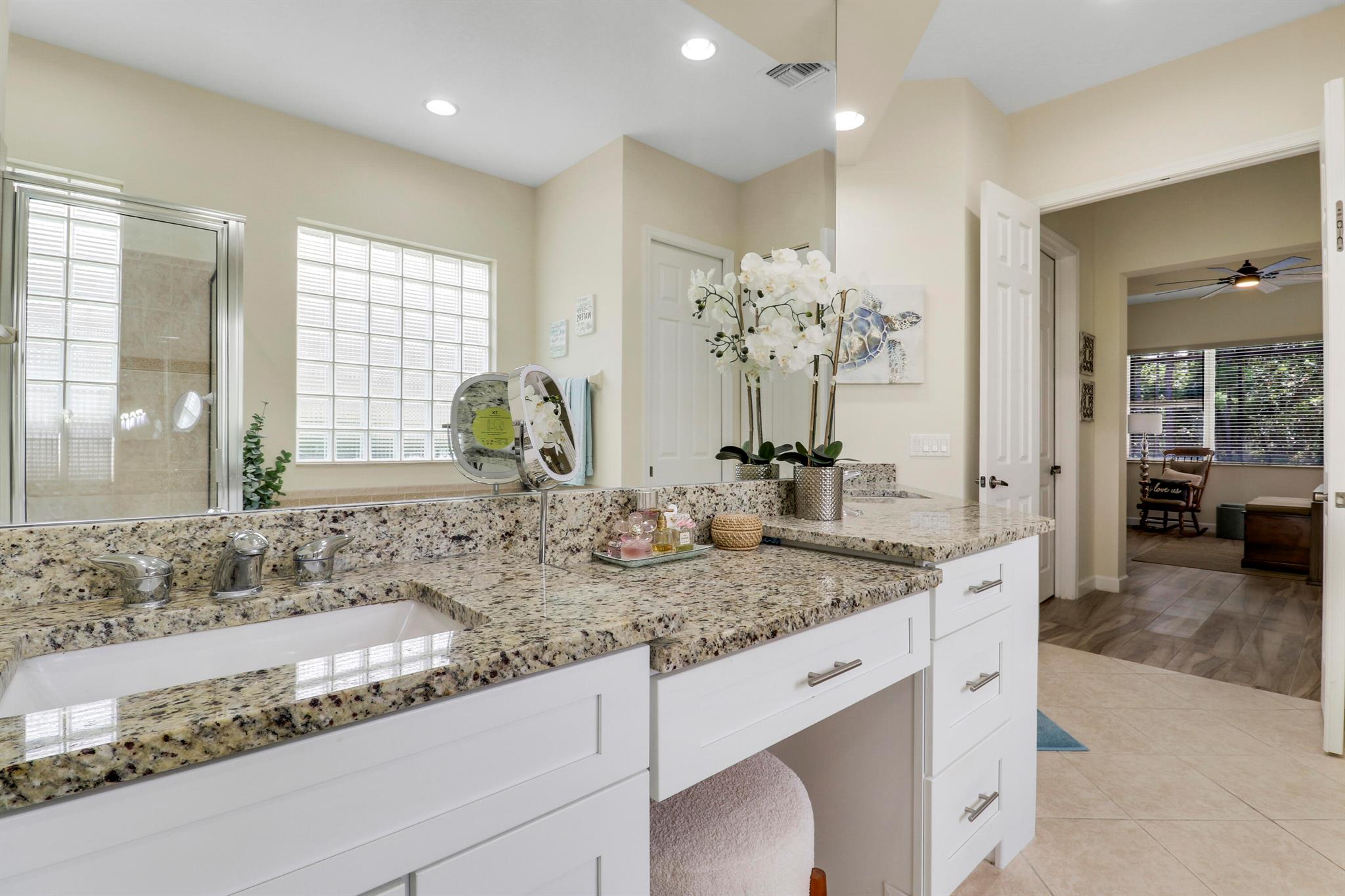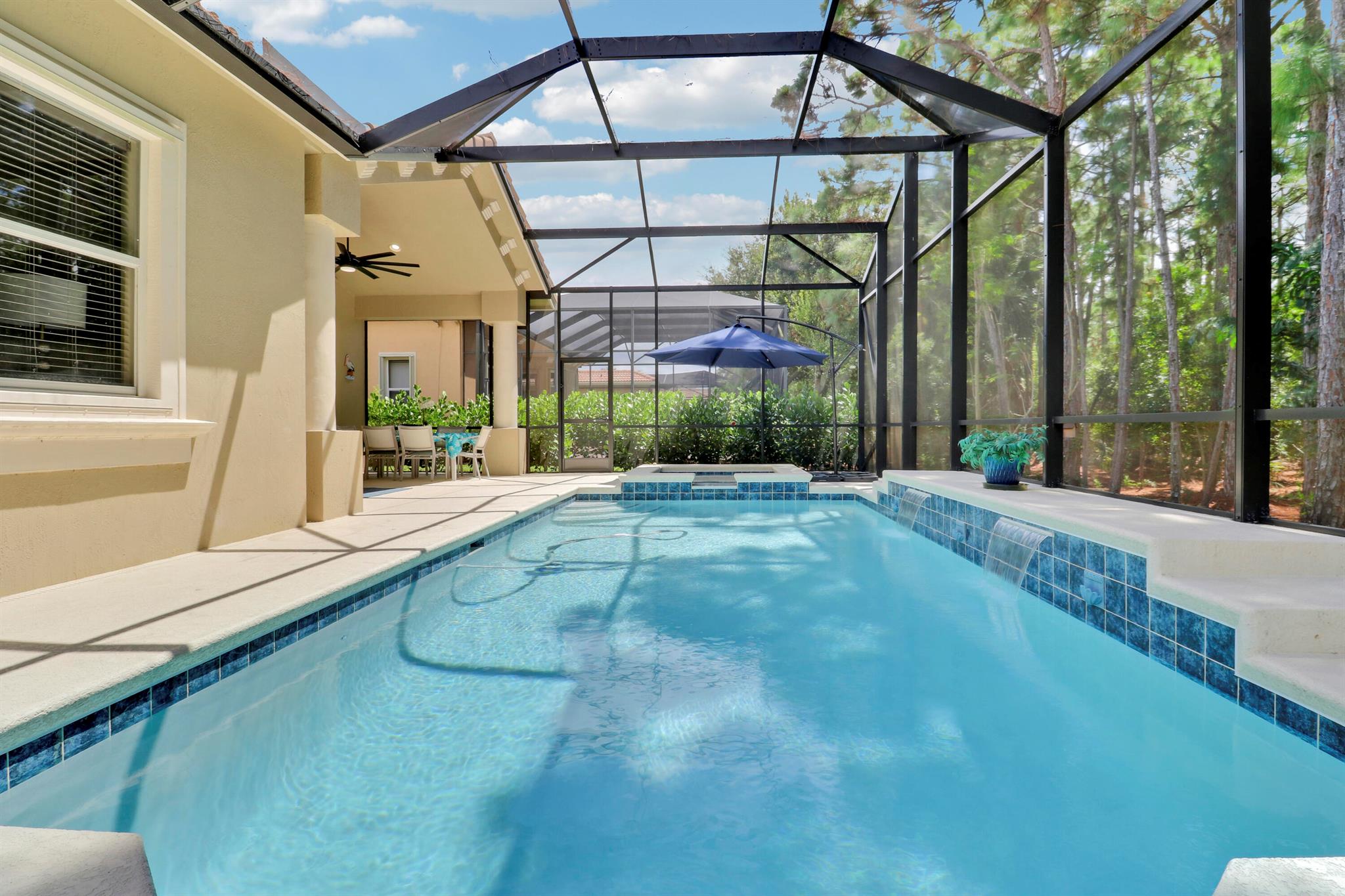 WELCOME HOME! Popular Fairview plan in PGA Village w/ NEW 2024 SALTWATER POOL & SPA! This 2BR+Den/2BA/2CG home has an open floor plan ideal for entertaining & modern living. Special features include tile flooring throughout, decorative glass entry front door, neutral interior paint, new refrigerator, washer, dryer and water heater, vaulted ceilings, updated cabinetry and more. The spacious kitchen features gray cabinetry, granite counters, tile backsplash, SS appliances, pantry closet and breakfast bar. Master Suite has large walk-in closets and a spa like ensuite w/ soaking tub, walk in shower and large vanity w/ dual sinks. The guest bedroom and den are both close to the hall bathroom. Spacious laundry room leads to the garage. The star of the show is the NEW POOL & SPA, built in 2024.