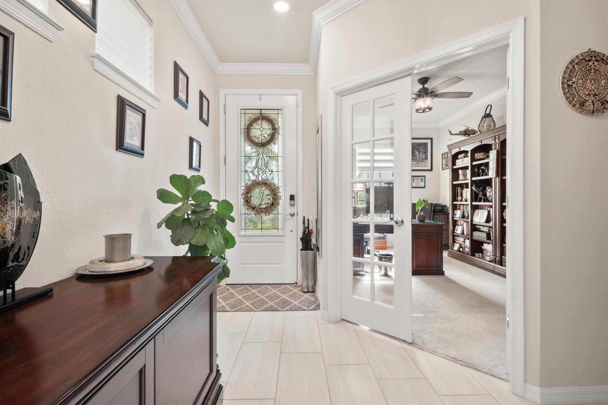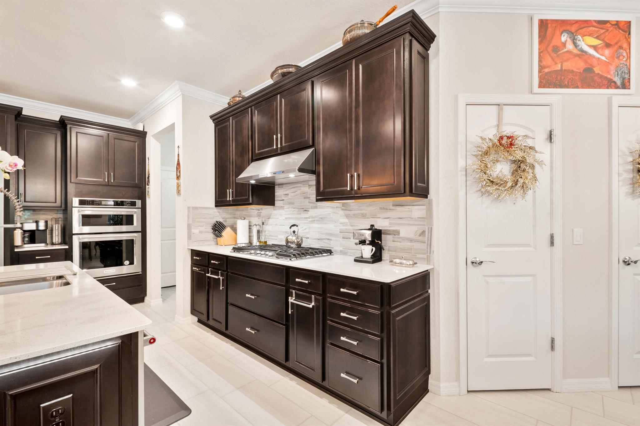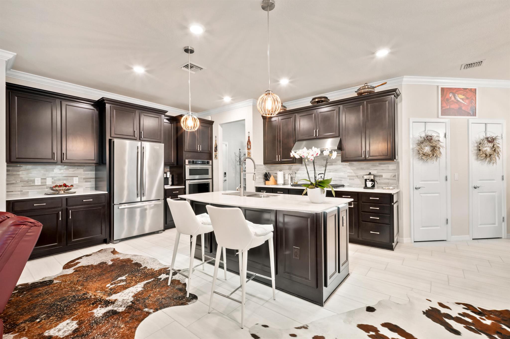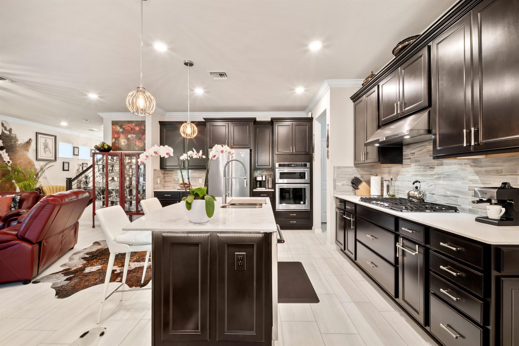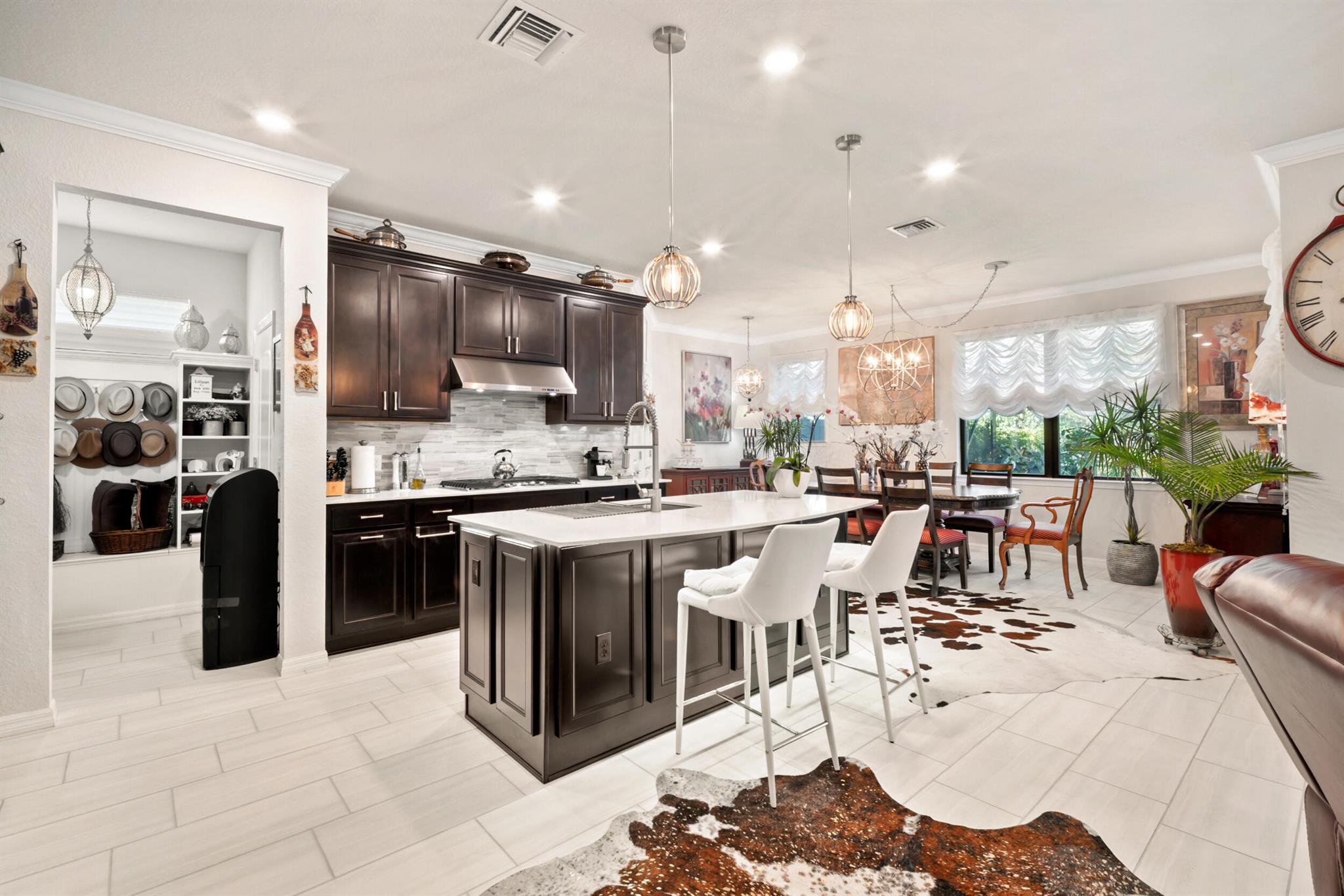 Located in the highly desirable gated community of The Fields, this beautifully customized two-story residence combines modern luxury with thoughtful design. Featuring 3 bedrooms, a dedicated den/office, 2.5 bathrooms, and an upstairs loft, this home offers flexible living spaces ideal for both everyday comfort and entertaining.From the moment you enter through the custom impact-resistant stained glass door, you'll be welcomed into a light-filled, open-concept layout. The centerpiece of the home is the chef-inspired kitchen, equipped with solid wood cabinetry, quartz countertops, a gas range, high-end appliances, and a spacious center island perfect for gathering and hosting. With three separate pantries, an adjacent mudroom, and a functional flow to