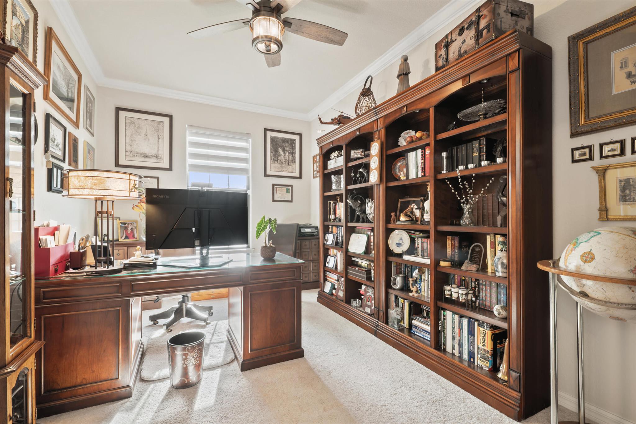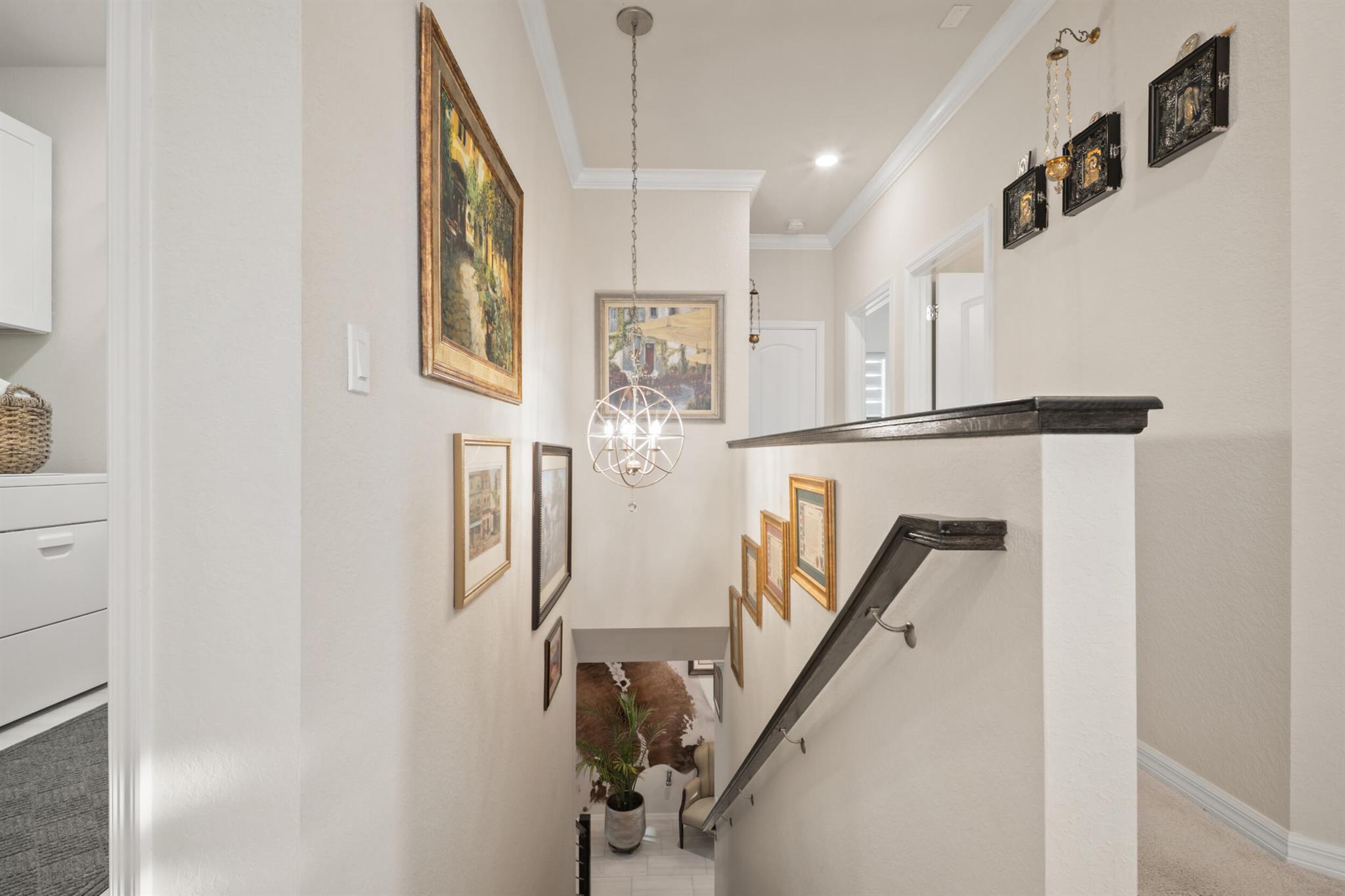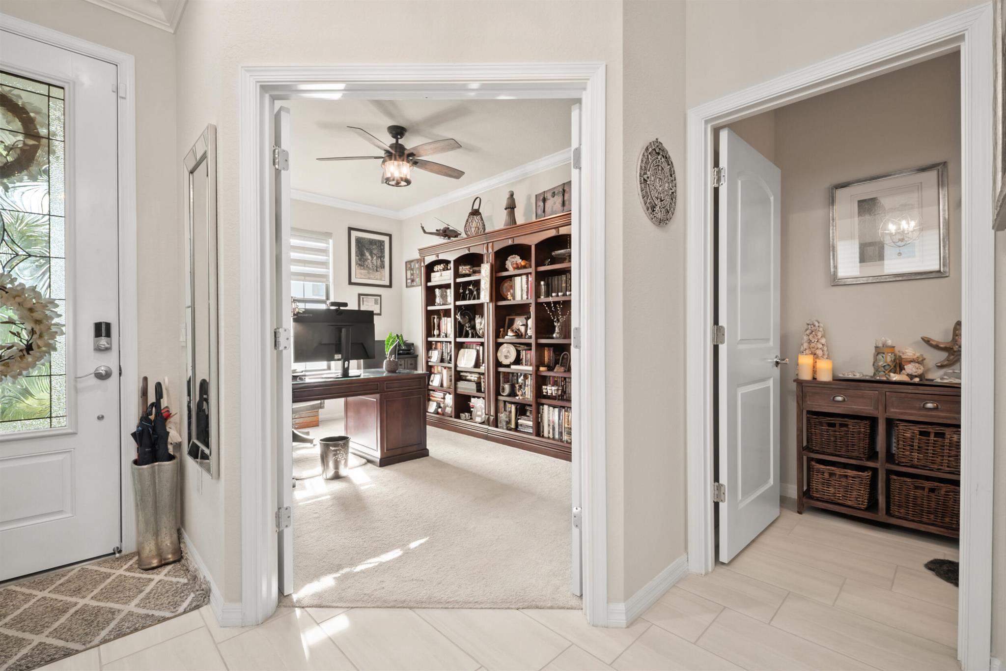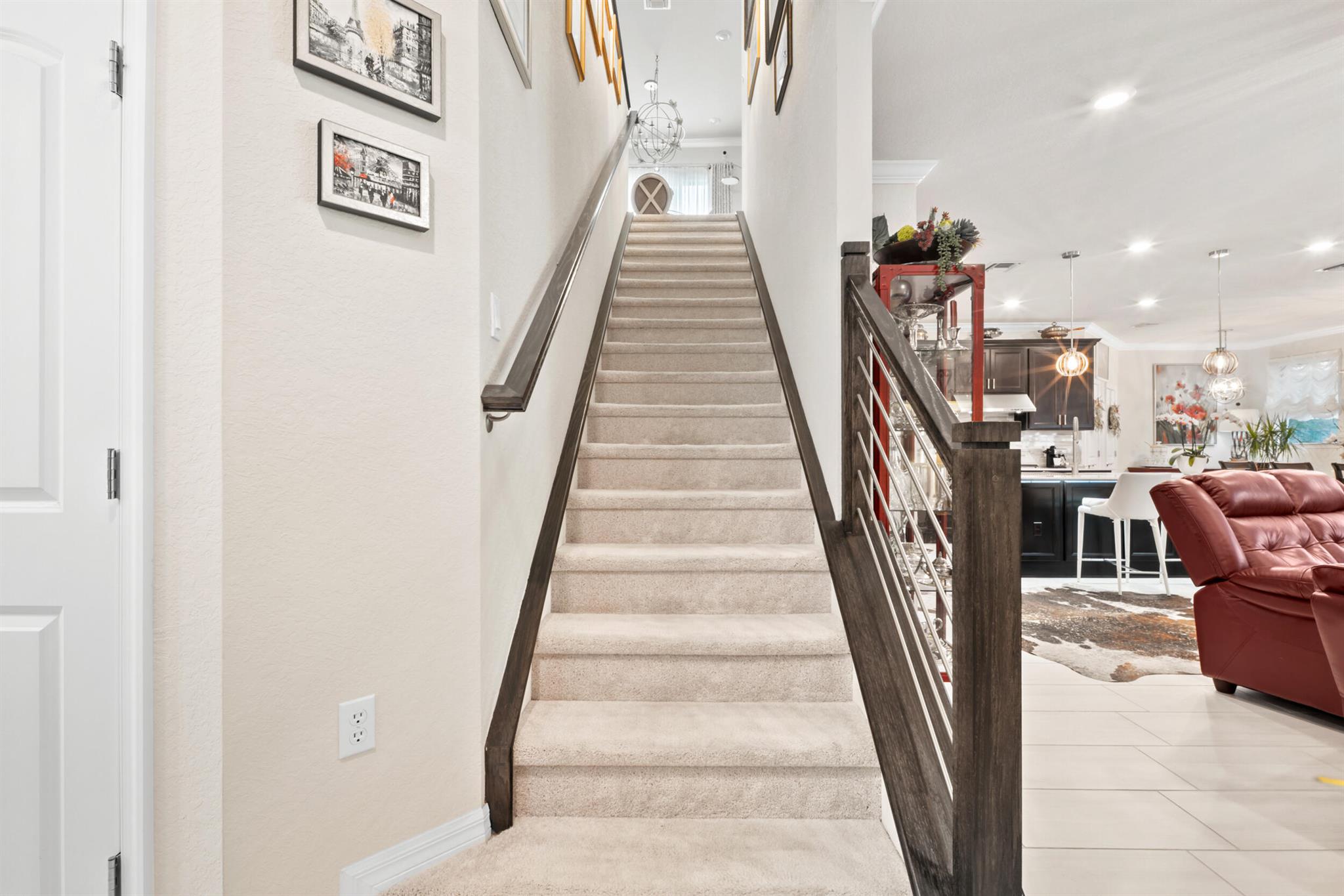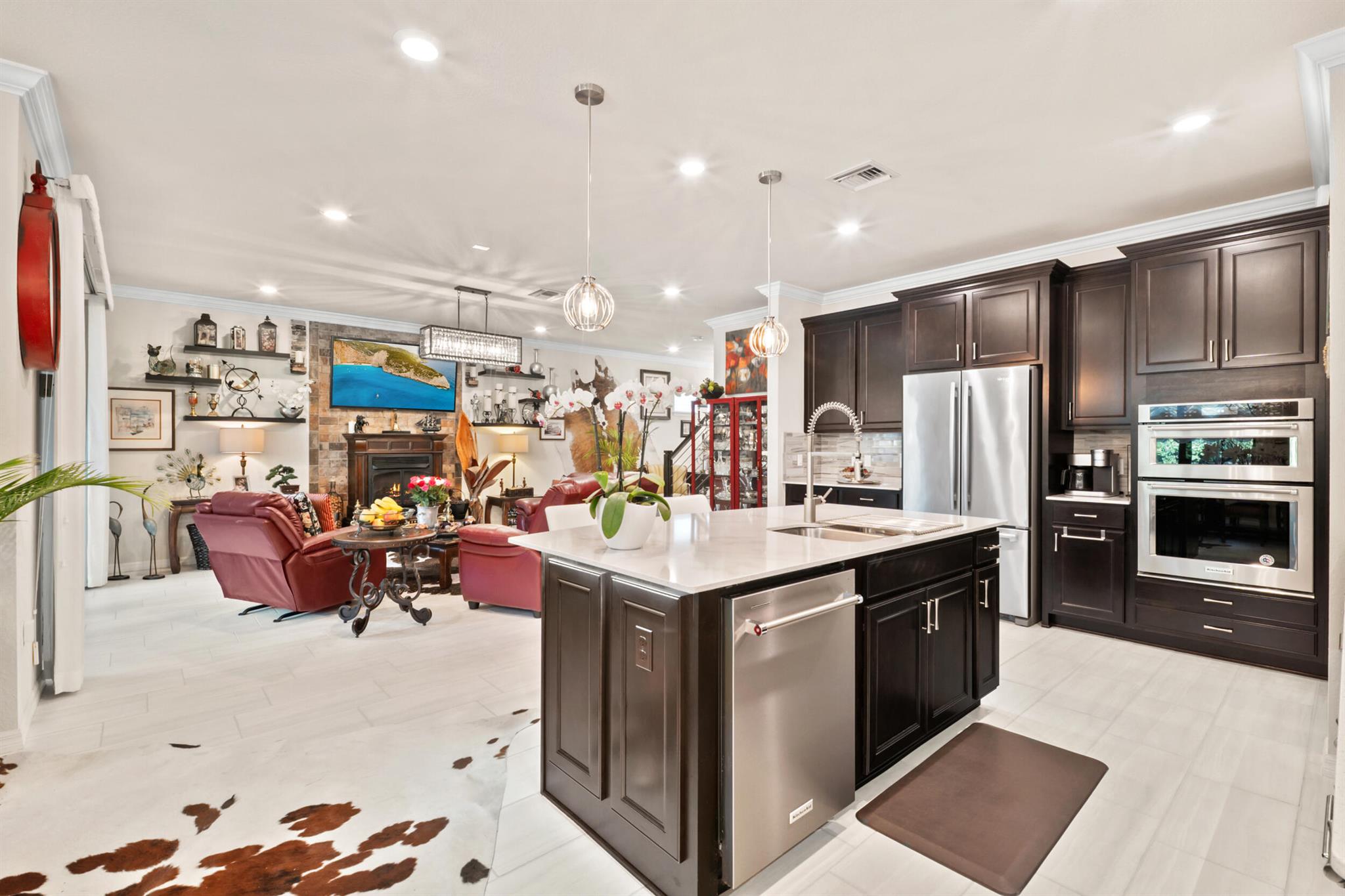 Located in the highly desirable gated community of The Fields, this beautifully customized two-story residence combines modern luxury with thoughtful design. Featuring 3 bedrooms, a dedicated den/office, 2.5 bathrooms, and an upstairs loft, this home offers flexible living spaces ideal for both everyday comfort and entertaining.From the moment you enter through the custom impact-resistant stained glass door, you'll be welcomed into a light-filled, open-concept layout. The centerpiece of the home is the chef-inspired kitchen, equipped with solid wood cabinetry, quartz countertops, a gas range, high-end appliances, and a spacious center island perfect for gathering and hosting. With three separate pantries, an adjacent mudroom, and a functional flow to