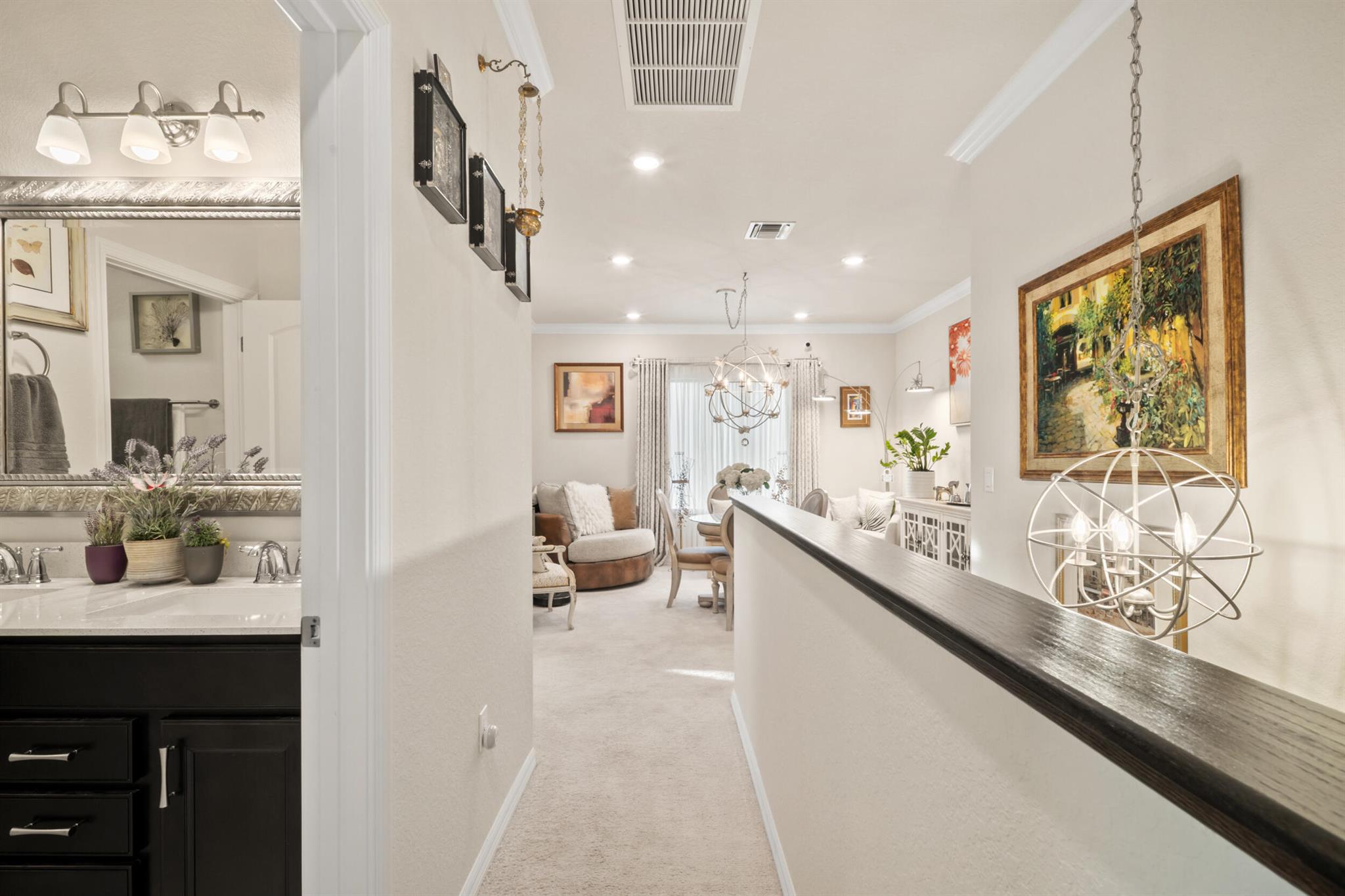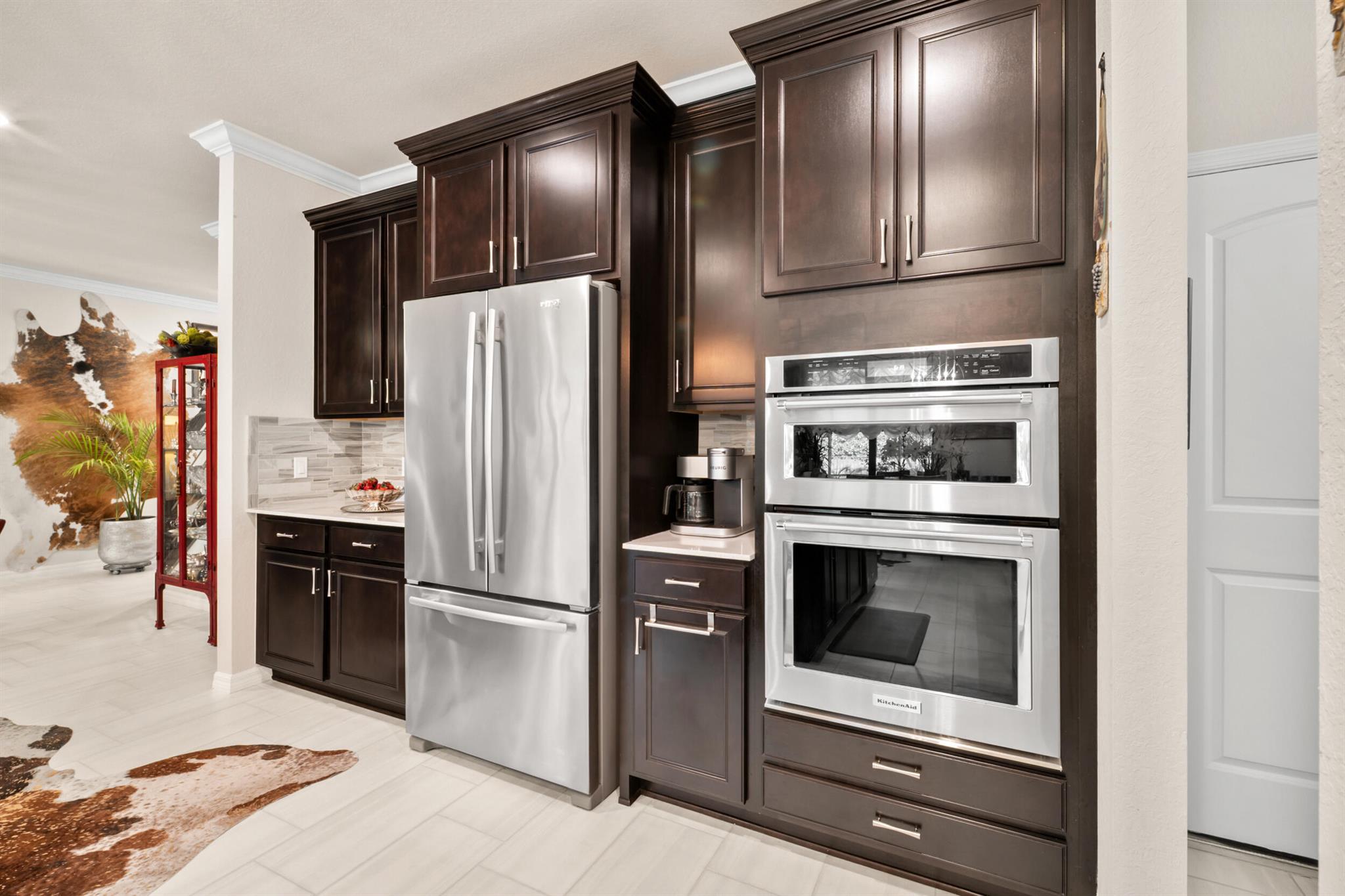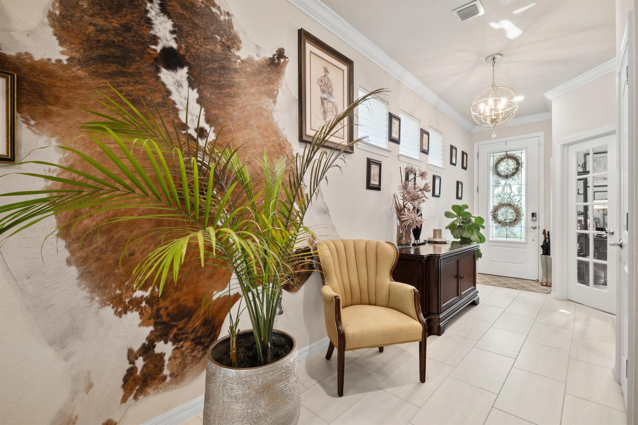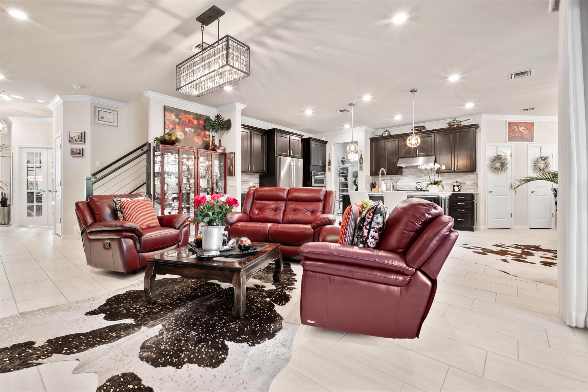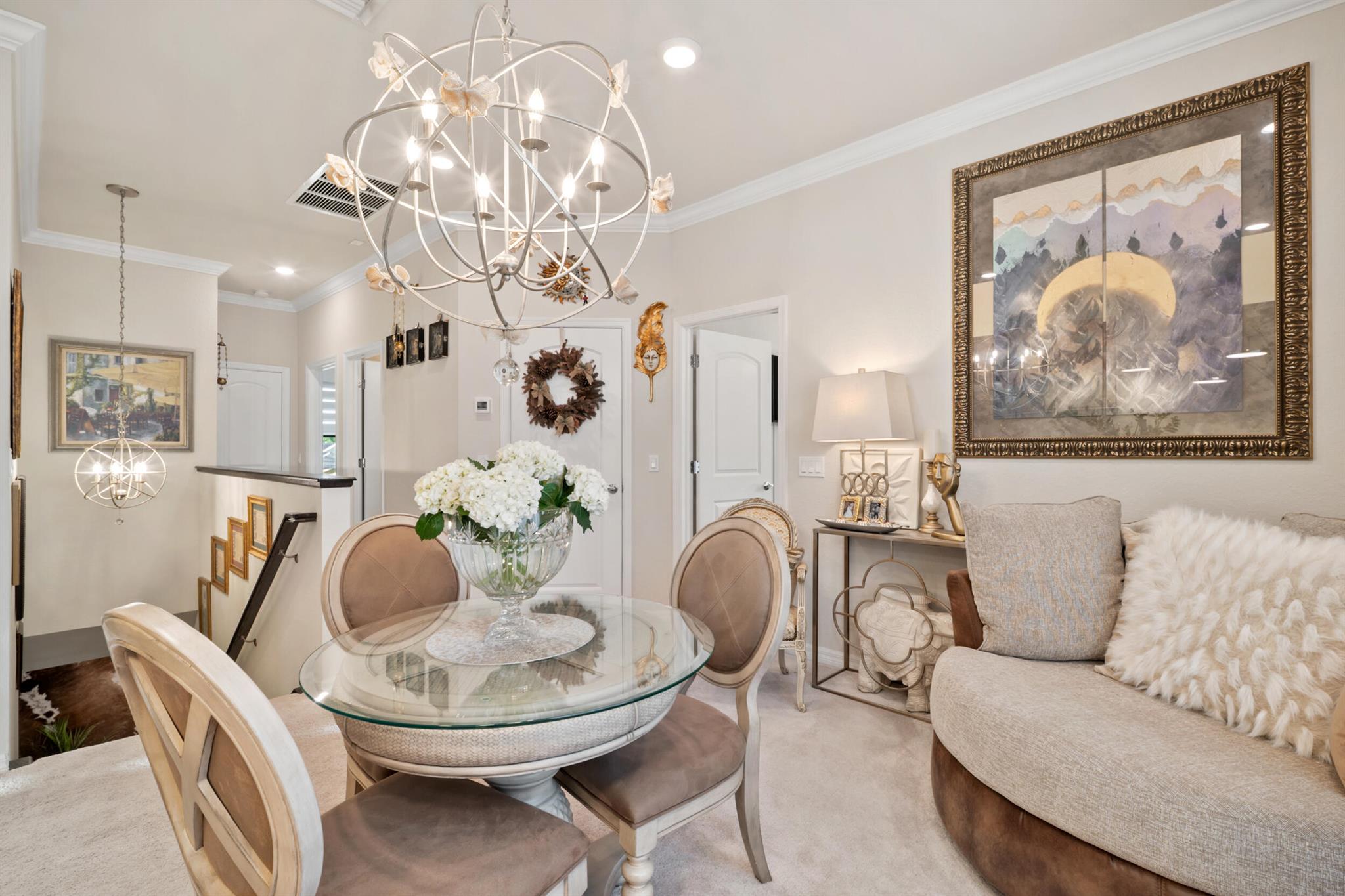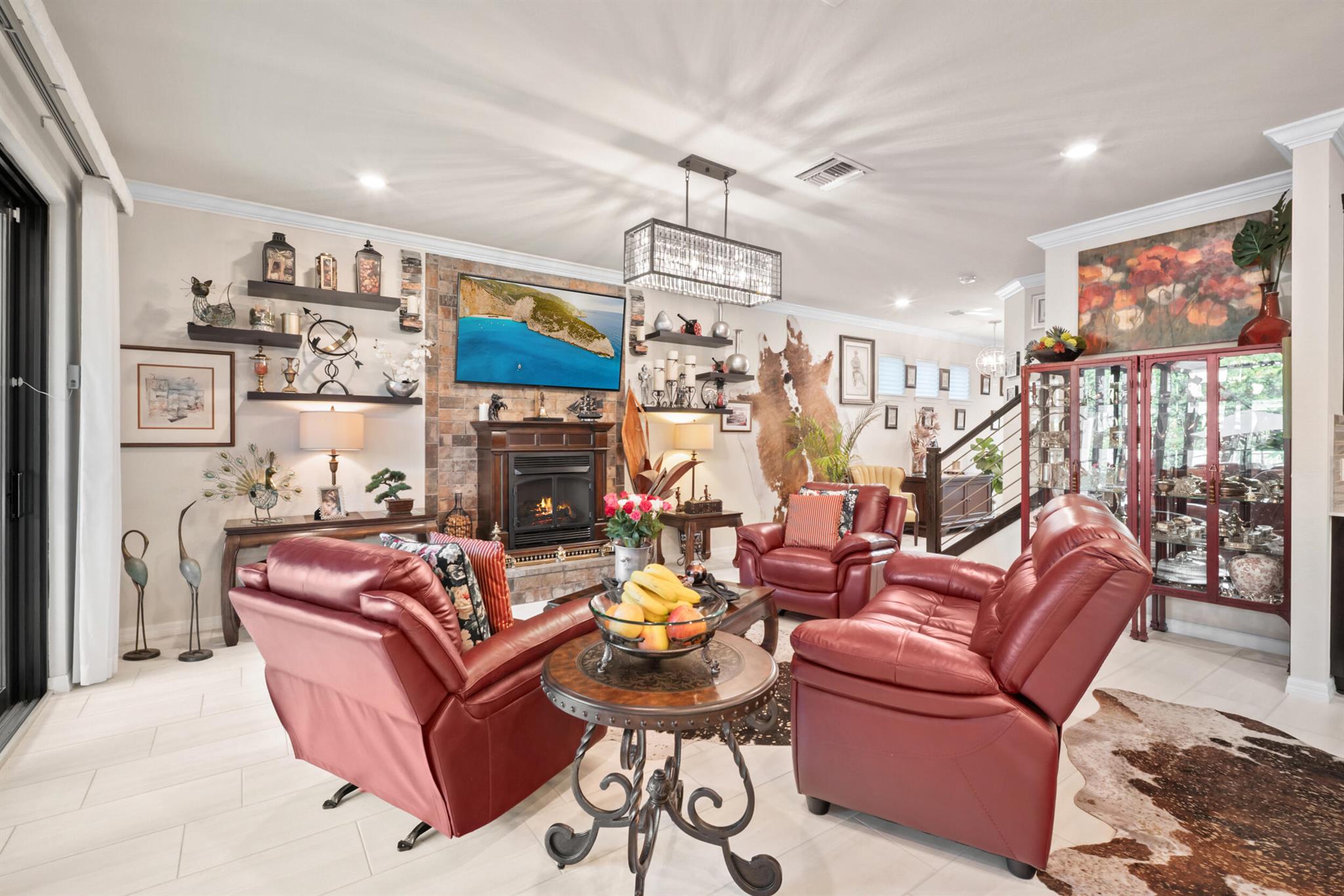 Located in the highly desirable gated community of The Fields, this beautifully customized two-story residence combines modern luxury with thoughtful design. Featuring 3 bedrooms, a dedicated den/office, 2.5 bathrooms, and an upstairs loft, this home offers flexible living spaces ideal for both everyday comfort and entertaining.From the moment you enter through the custom impact-resistant stained glass door, you'll be welcomed into a light-filled, open-concept layout. The centerpiece of the home is the chef-inspired kitchen, equipped with solid wood cabinetry, quartz countertops, a gas range, high-end appliances, and a spacious center island perfect for gathering and hosting. With three separate pantries, an adjacent mudroom, and a functional flow to