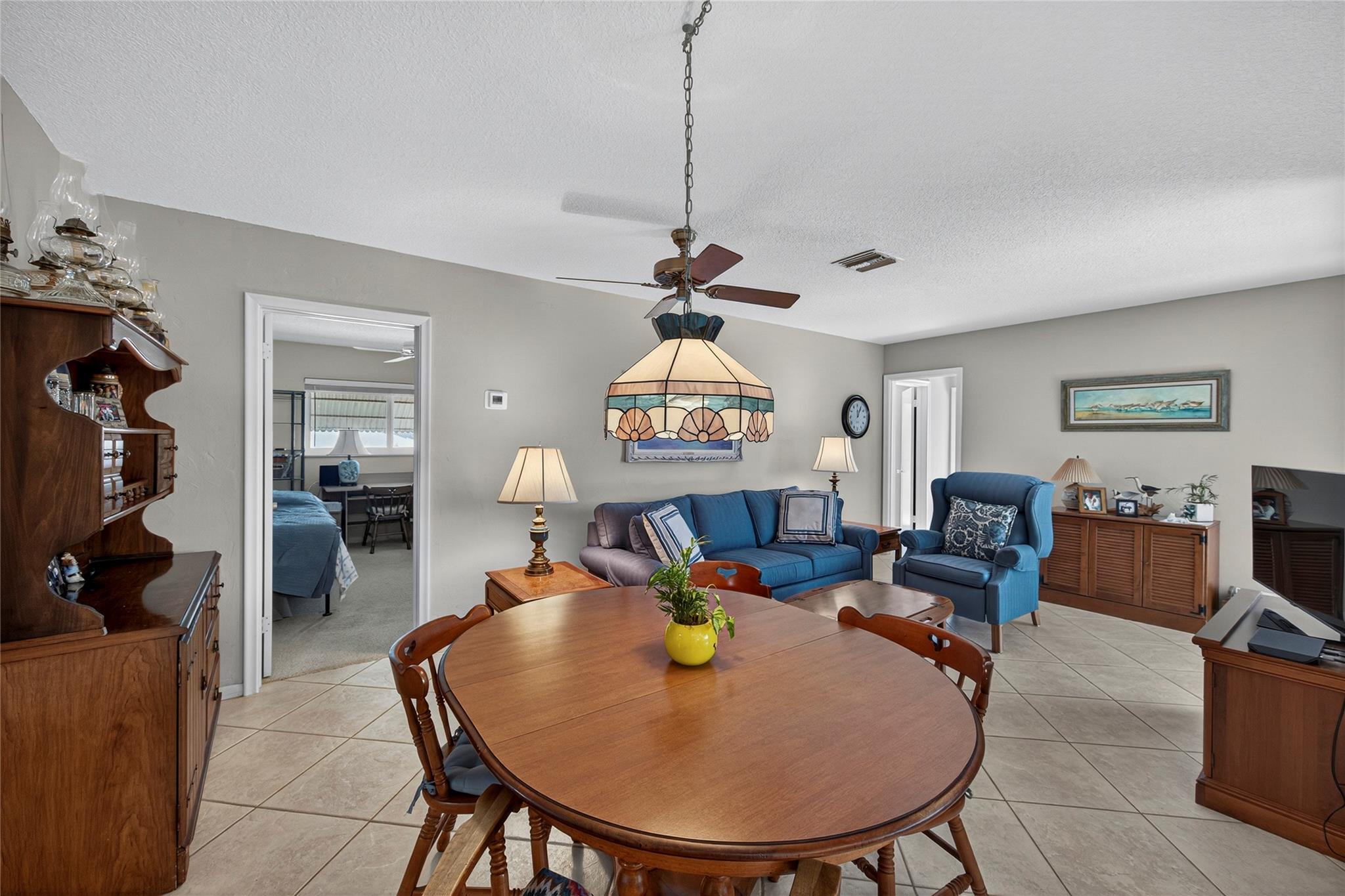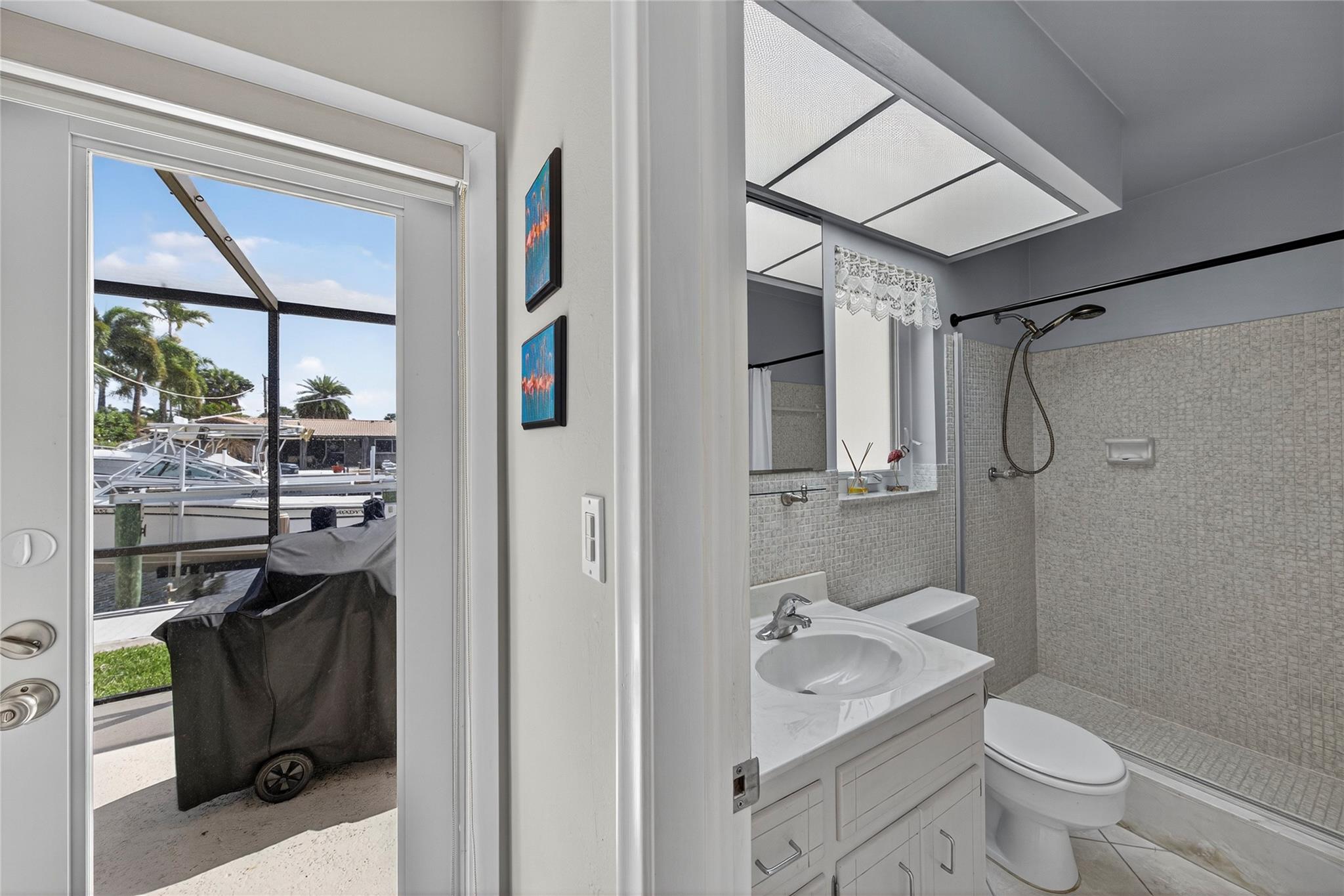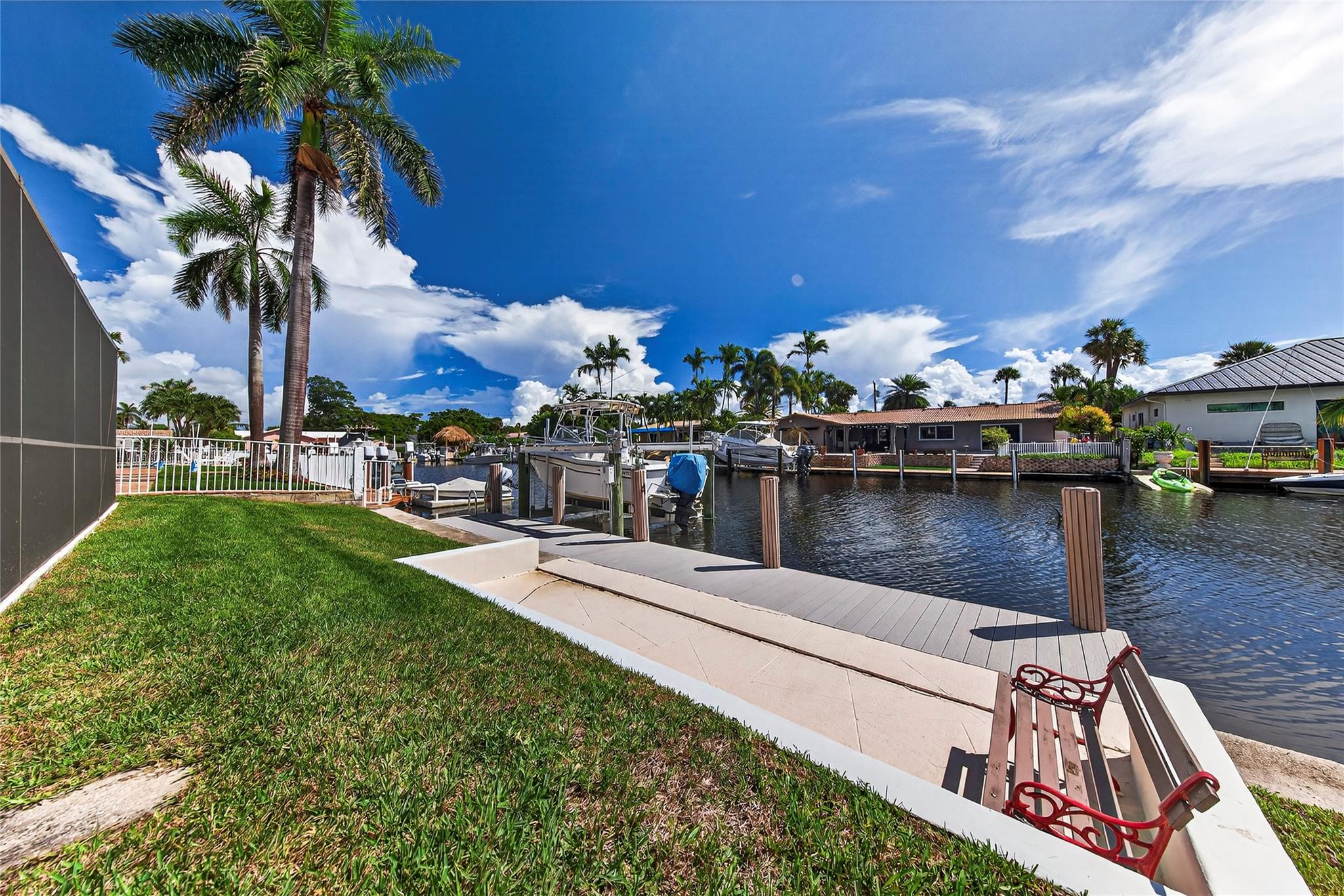 Well maintained 4 bedroom home with 2 original bathrooms, 2 car garage, screened pool and 80 feet of water frontage, one fixed bridge to ICW. Dock is composite and includes boat lift. Roof recently replaced in 2024, split package A/C units. Interior & exterior electric panels updated 2018 including generator hookup. Impact windows and doors. Kitchen is older but not original, opens to family room. Formal dining room in living room. Fourth bedroom connects to primary suite, ideal as an office, gym or nursery.