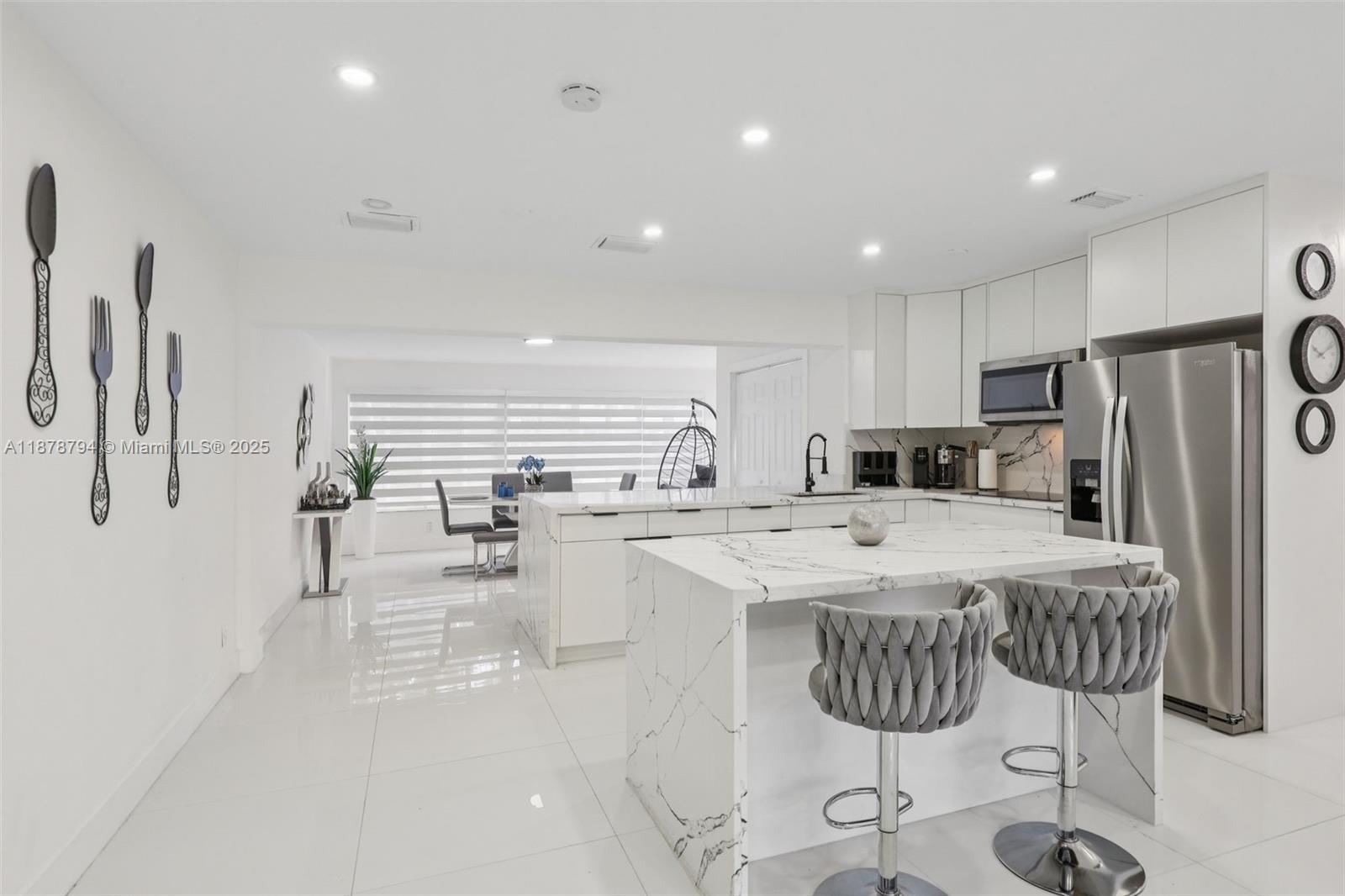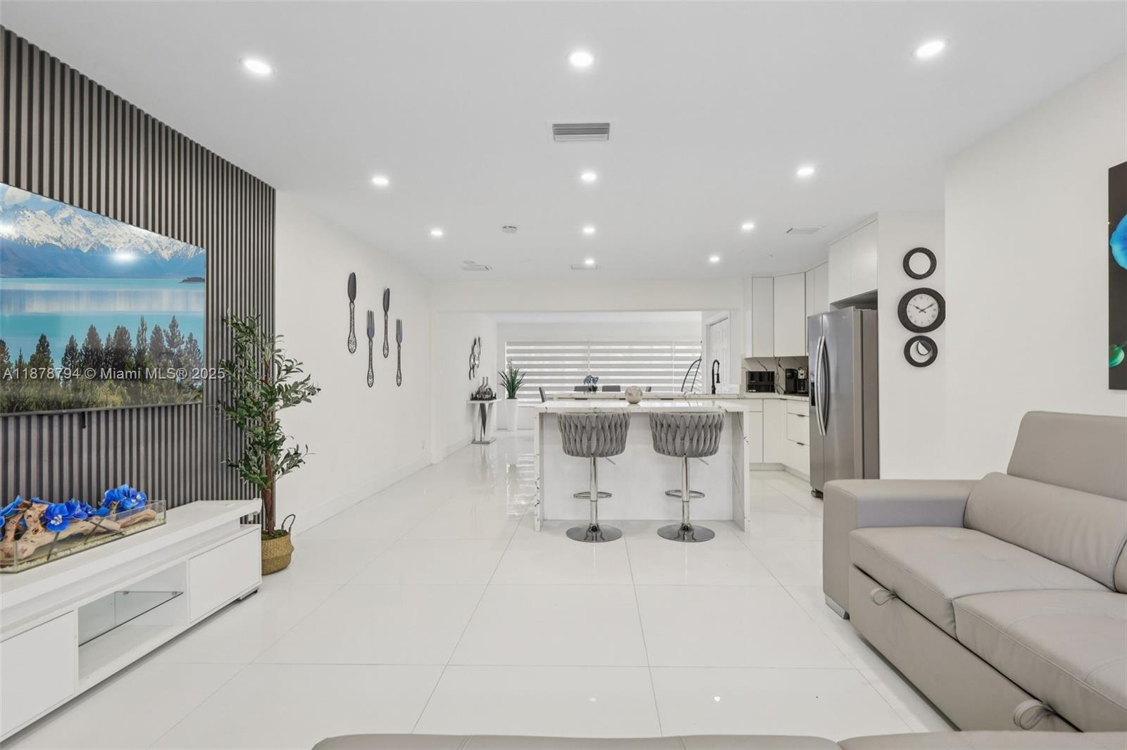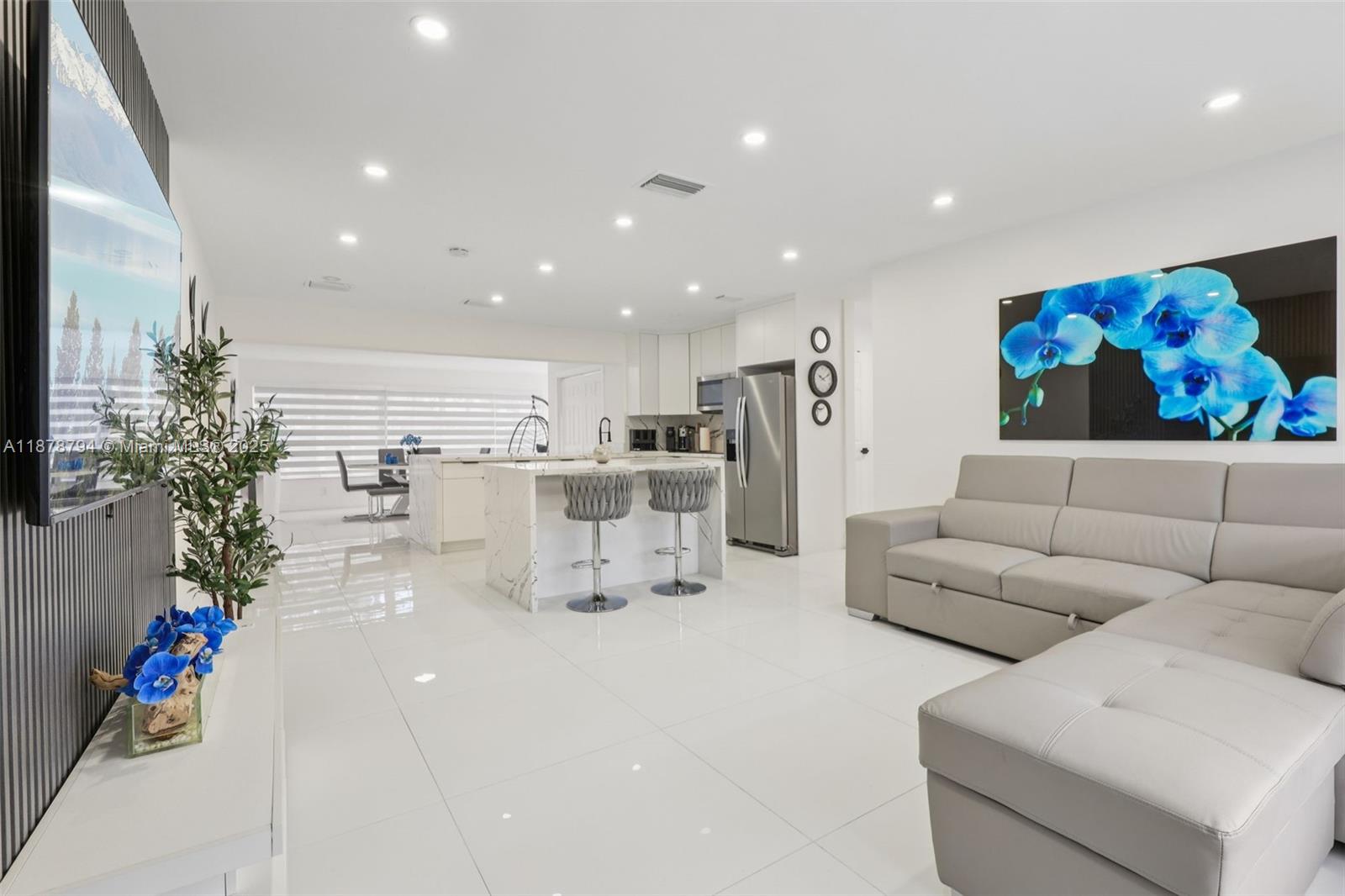 Welcome to this beautifully remodeled 3-bedroom, 2-bath home blending contemporary style with everyday comfort. The open-concept floor plan showcases a chef-inspired kitchen with a large island, quartz countertops, sleek white cabinetry, and stainless steel appliances. Bathrooms feature modern elegance with floor-to-ceiling tile and updated fixtures, while white porcelain floors enhance the home’s bright, seamless flow. Outdoors, enjoy an expansive lot with a backyard retreat designed for entertaining and relaxation. A sparkling pool invites year-round enjoyment of South Florida’s warm weather. Featuring a new roof and PVC plumbing updated in 2024, this property is perfect as a residence or investment, ideal for short-term rental or Airbnb.