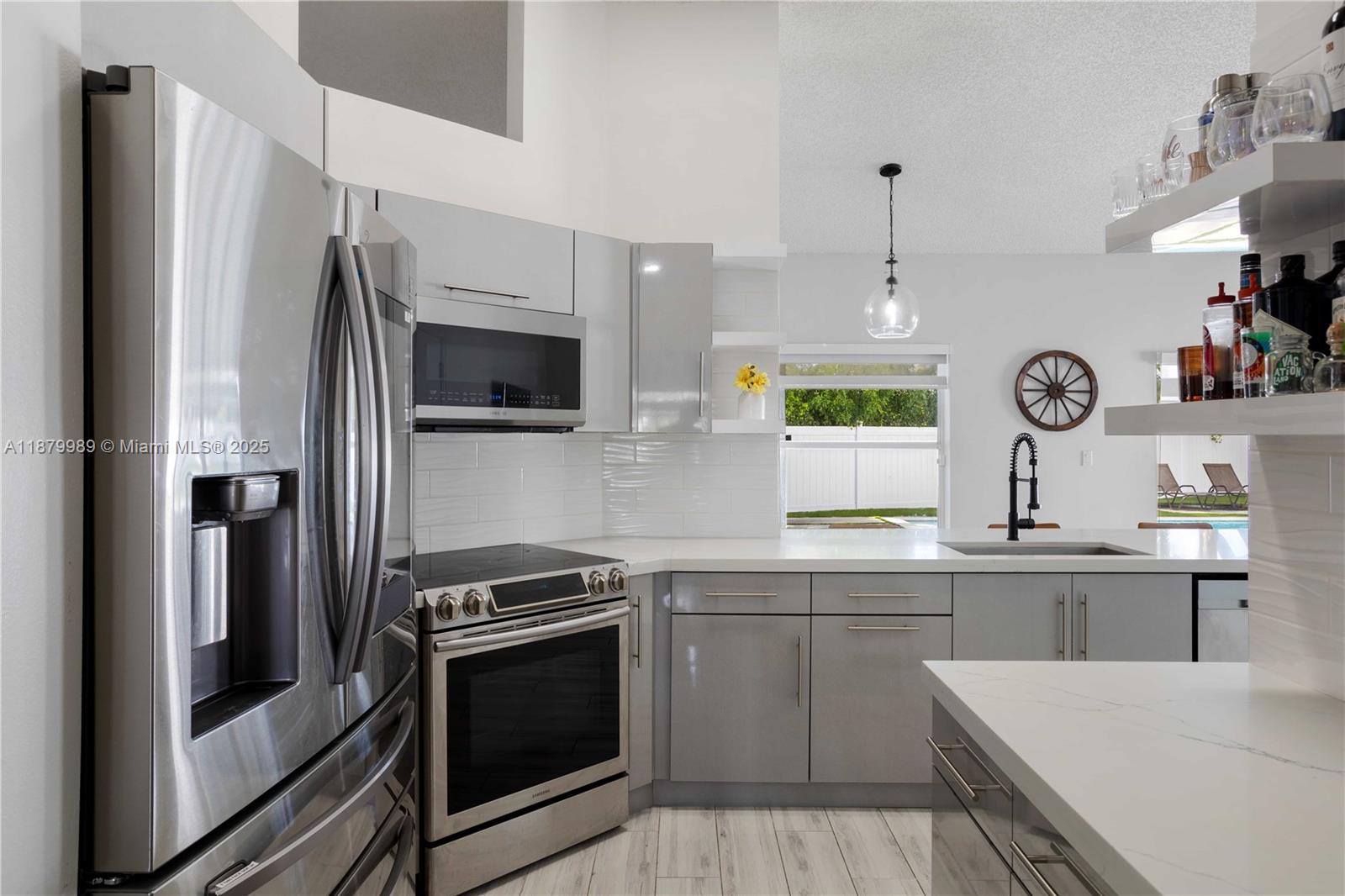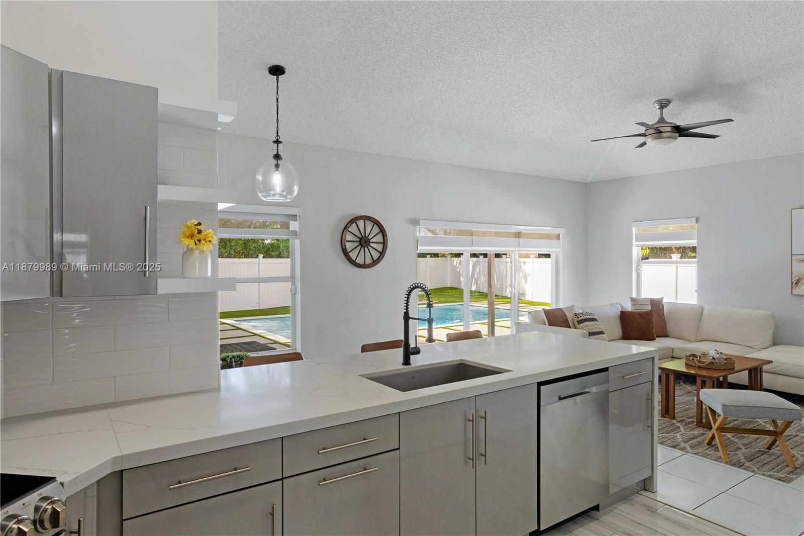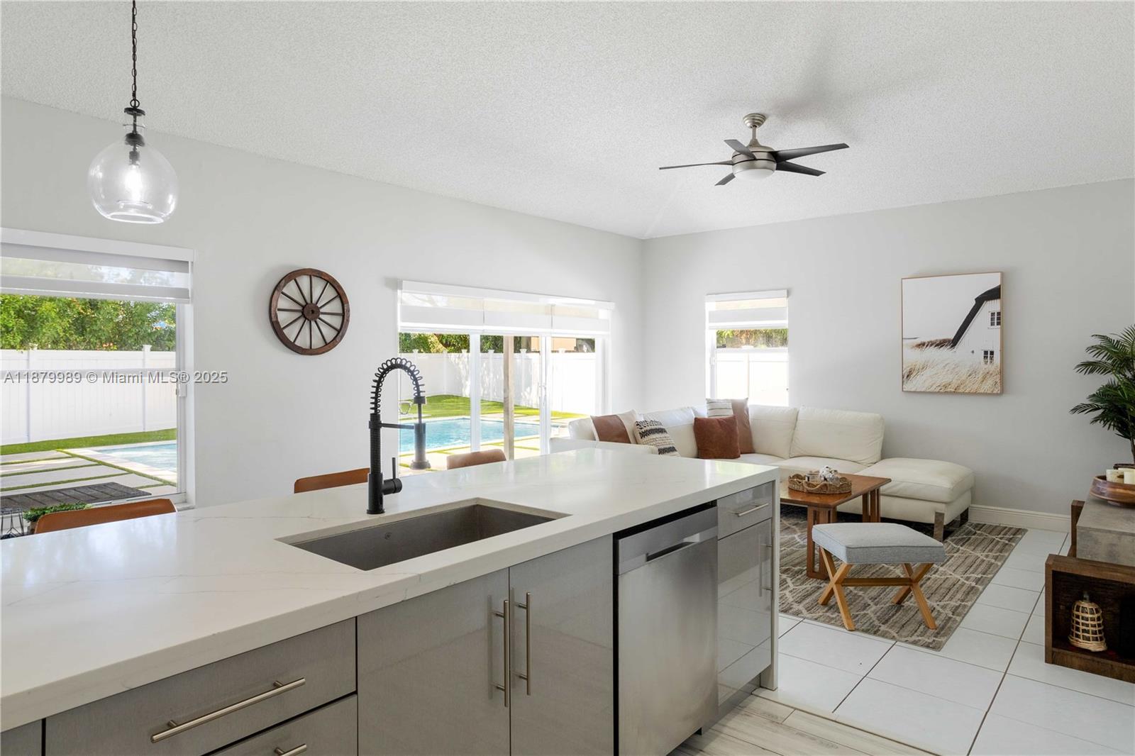 Welcome to Avalon, a secure, gated, family-friendly lakeside community in Miramar. This beautifully upgraded 3BR/2BA pool home offers the perfect blend of comfort and style. Enjoy a bright open layout with a custom kitchen featuring quartz waterfall countertops and stainless steel appliances. Step outside to your private backyard oasis with an oversized pool, artificial turf, and a pergola with built-in TV—ideal for family gatherings and weekend fun. The spacious primary suite includes dual sinks, Roman tub, glass shower, and walk-in closet. Also features a laundry room, 2-car garage, and extended driveway. Community offers 24/7 security, pool, playground, sports courts, and walking trails. Near A-rated schools, parks, shopping, and highways.