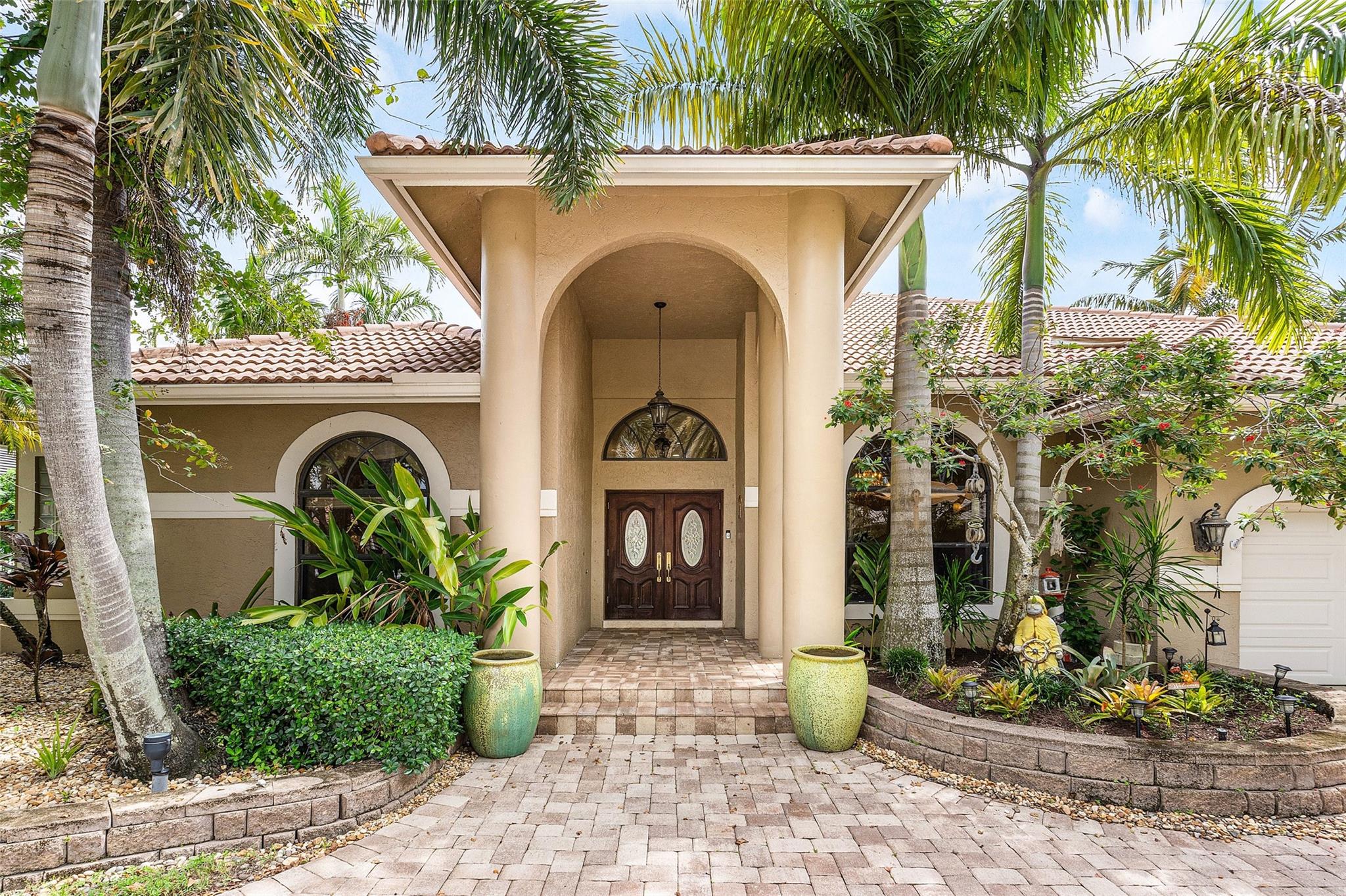 Beautiful waterfront home in gated Country Point Estates! This 5 Bedroom/3.5/Pool residence features a large circular driveway, walls of Impact Windows/Doors, soaring ceilings, marble floors, plantation shutters & serene water views throughout. The chef’s kitchen offers an island. Thermador gas range, double ovens, warming drawer, refrigerated drawers, Subzero refrigerator & more. Spacious primary suite is a retreat with a spa like bathroom, dressing area with a vanity, large closets with cabinetry & stunning views. The triple split plan affords space and privacy for all. The backyard is designed for entertaining with a saltwater heated pool/spa, bar, covered area, large screened porch and outdoor livings areas overlooking the waterways. Top-rated schools!