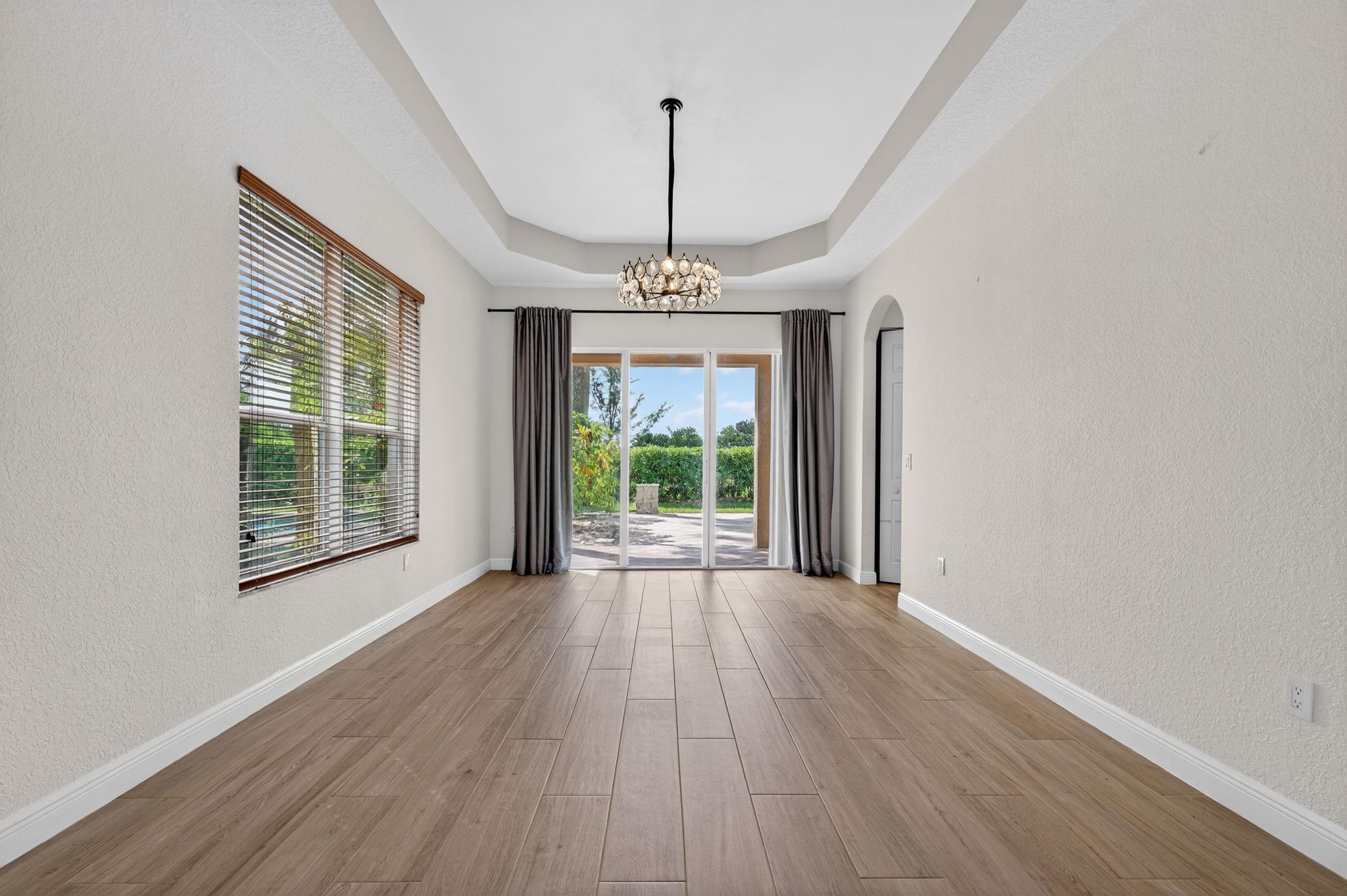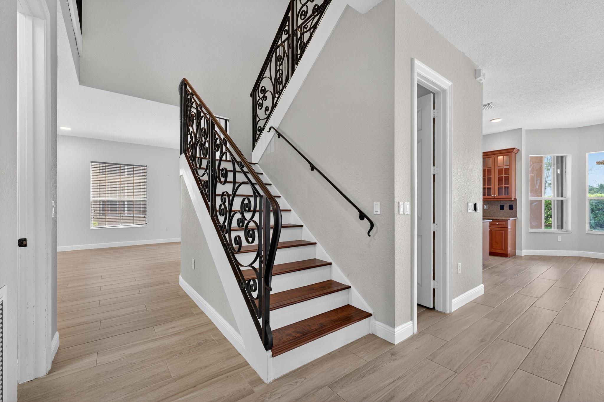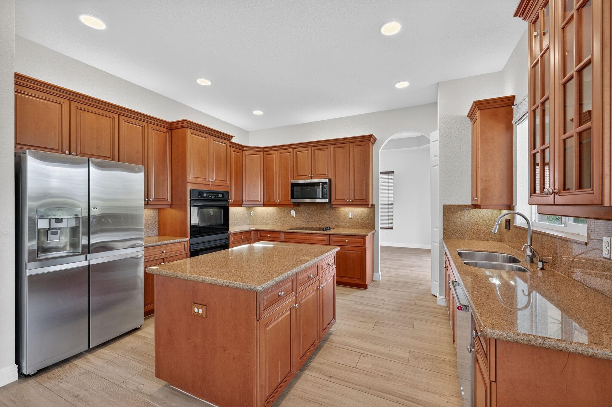 Beautiful 6 Bedroom currently being used as 5 Bedroom and 4 Bathroom home w/pool & canal views! Features double-door entry, 3-car garage & S-tile concrete roof. 1st floor offers wood-look porcelain tile, spacious living & dining rooms w/tray ceilings, gourmet kitchen w/wood cabinets, SS appliances, granite counters, pantry & breakfast area. Full bed & bath downstairs. Primary suite boasts tray ceilings, walk-in closets & luxury bath w/Jacuzzi, shower & dual vanities. Two en-suite bedrooms upstairs. Backyard oasis w/pool, child safety fence, pavered patio, fruit trees & privacy hedge. Easily convert back to 6BR. Hurricane shutters, laundry room w/sink, cabinets & W/D (2025), 2 AC units (2024/2023).