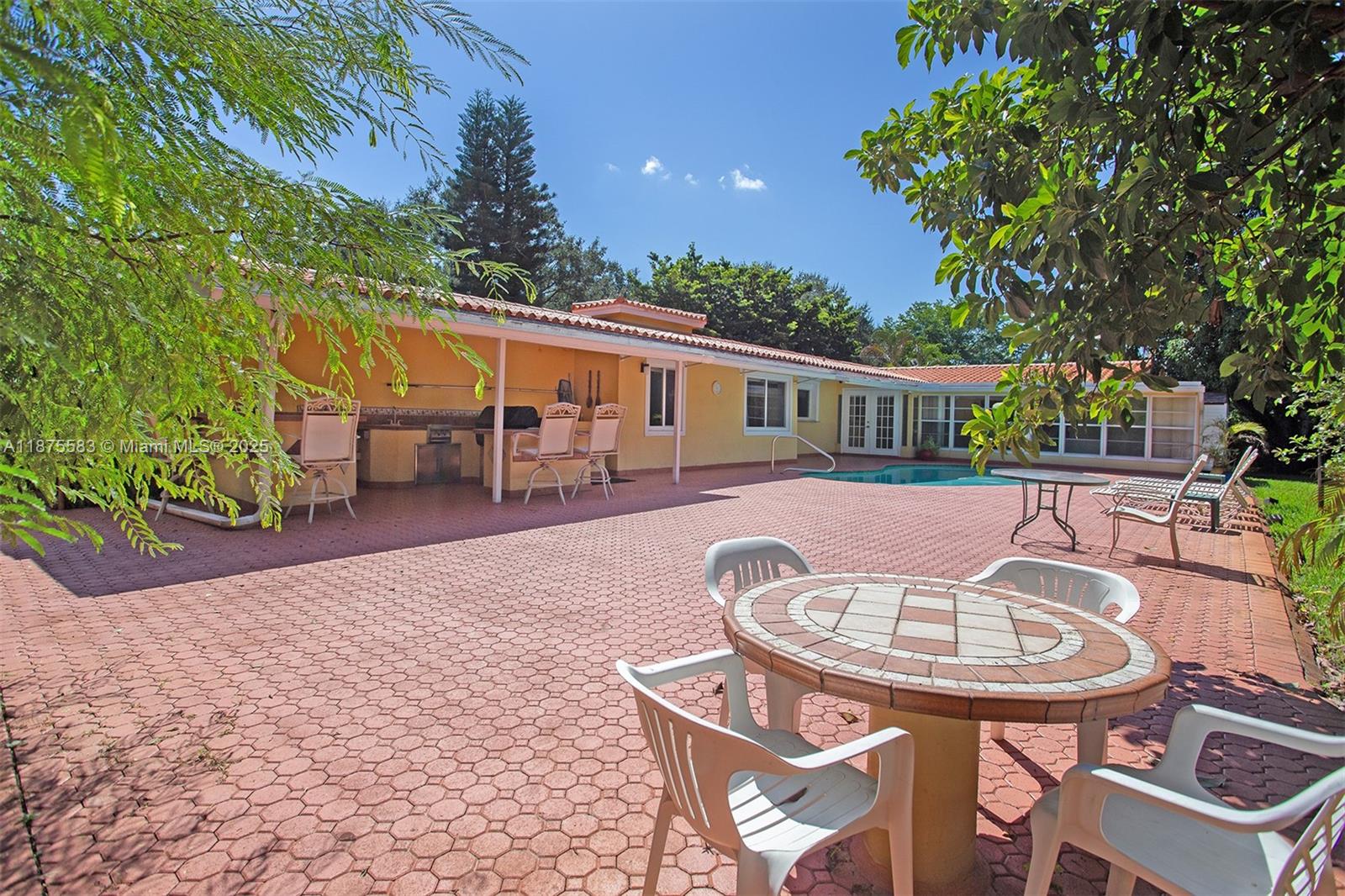 THIS IS IT! BEAUTIFUL CURB APPEAL! SPRAWLING 1-level spacious Home, located on an EXTRA WIDE, nearly double PRIVATE LOT! ADD a Heated POOL & XL Beautiful Patio in this Fenced & PRIVATE OASIS w/ Mature & Maintained Landscaping, AMAZING 6 FRUIT TREES (mango, avocado, lemon & more!) PLUS a Covered Outdoor Grilling Area, PERFECT FOR ENTERTAINING. INSIDE are 4 BR & 3 BA, Lg. Living RM, Dining RM, Florida RM & an add'l DEN make this home so spacious. KITCHEN has Granite Countertops & matching Table & roll-out drawer Pantry. Bedrooms have NEW CARPET & PAINT, ceiling fans & lg. closets. 4th BR is private & ideal for BR or office w/ its own full bath. WIDE CIRCULAR DRIVE & 2 CAR GARAGE. NO HOA FEES! Hurricane Windows, Security System/Cameras, Irrigation. (Virtually Staged). SEE IT BEFORE IT SELLS!
