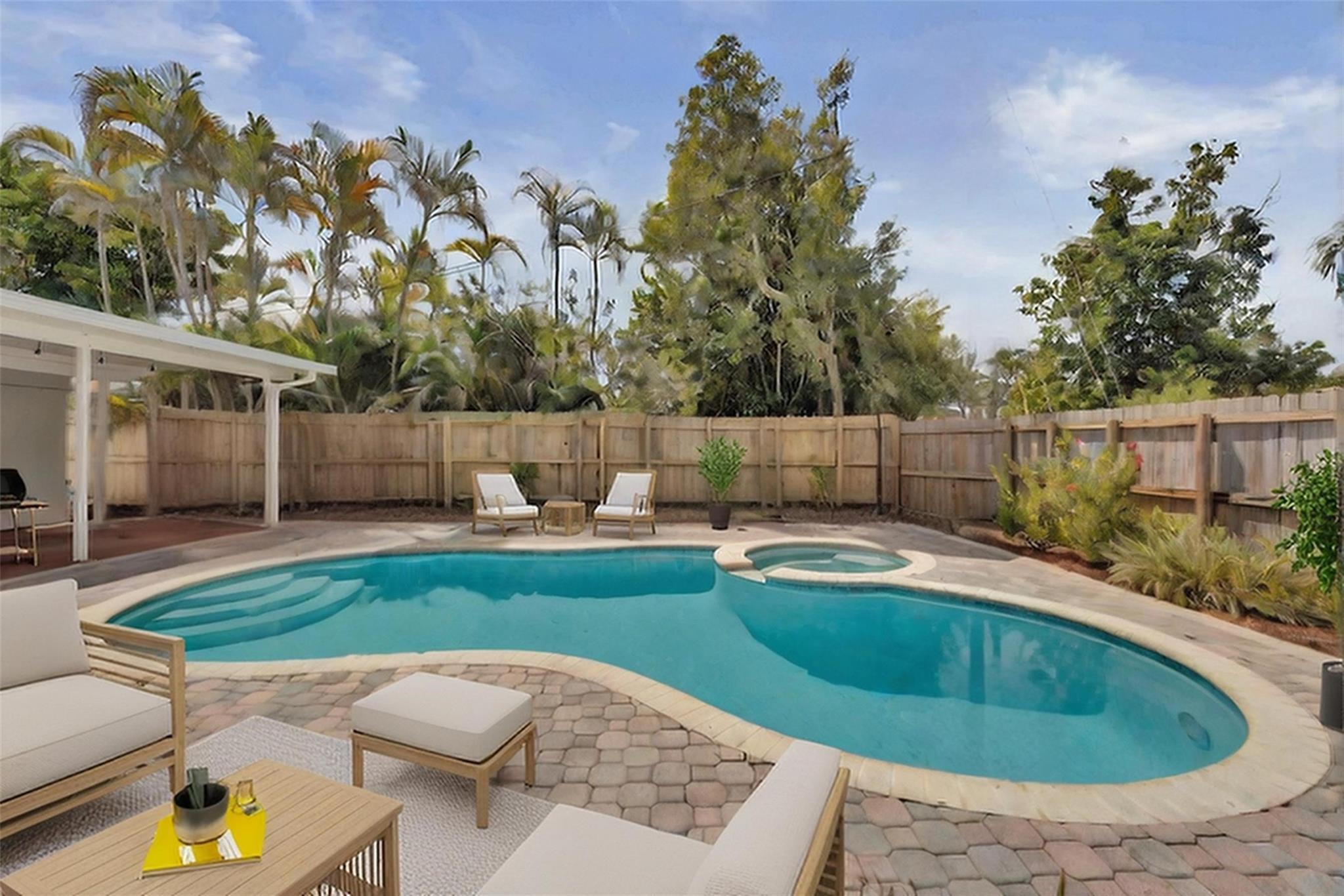 "Poolside Paradise" corner lot gem in the sought after Hollywood Hills community-this charming 3 bedroom, 2 bath home with versatile 4th bedroom currently used as an office offers nearly 2,000 sqft of living space. Lucky buyer will receive a $10,000 CREDIT toward a bathroom update and BRAND NEW IMPACT WINDOWS being installed for peace of mind! Bright open kitchen with newer appliances, wood cabinetry, sleek countertops, and buffet style serving bar. Spacious living room plus a large family room- ideal for entertaining. Freshly painted on interior, exterior and new baseboards. Sparkling newer pool & heated spa w/ paver deck. Private fenced backyard with double gate access. Front driveway fits 4 cars + rear alley has 1.5 car garage + extra parking or store boat. Close to Hollywood Beach!