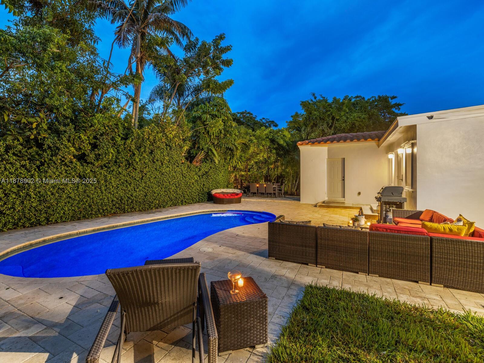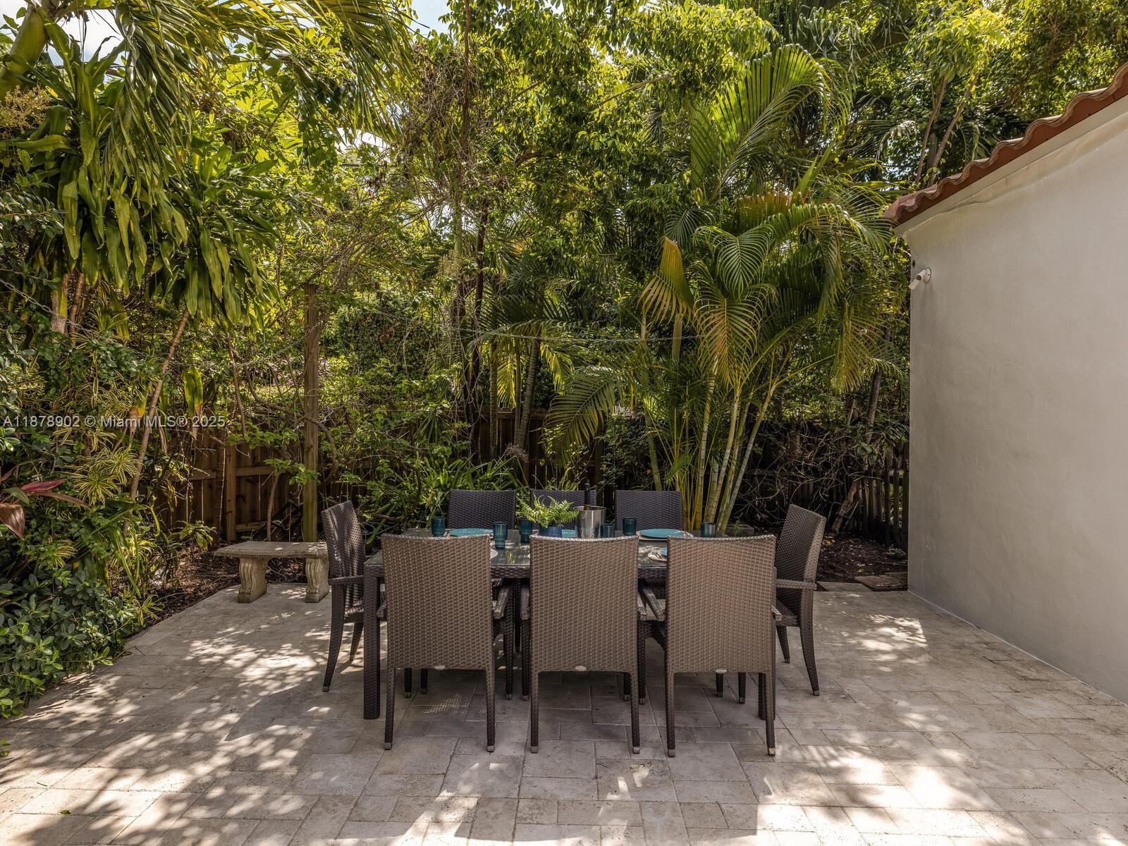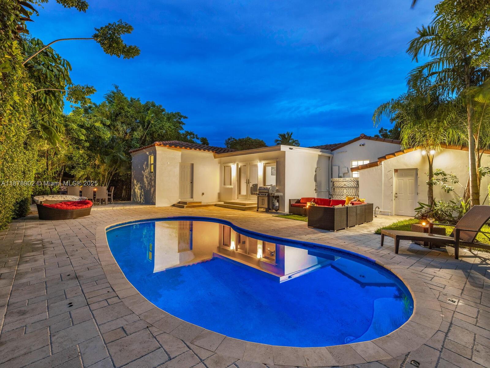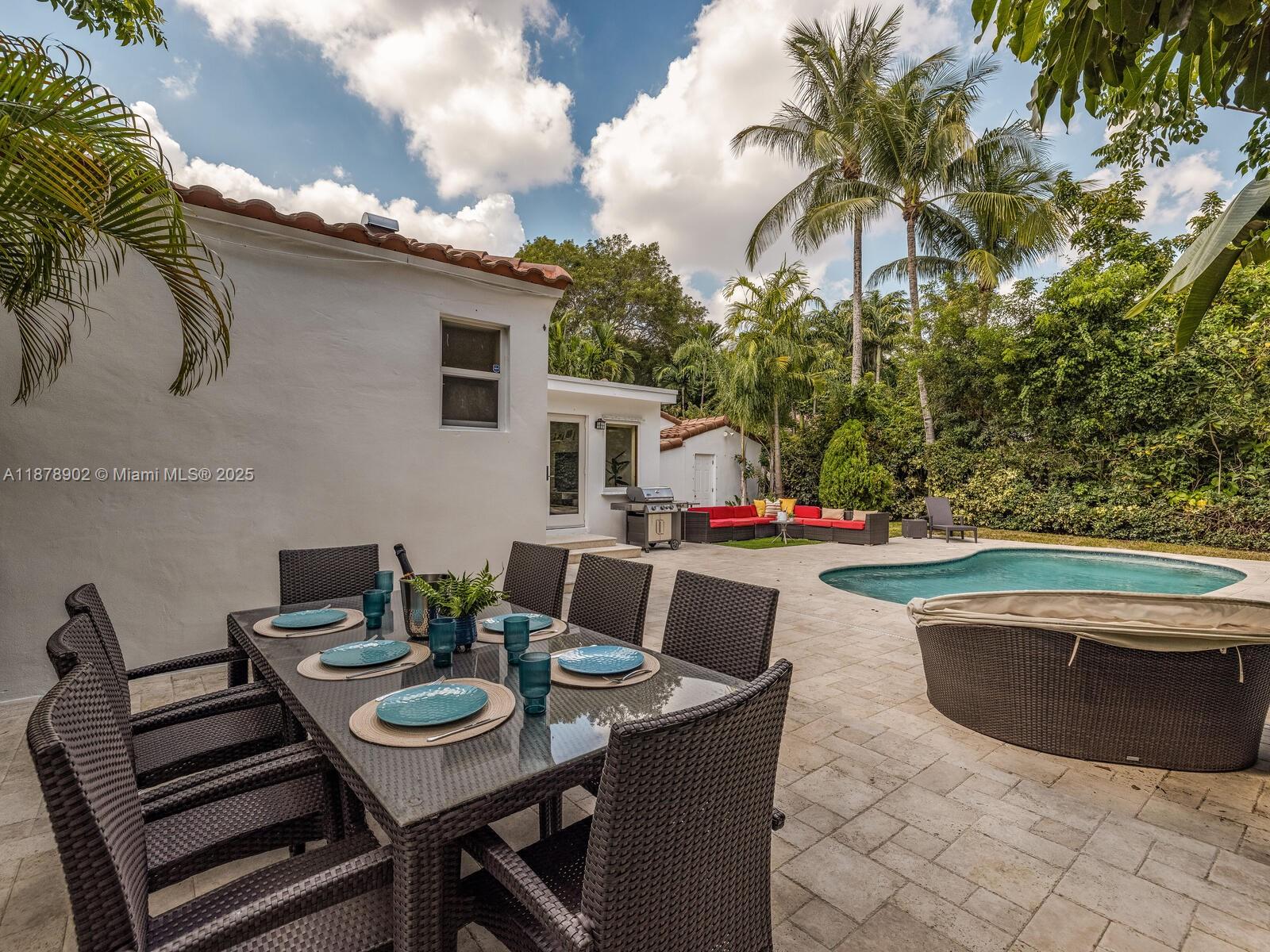 Fabulous location, updates and character await you in this 4-bedroom, 1,917 SF Miami Shores pool home. Welcome to The Seagrape Escape! Fantastic flowing interiors: entrance foyer; bright sunroom; vaulted beamed ceiling dining; newer quartz counter island kitchen with wine bar + cooler and storage galore; breakfast nook; plus rear media room opening to private gardens, sparkling “boomerang pool” and entertainment decks. Sleep easy in the rear primary ensuite with walk-in closet, spa-like bath and cabana door to pool—plus, two east wing bedrooms + bath; and a fourth “flex” west wing ensuite bedroom, perfect for guests, office, or studio/gym. A great value, with a new roof, ceramic plank and travertine floors, and the signature seagrape tree in the front, just blocks to Downtown Shores.