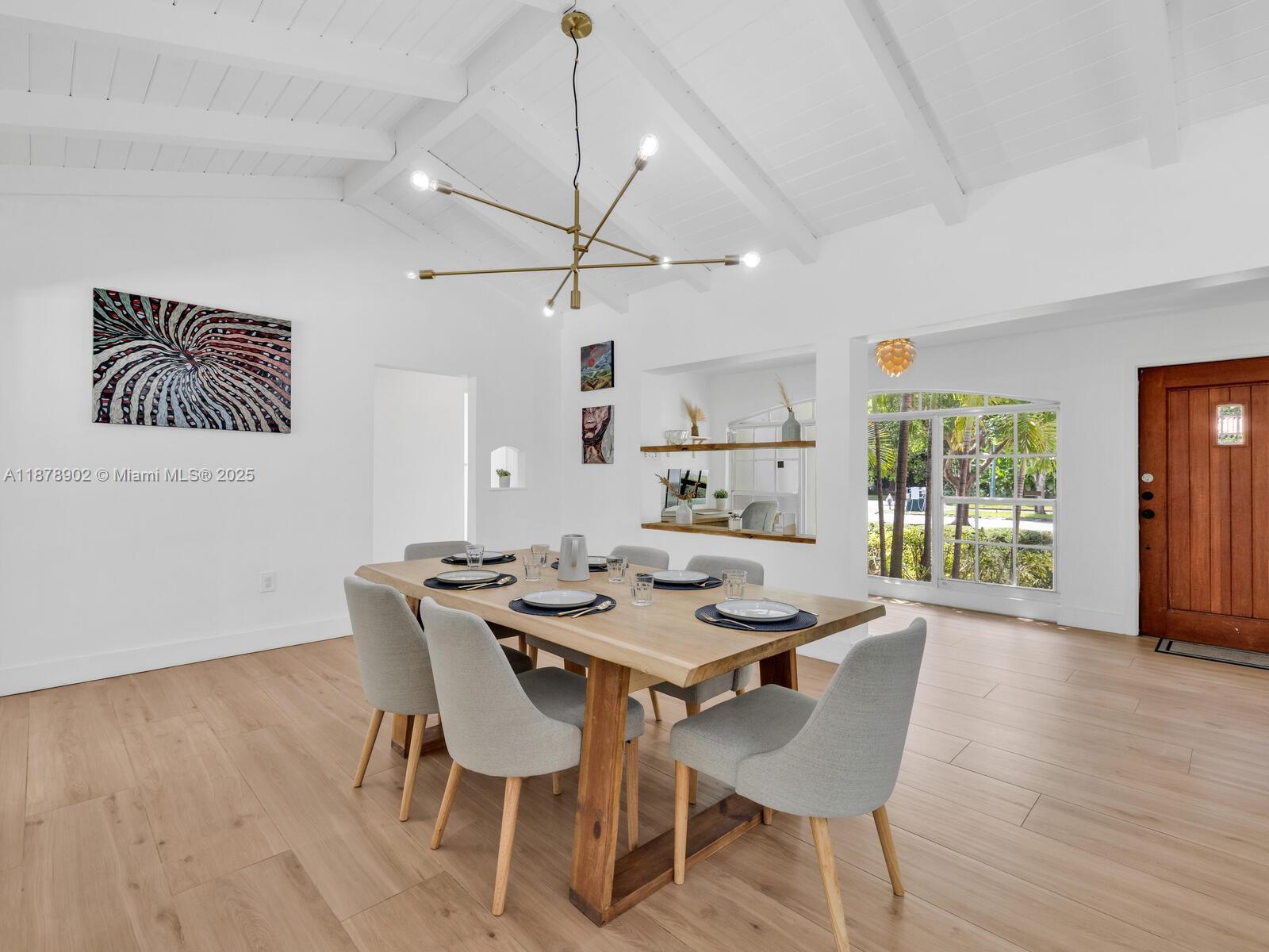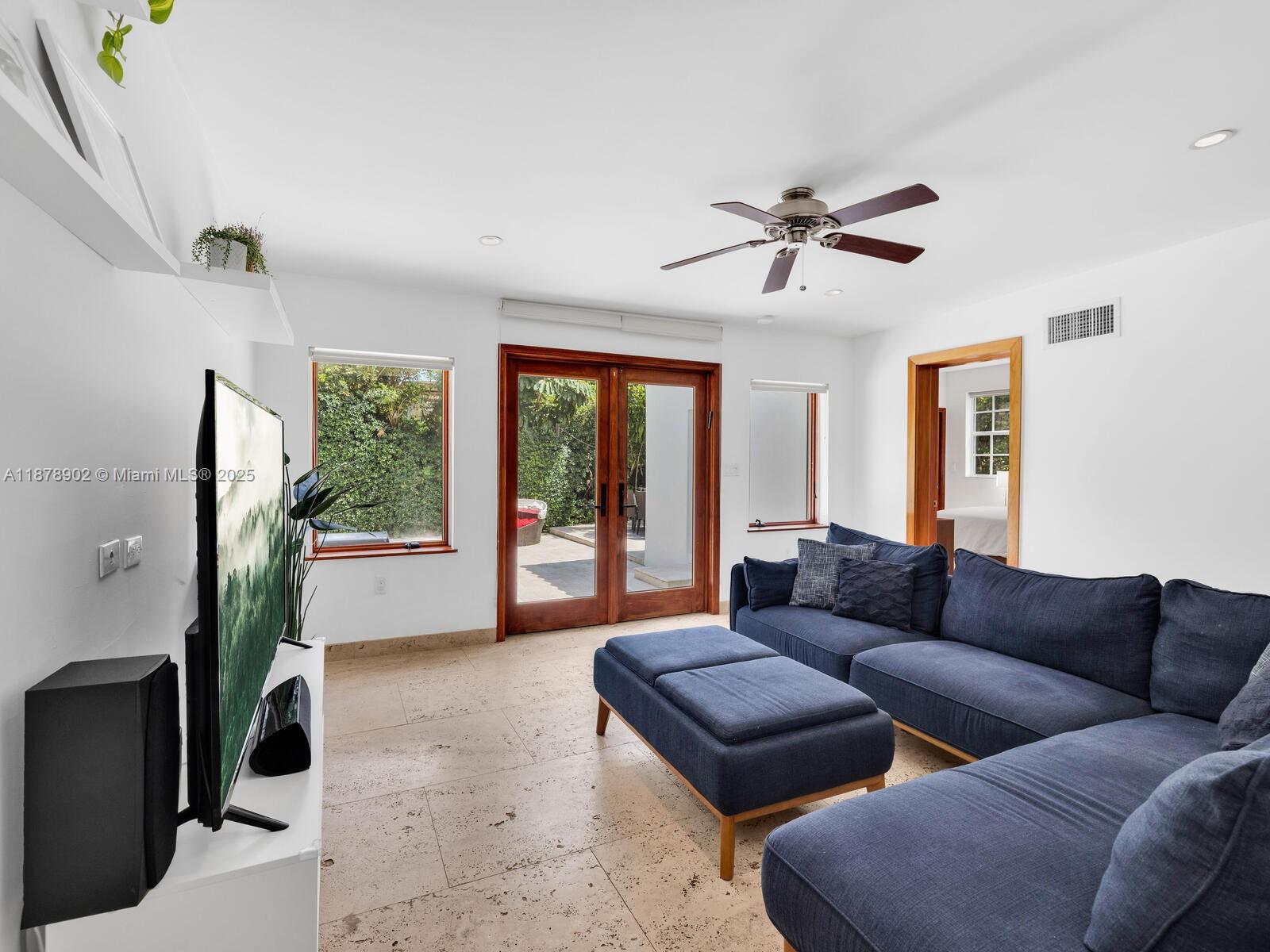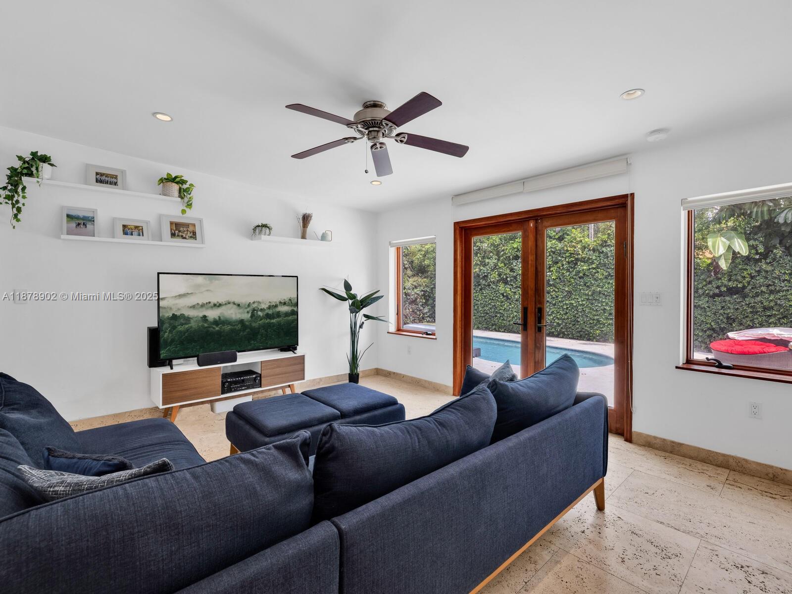 Fabulous location, updates and character await you in this 4-bedroom, 1,917 SF Miami Shores pool home. Welcome to The Seagrape Escape! Fantastic flowing interiors: entrance foyer; bright sunroom; vaulted beamed ceiling dining; newer quartz counter island kitchen with wine bar + cooler and storage galore; breakfast nook; plus rear media room opening to private gardens, sparkling “boomerang pool” and entertainment decks. Sleep easy in the rear primary ensuite with walk-in closet, spa-like bath and cabana door to pool—plus, two east wing bedrooms + bath; and a fourth “flex” west wing ensuite bedroom, perfect for guests, office, or studio/gym. A great value, with a new roof, ceramic plank and travertine floors, and the signature seagrape tree in the front, just blocks to Downtown Shores.