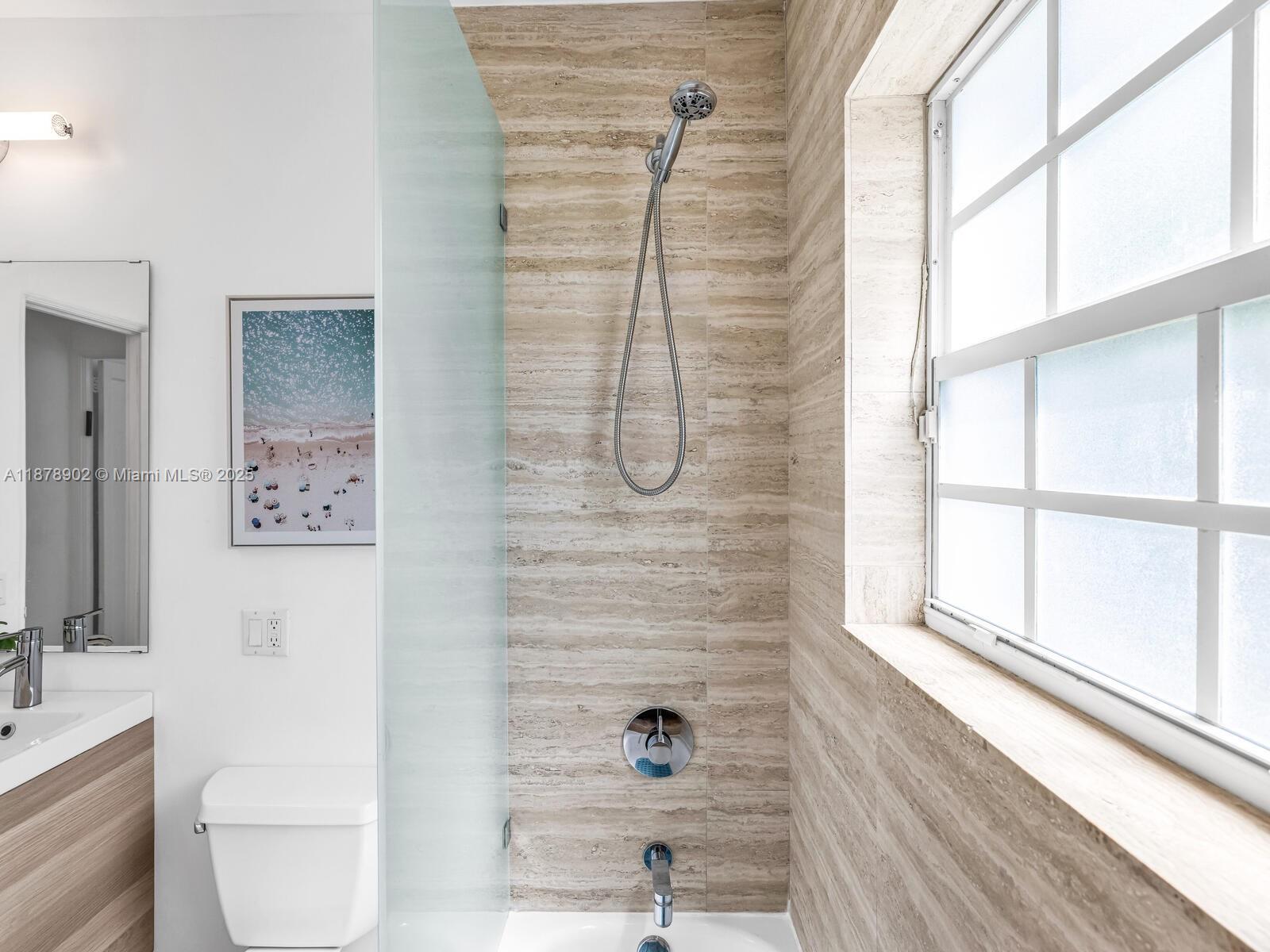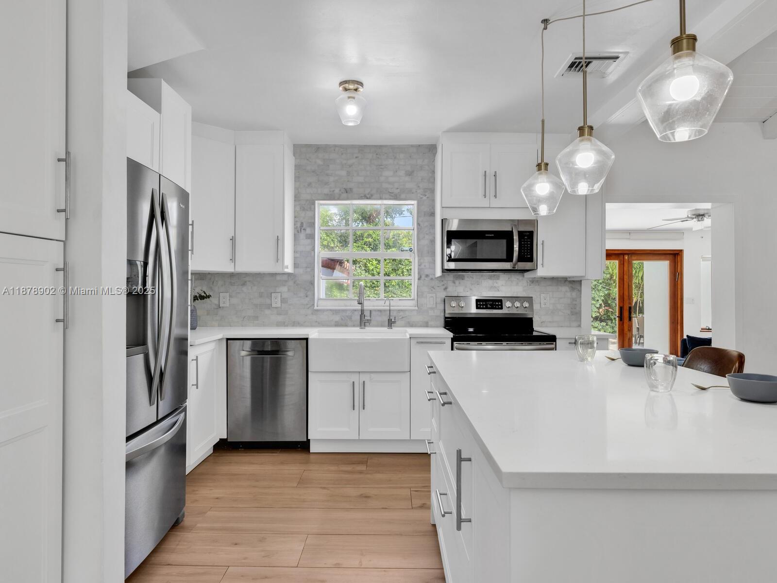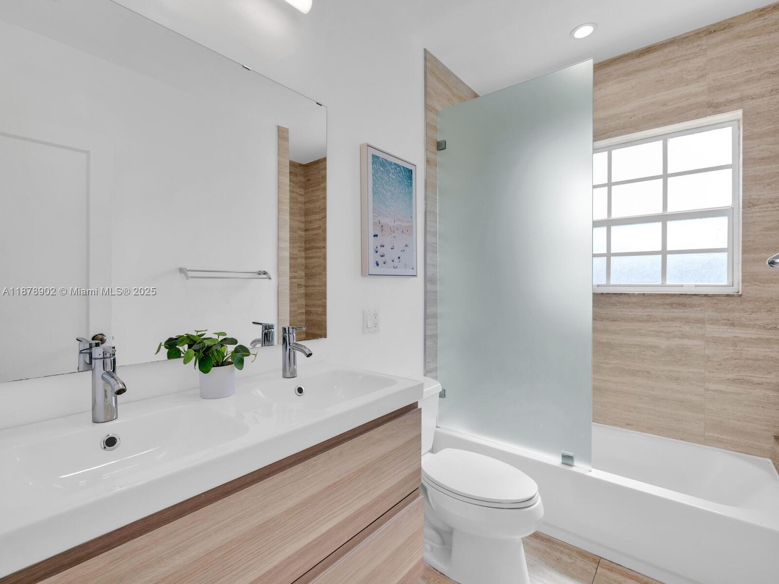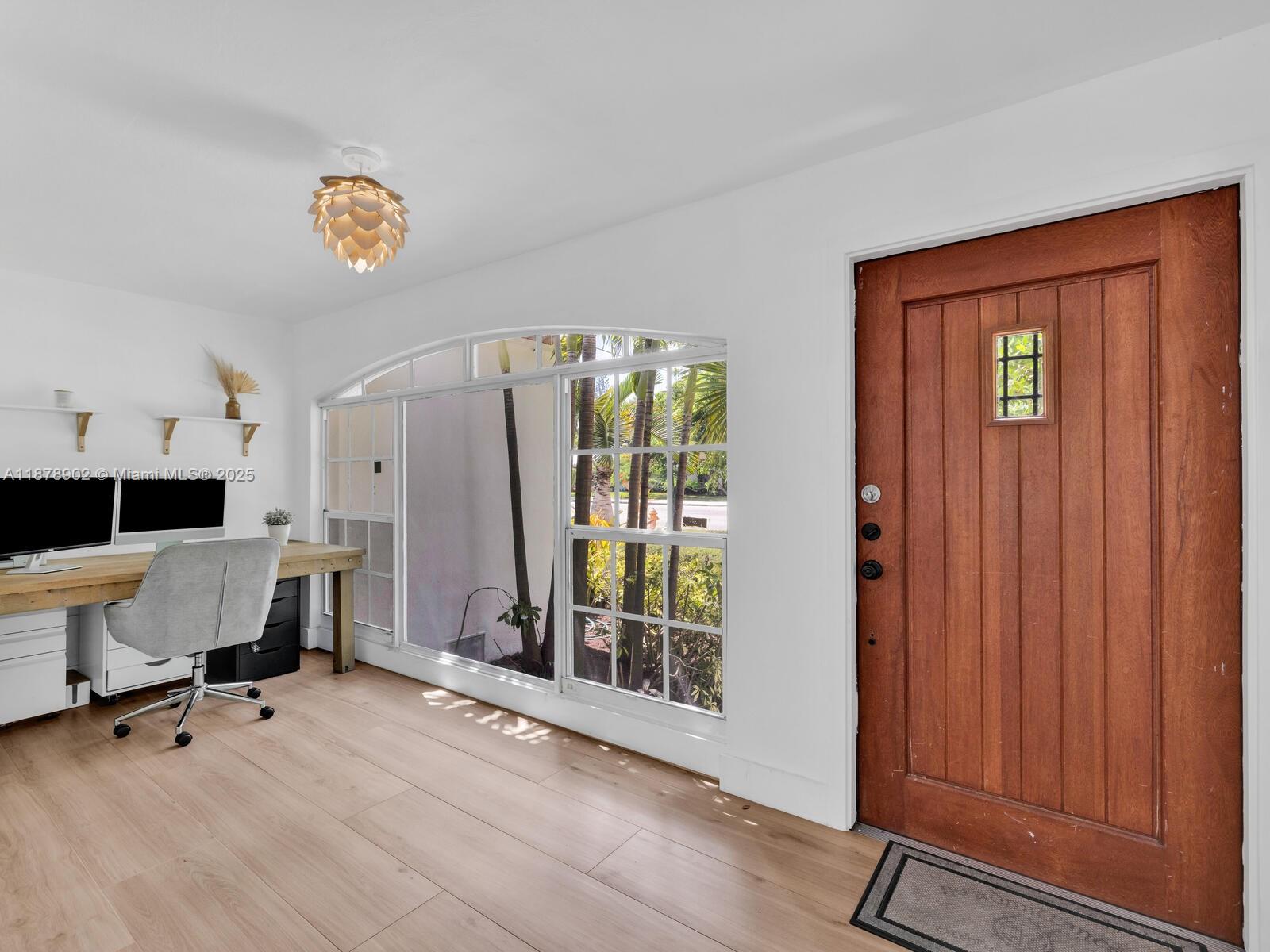Fabulous location, updates and character await you in this 4-bedroom, 1,917 SF Miami Shores pool home. Welcome to The Seagrape Escape! Fantastic flowing interiors: entrance foyer; bright sunroom; vaulted beamed ceiling dining; newer quartz counter island kitchen with wine bar + cooler and storage galore; breakfast nook; plus rear media room opening to private gardens, sparkling “boomerang pool” and entertainment decks. Sleep easy in the rear primary ensuite with walk-in closet, spa-like bath and cabana door to pool—plus, two east wing bedrooms + bath; and a fourth “flex” west wing ensuite bedroom, perfect for guests, office, or studio/gym. A great value, with a new roof, ceramic plank and travertine floors, and the signature seagrape tree in the front, just blocks to Downtown Shores.