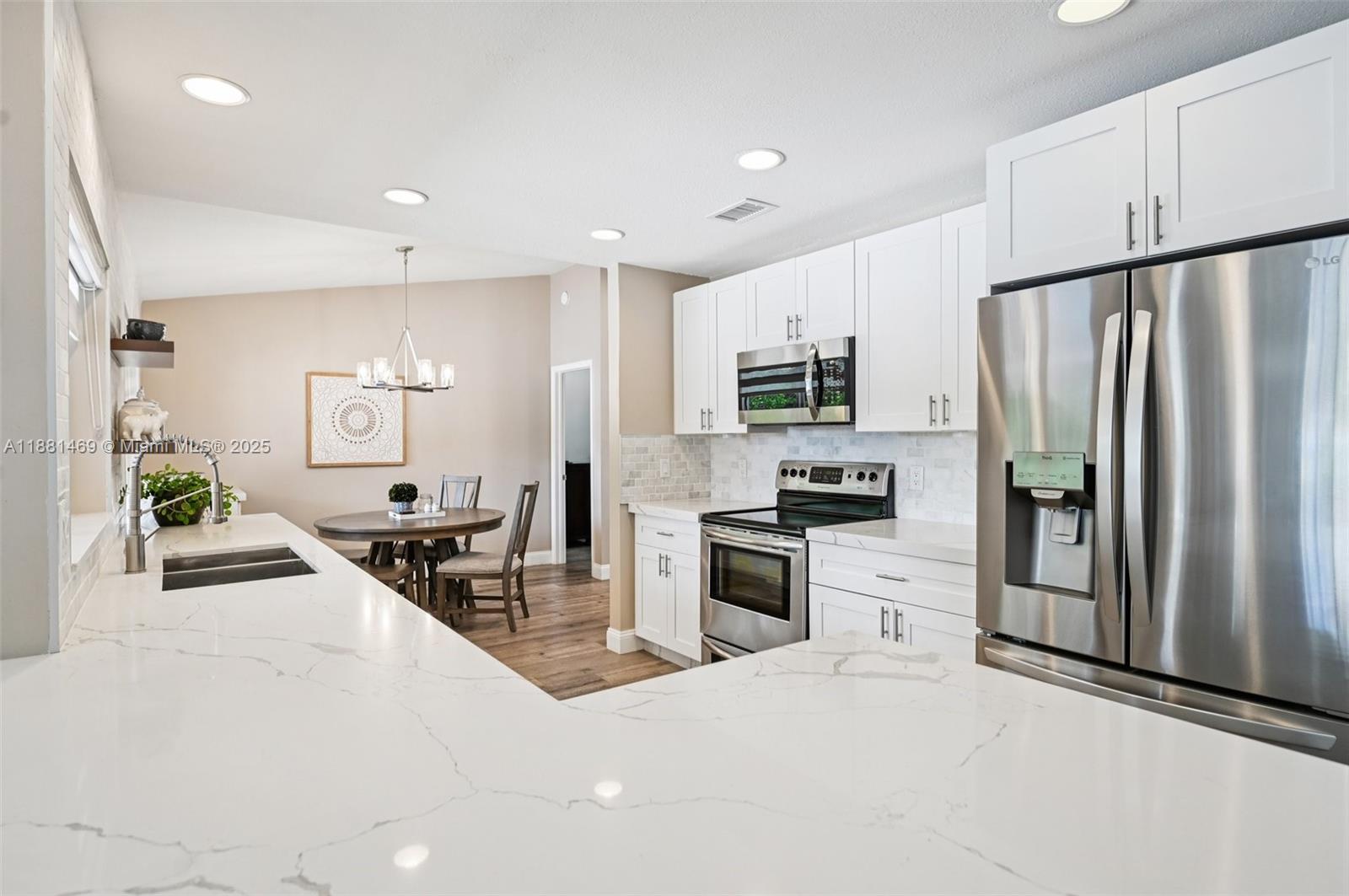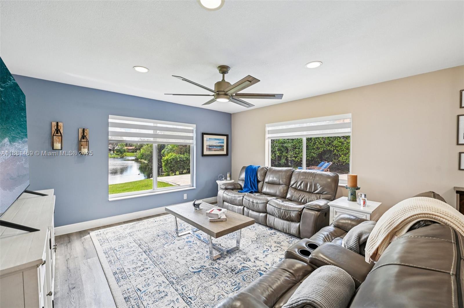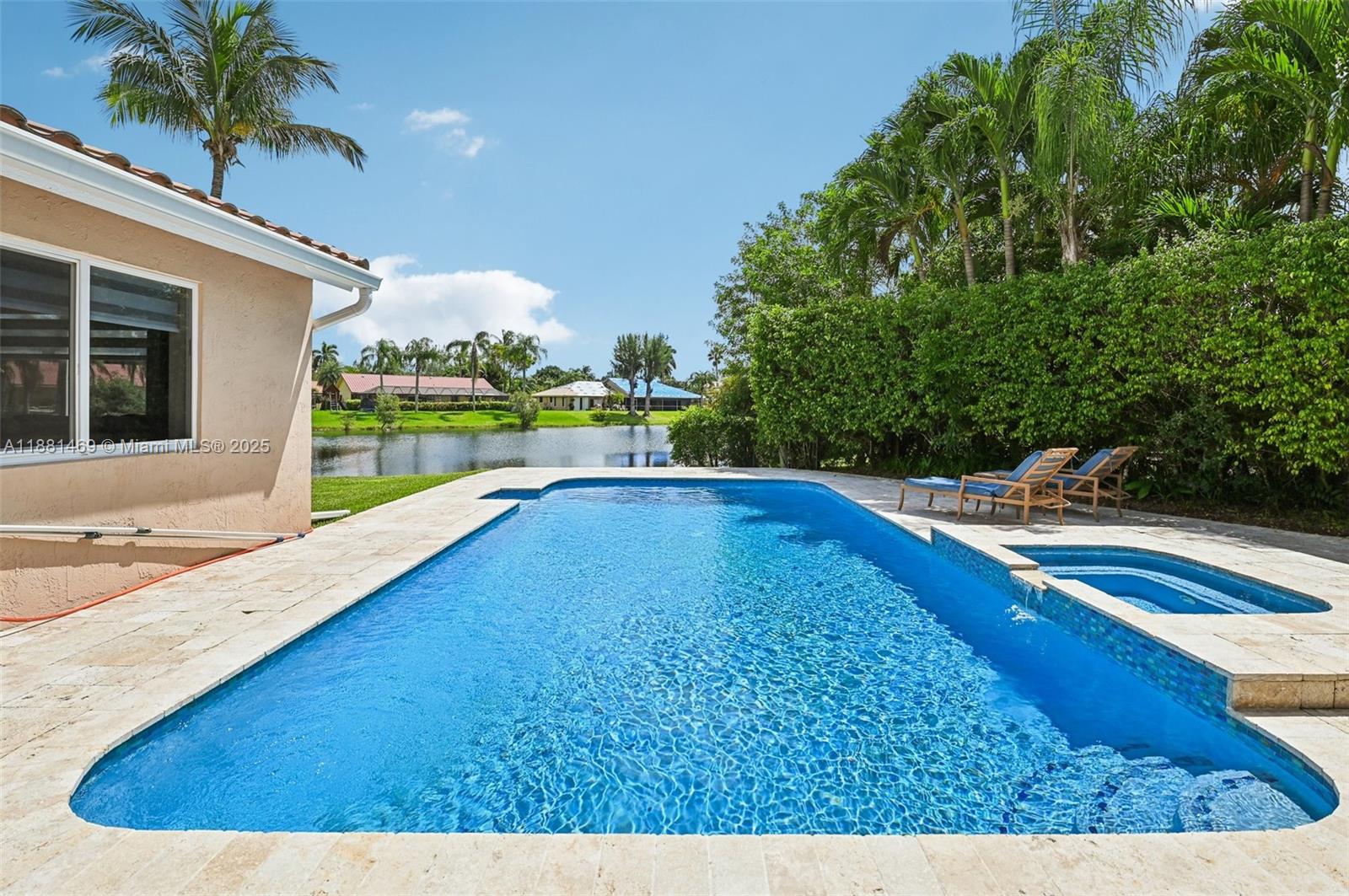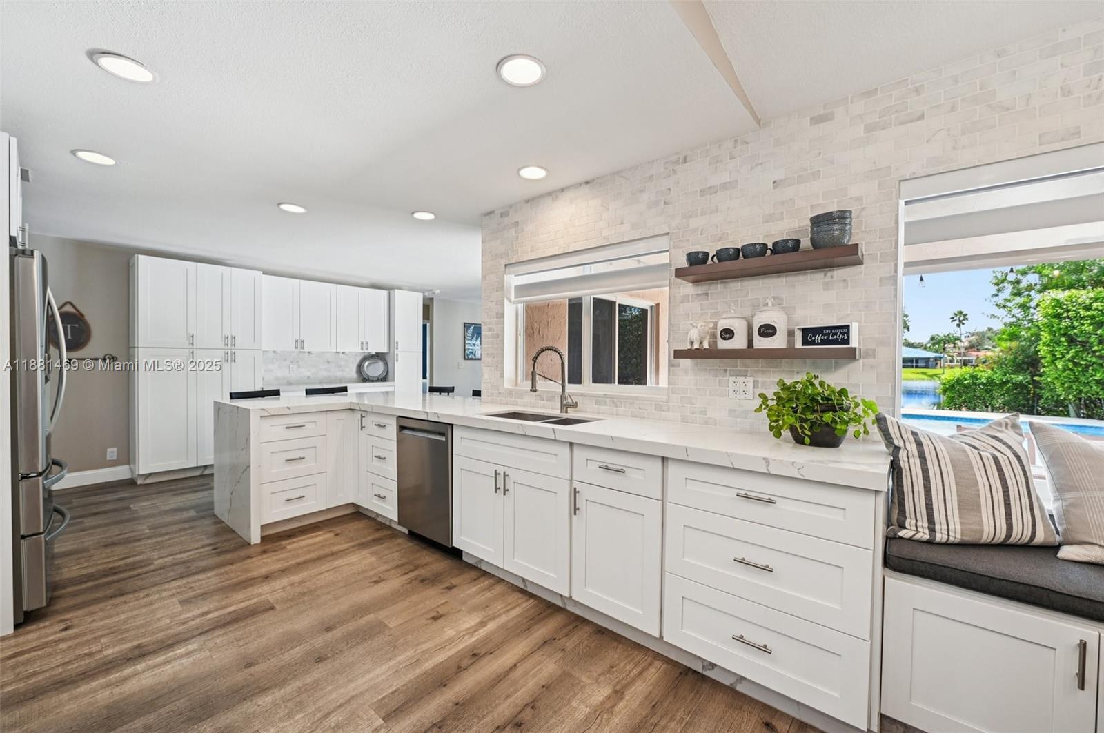 This stunning 4-bedroom, 2-bathroom pool home is situated on a serene lake in sought-after West Davie. Enjoy piece of mind with a 2024 ROOF and IMPACT WINDOWS AND DOORS. Inside, you'll find a spacious, remodeled kitchen with white shaker cabinets, quartz countertops with a waterfall edge, and convenient seating. The bathrooms have been tastefully updated with modern finishes, and luxury vinyl flooring flows throughout the home. The primary suite includes a large walk-in closet with custom built-ins, and zebra blinds add a contemporary touch to every room. The garage includes built-in cabinets for extra storage. Outside, enjoy a large, resurfaced pool, travertine deck and tranquil lake views. Zoned for A-rated schools and a low annual HOA of just $350, this move-in-ready home has it all.