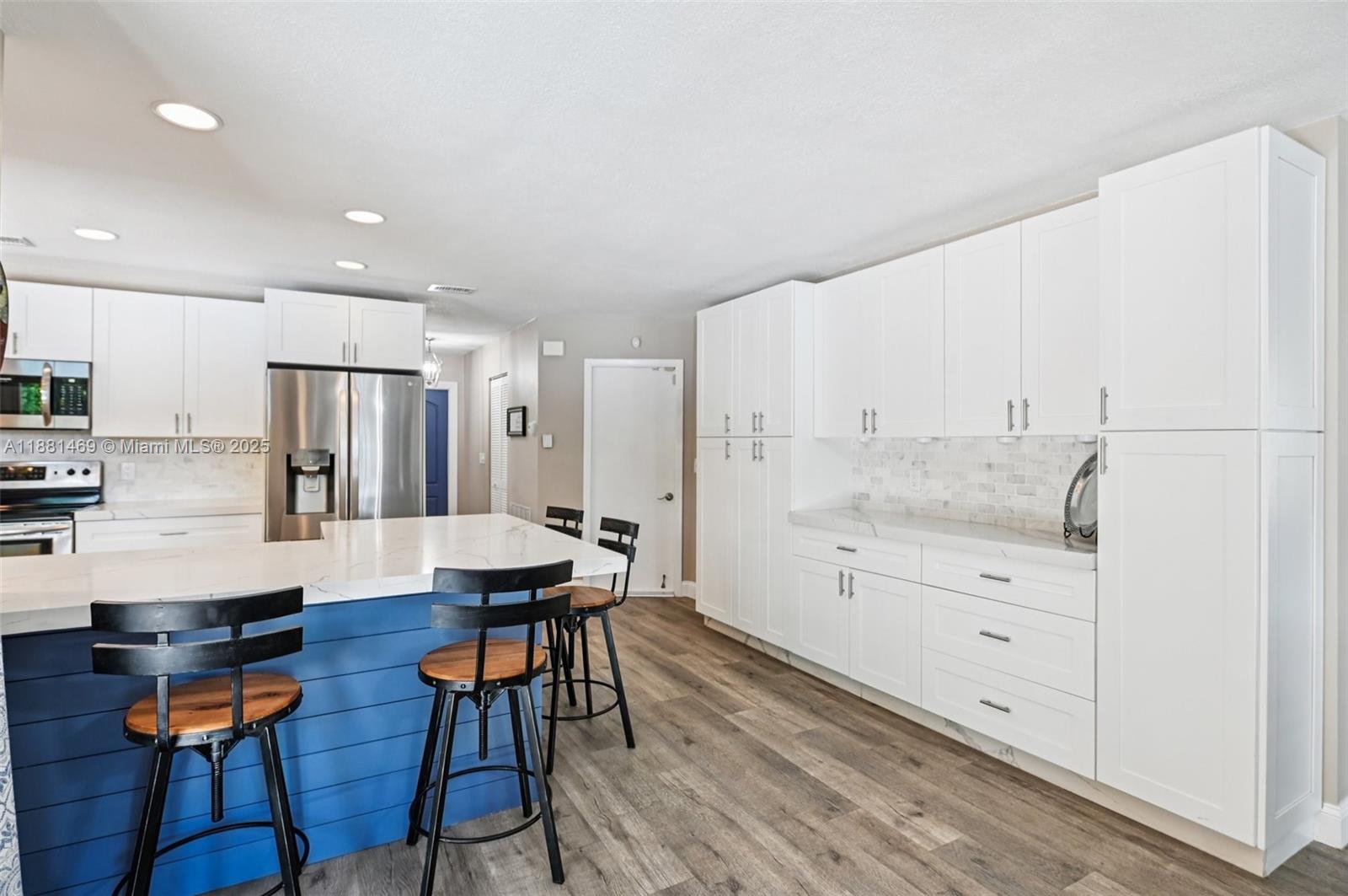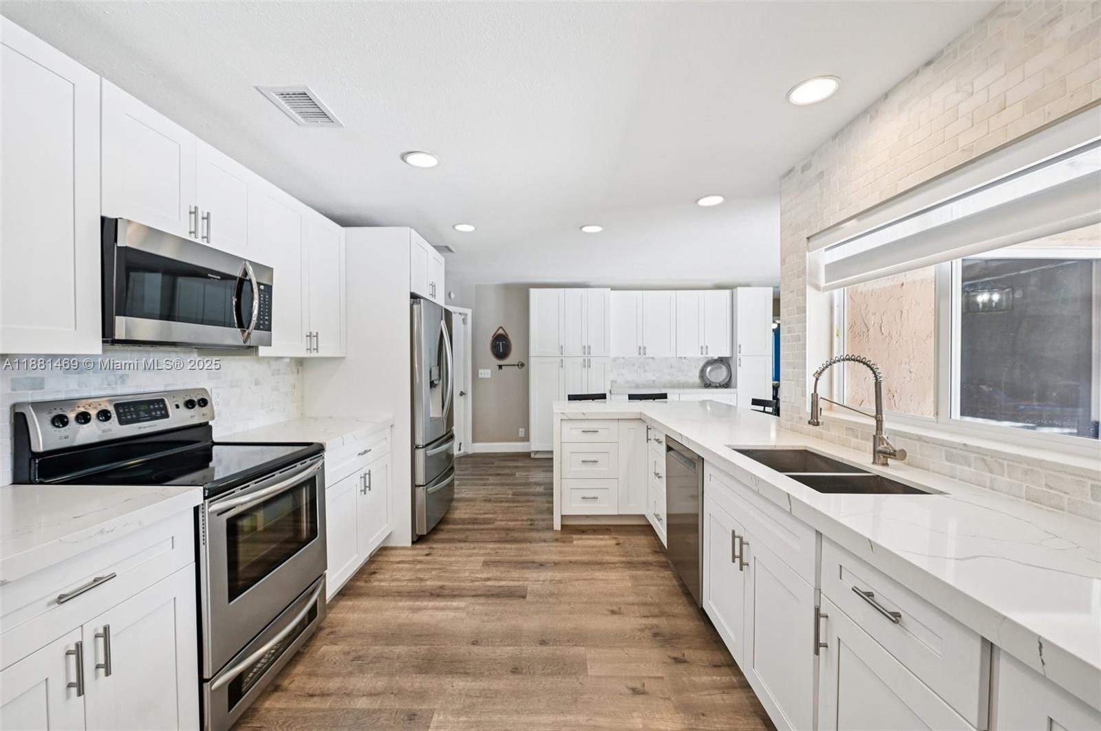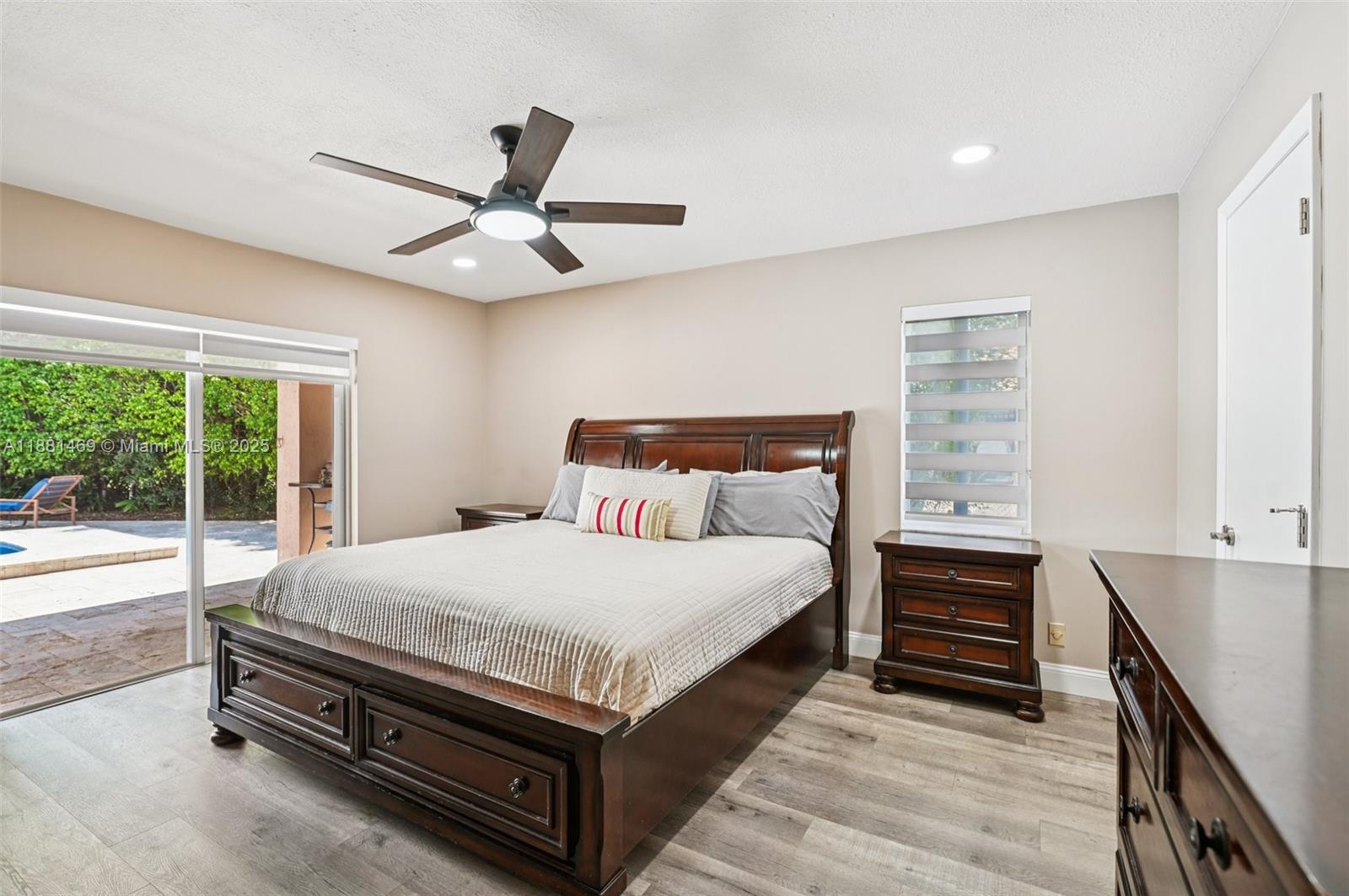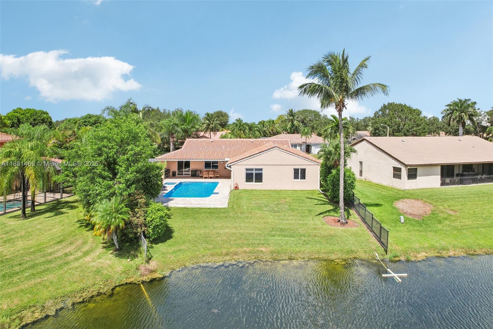 This stunning 4-bedroom, 2-bathroom pool home is situated on a serene lake in sought-after West Davie. Enjoy piece of mind with a 2024 ROOF and IMPACT WINDOWS AND DOORS. Inside, you'll find a spacious, remodeled kitchen with white shaker cabinets, quartz countertops with a waterfall edge, and convenient seating. The bathrooms have been tastefully updated with modern finishes, and luxury vinyl flooring flows throughout the home. The primary suite includes a large walk-in closet with custom built-ins, and zebra blinds add a contemporary touch to every room. The garage includes built-in cabinets for extra storage. Outside, enjoy a large, resurfaced pool, travertine deck and tranquil lake views. Zoned for A-rated schools and a low annual HOA of just $350, this move-in-ready home has it all.