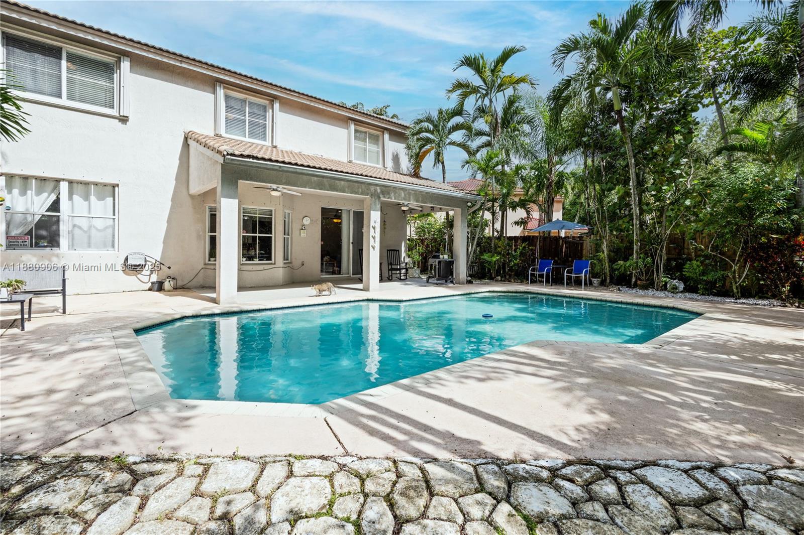 Beautiful 2-story residence 4 bedrooms, 3 full baths, and 2,466 sq. ft. of comfortable living space. Desirable gated community of Poinciana Parc, one of the largest lots at 10,148 sq. ft. of lush tropical beauty. A thoughtful layout includes 1 bedroom, 1 full bath on the first floor, a spacious loft upstairs can easily be enclosed to a 5th bedroom. Volume ceilings and abundant natural light enhance an open, airy feel throughout. Eat-in kitchen overlooks sparkling pool and garden, ideal setting for the nature lover seeking peace and privacy. Step outside to your private backyard oasis, perfect for entertaining or simply relaxing in a serene, tropical escape. Enjoy the convenience of living in the Shenandoah area, just minutes from major highways, shopping, dining, and top-rated schools.