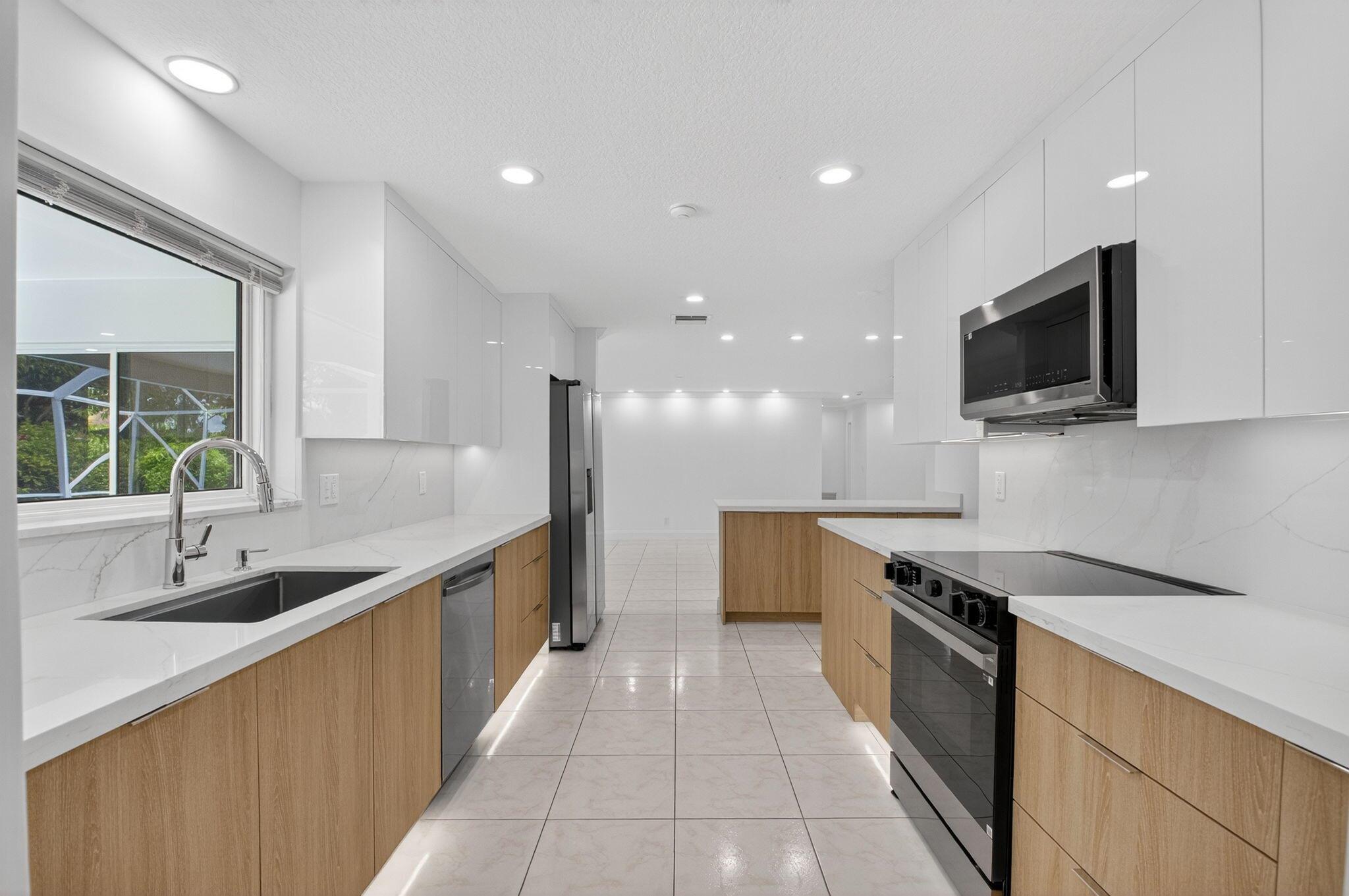 Gorgeous single family pool home in Delray Beach. Home features 4 spacious bedrooms + flex/bonus room, 2,200+ square feet under air, fully upgraded, brand new two-tone kitchen with custom cabinetry, new appliances, wine cooler and beautiful Quartz countertops. Brand new bathrooms, custom LED lighting all throughout the home, spacious walk-in closet in master bedroom w/ custom powder room. This home offers the perfect blend of luxury, convenience and privacy. 2 car garage plus oversized driveway, hurricane impact windows, big pool patio and large backyard (over 10,000 sqft LOT) with fruit trees and a garden oasis for privacy. Ideal for entertainment and summer vibes all year round! Salt water pool system, no HOA, split floor plan, abundance of natural, heated pool, well water and more!