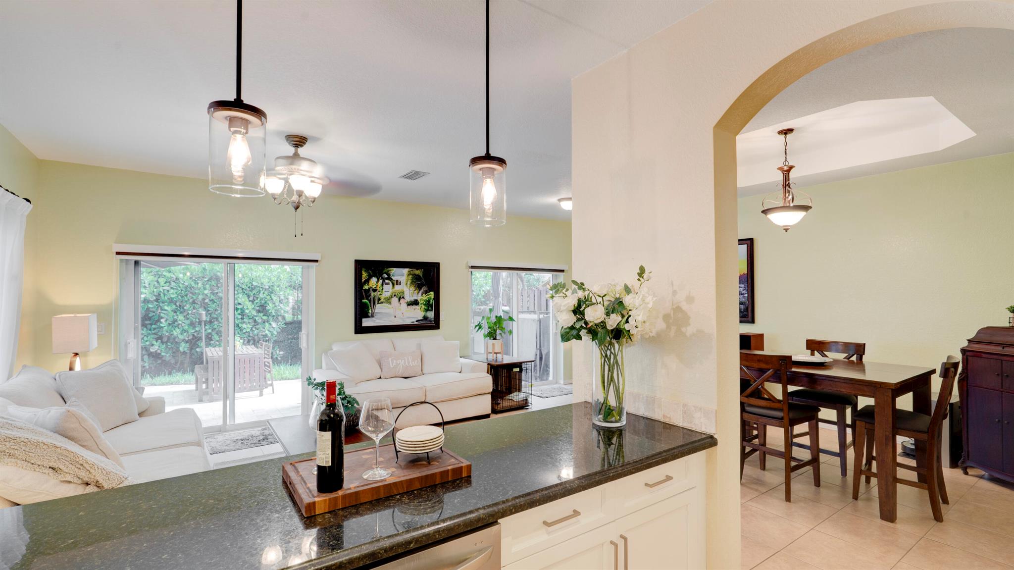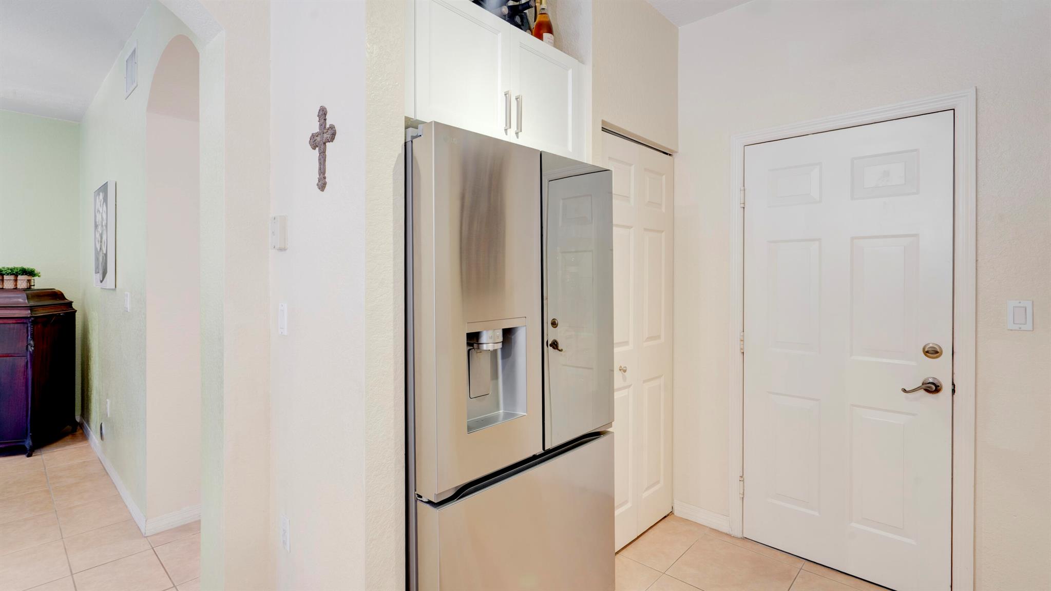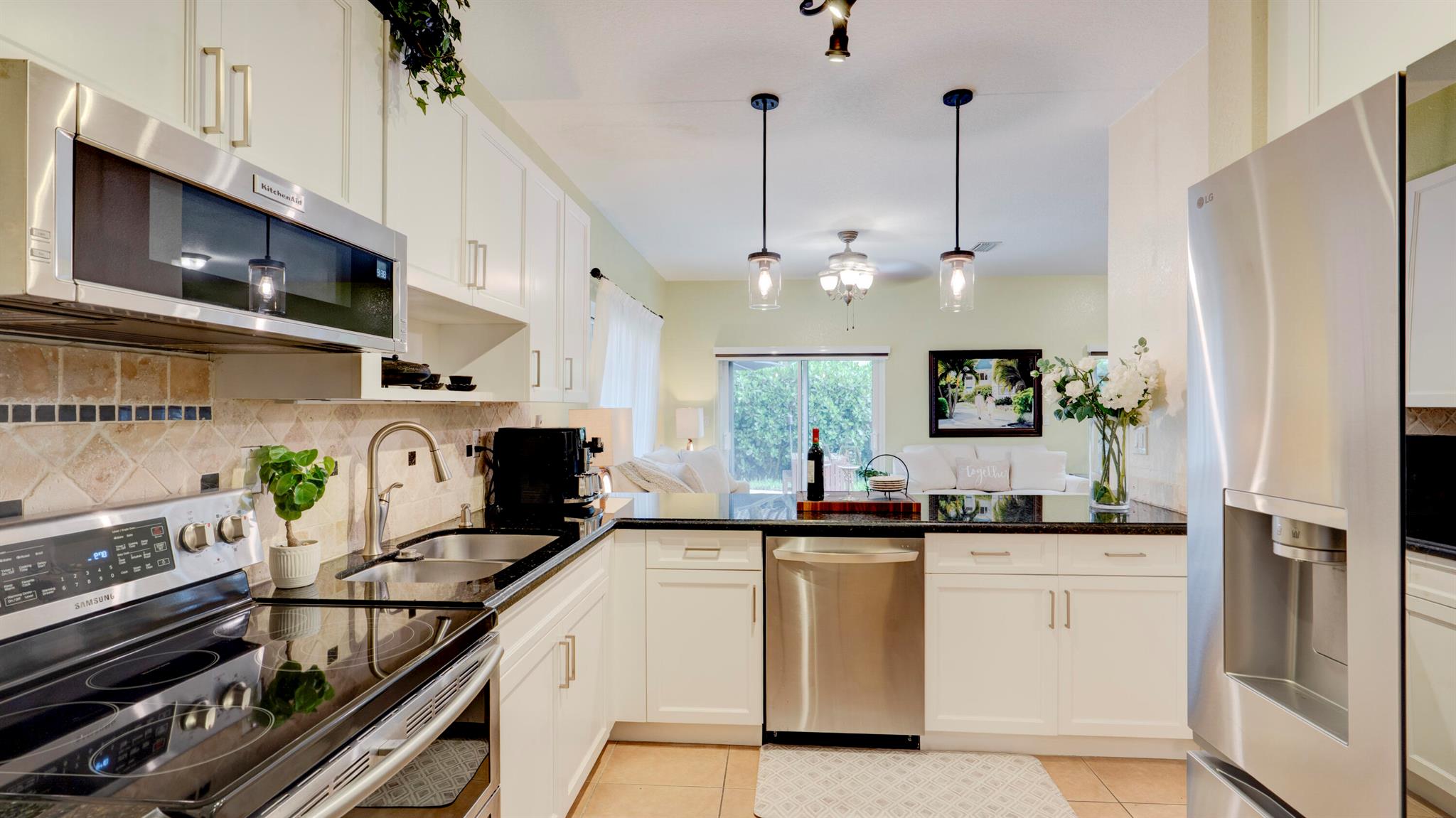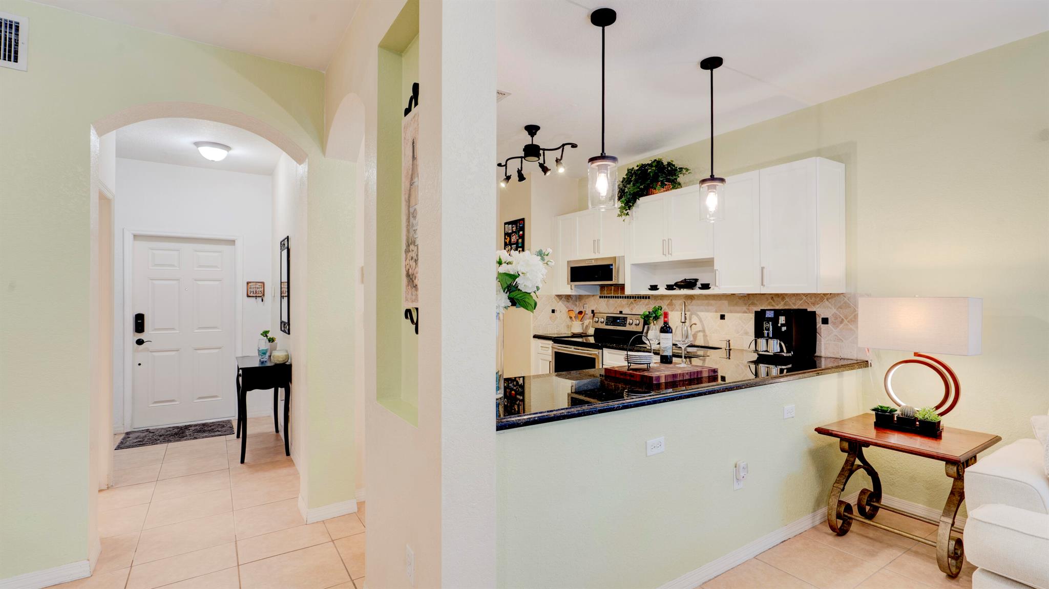 Beautiful corner-lot home featuring soaring ceilings, tray-ceiling dining, and master suite with garden tub. Kitchen boasts granite counters, remodeled cabinetry, SS appliances including new fridge, plus washer/dryer combo. Baths upgraded with quartz, cabinets, and new toilets. Modern touches include new laminate floors, stamped driveway, window treatments, and smart home features: Ecobee thermostat, Ring doorbell, outdoor cameras. Built for efficiency with impact windows/doors, accordion shutters, 2018 high-efficiency A/C under warranty, attic insulation, and full re-pipe. Backyard oasis offers travertine tile, lighting, mature Clusia hedges, and peaceful park views. Community amenities include clubhouse, fitness center, and pool. Move-in ready!