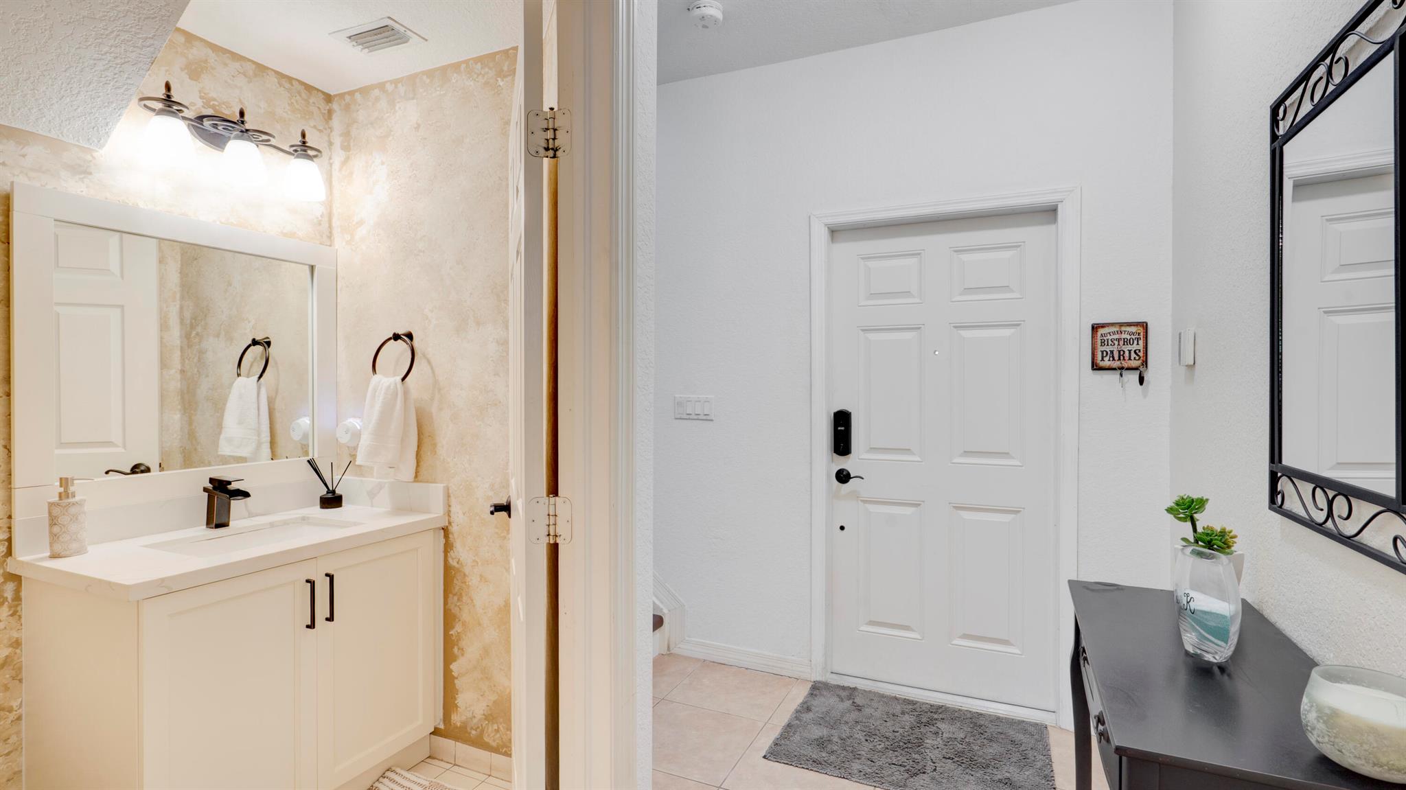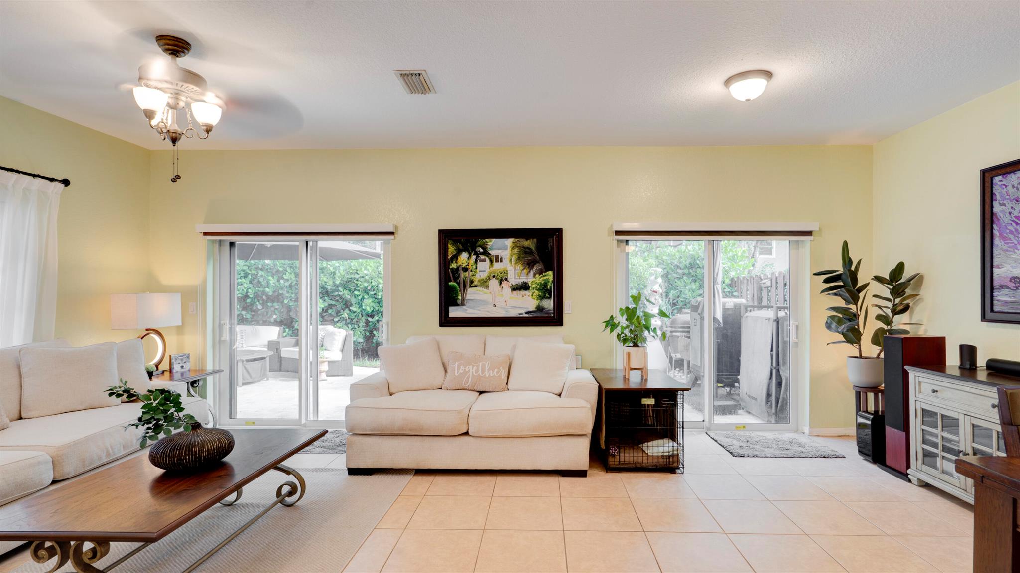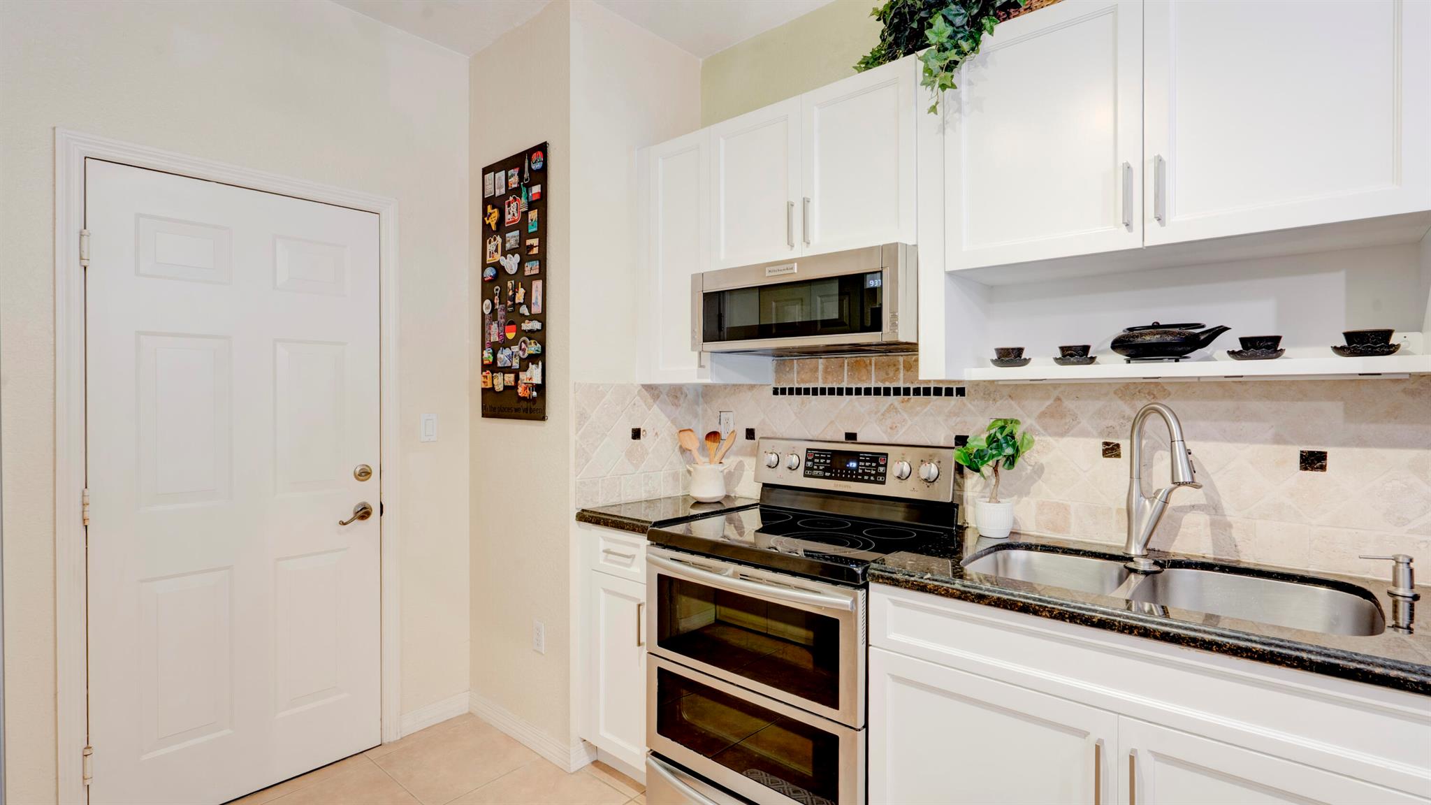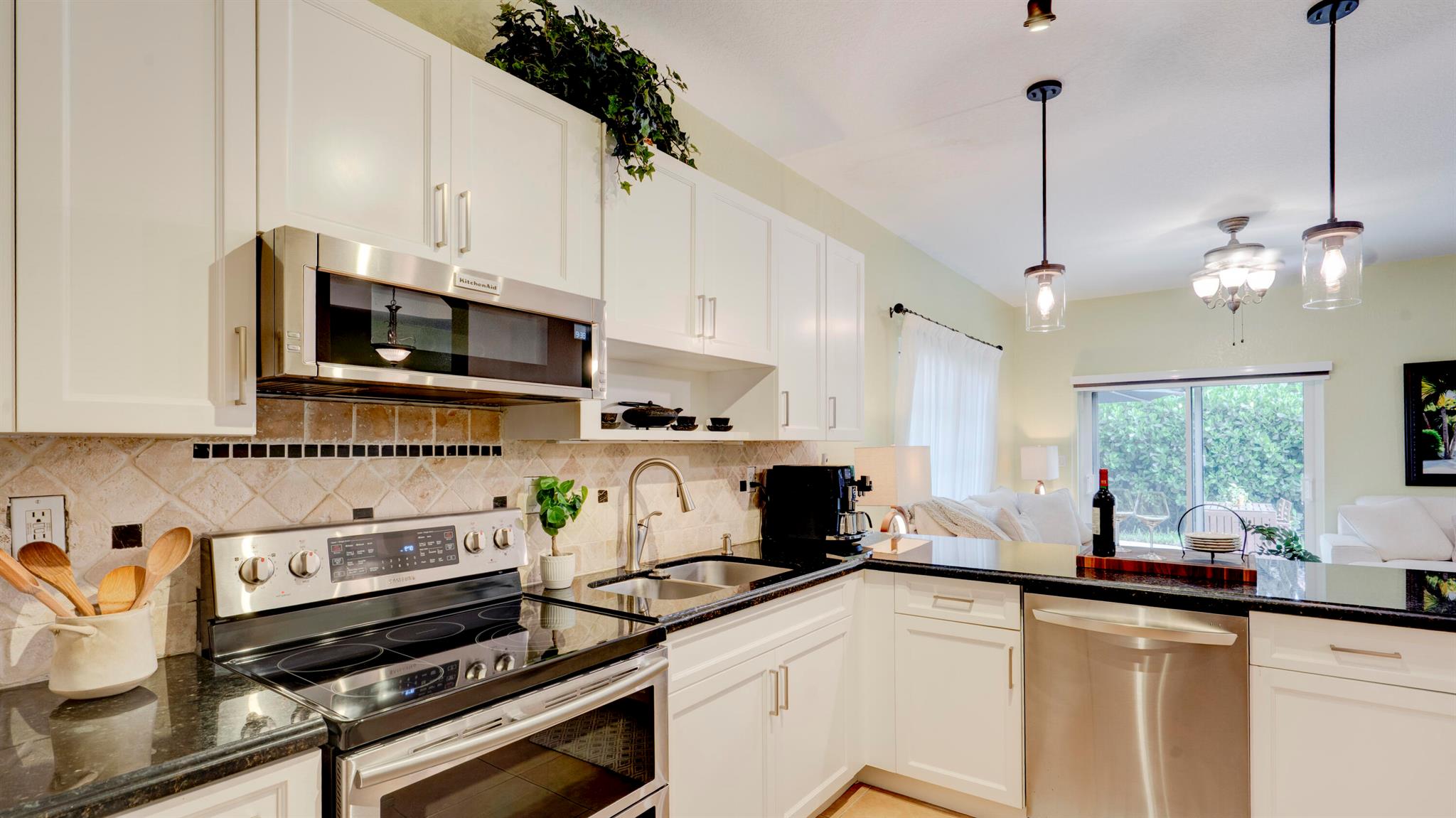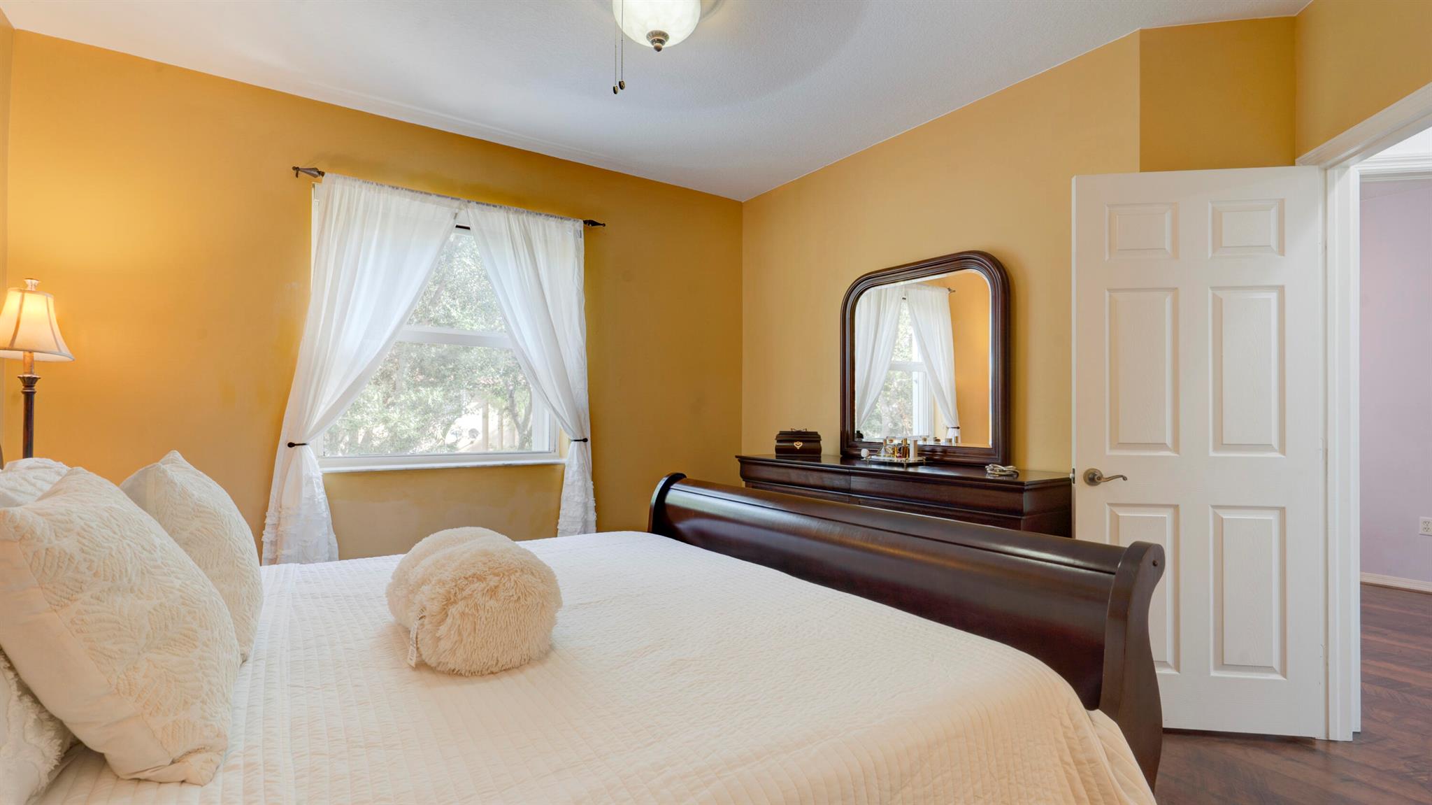 Beautiful corner-lot home featuring soaring ceilings, tray-ceiling dining, and master suite with garden tub. Kitchen boasts granite counters, remodeled cabinetry, SS appliances including new fridge, plus washer/dryer combo. Baths upgraded with quartz, cabinets, and new toilets. Modern touches include new laminate floors, stamped driveway, window treatments, and smart home features: Ecobee thermostat, Ring doorbell, outdoor cameras. Built for efficiency with impact windows/doors, accordion shutters, 2018 high-efficiency A/C under warranty, attic insulation, and full re-pipe. Backyard oasis offers travertine tile, lighting, mature Clusia hedges, and peaceful park views. Community amenities include clubhouse, fitness center, and pool. Move-in ready!