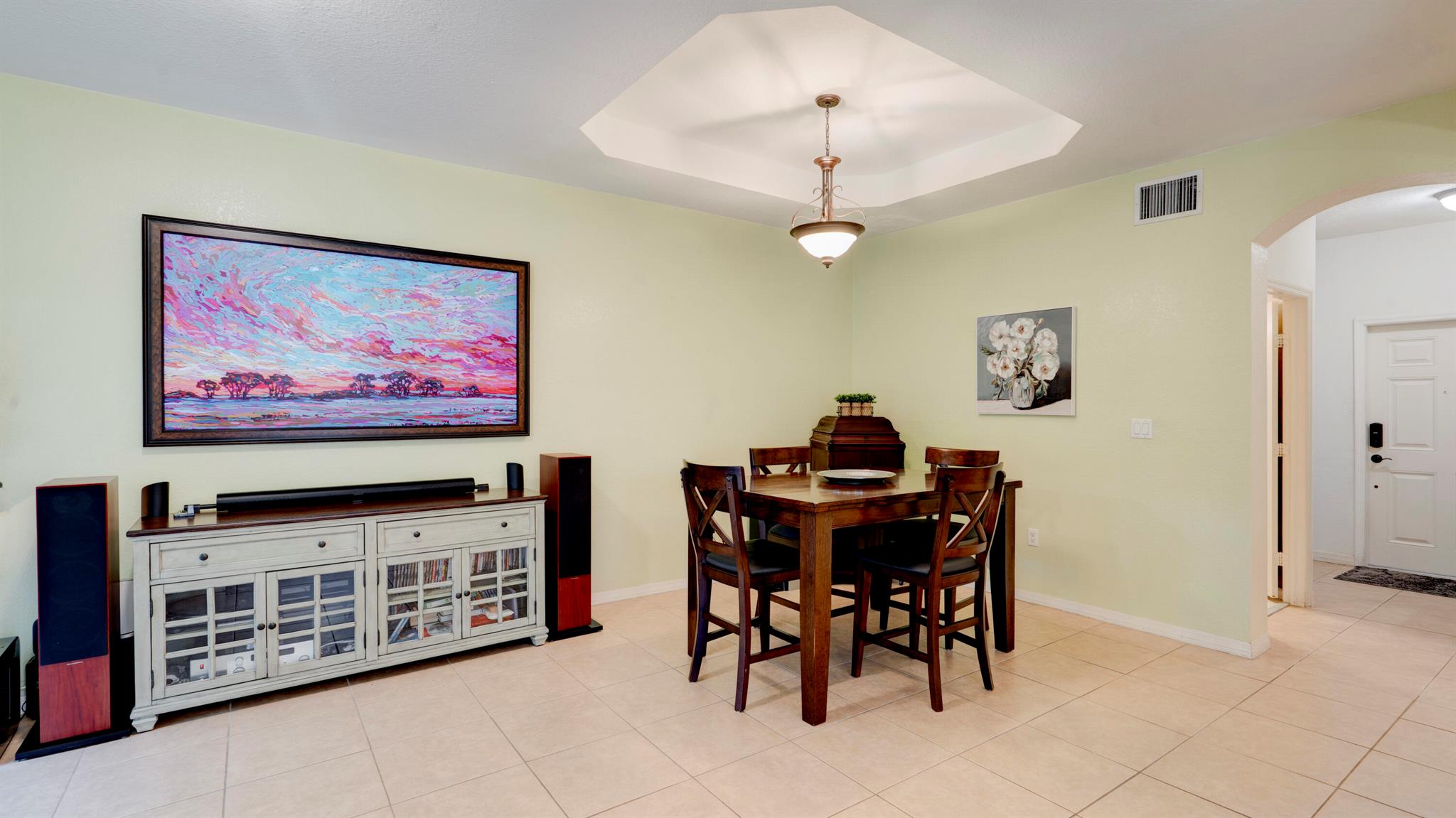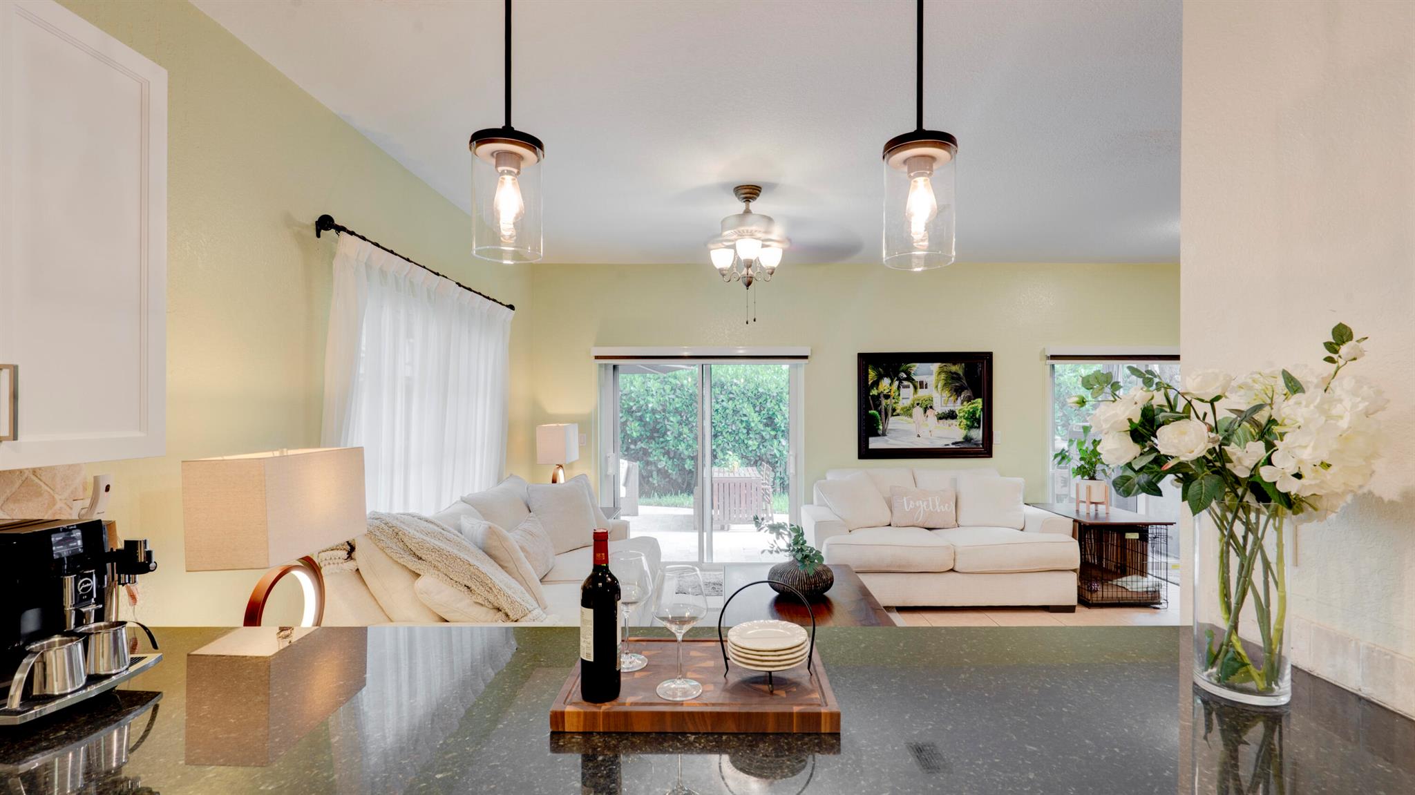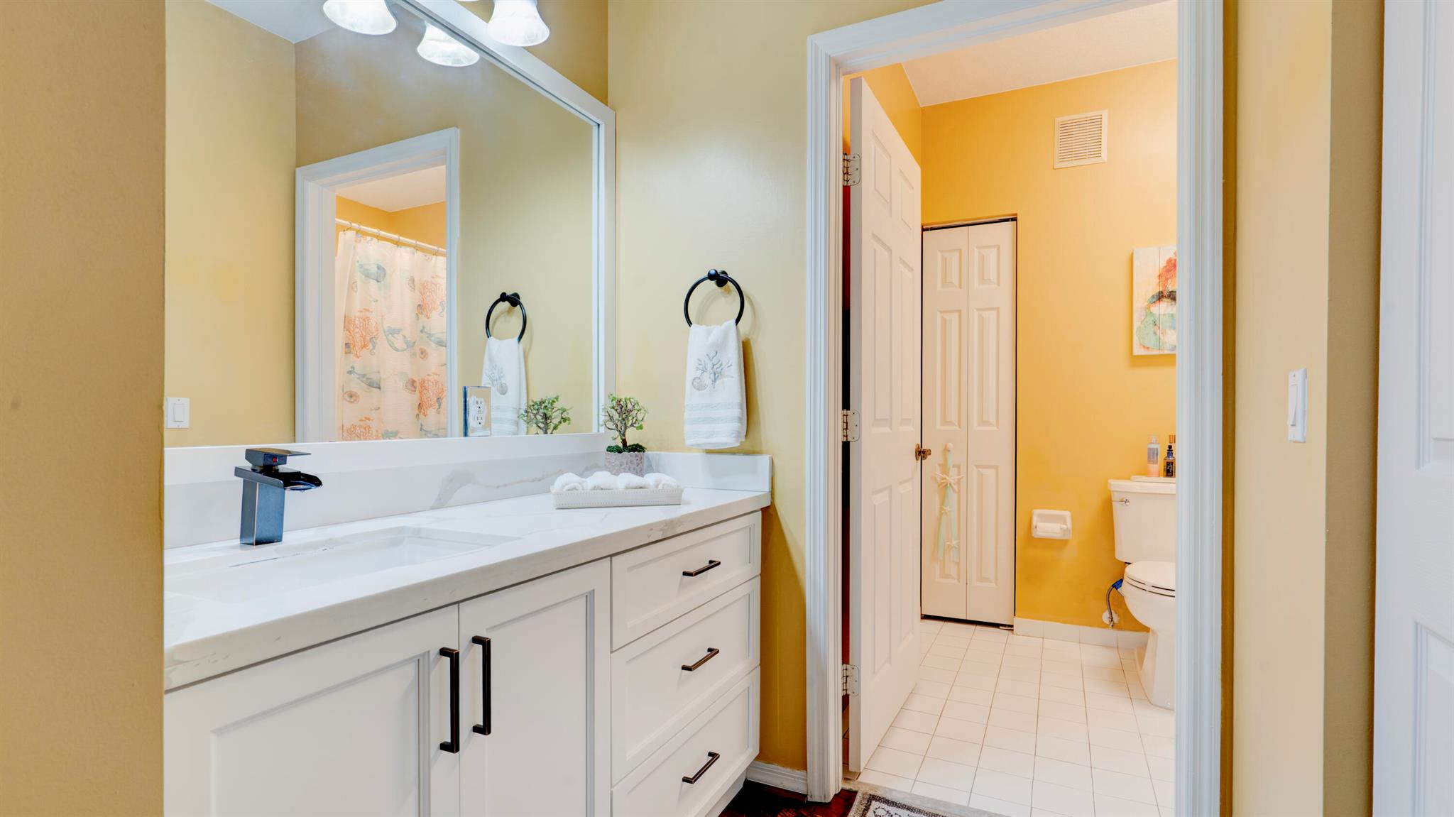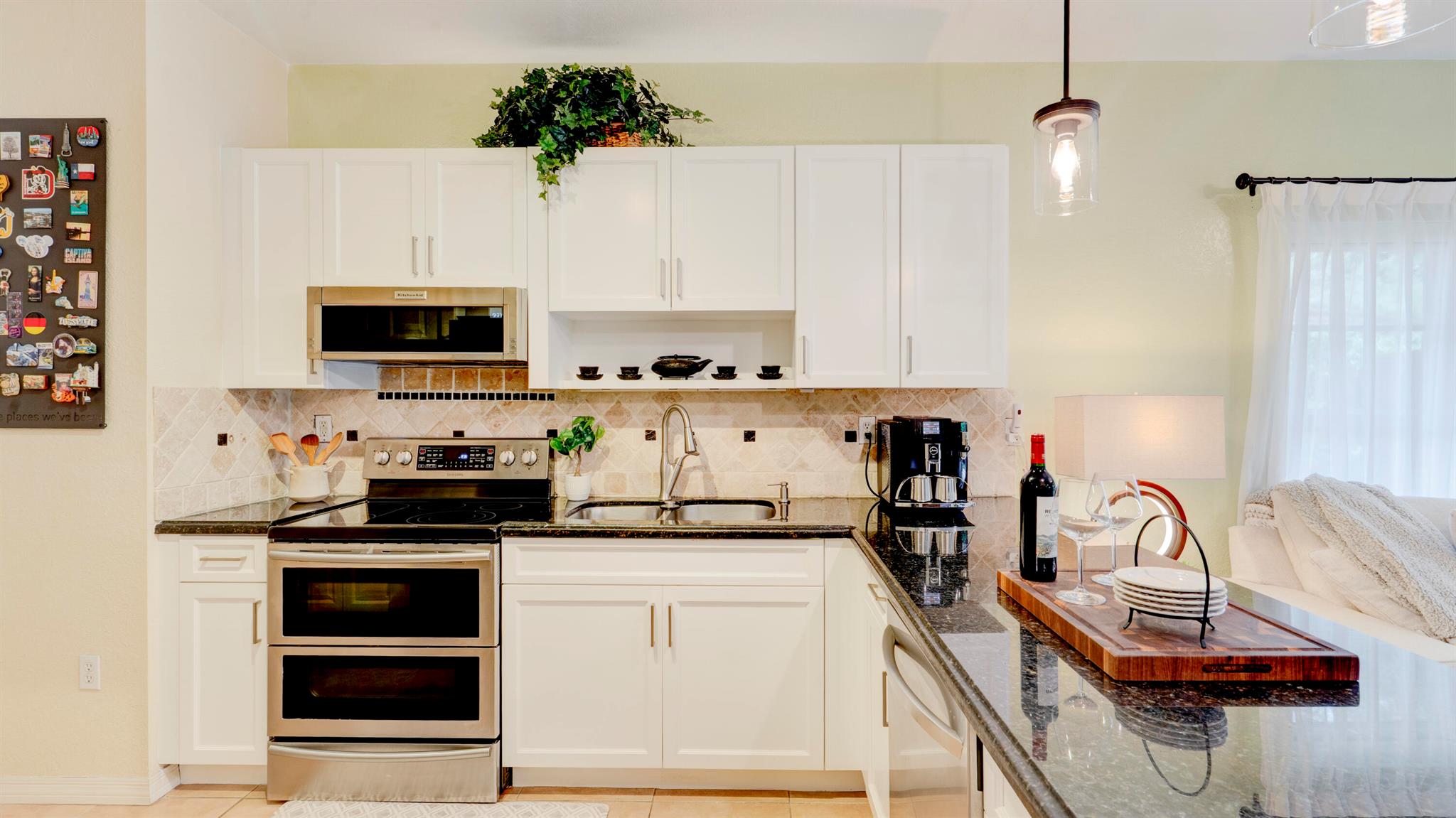 Beautiful corner-lot home featuring soaring ceilings, tray-ceiling dining, and master suite with garden tub. Kitchen boasts granite counters, remodeled cabinetry, SS appliances including new fridge, plus washer/dryer combo. Baths upgraded with quartz, cabinets, and new toilets. Modern touches include new laminate floors, stamped driveway, window treatments, and smart home features: Ecobee thermostat, Ring doorbell, outdoor cameras. Built for efficiency with impact windows/doors, accordion shutters, 2018 high-efficiency A/C under warranty, attic insulation, and full re-pipe. Backyard oasis offers travertine tile, lighting, mature Clusia hedges, and peaceful park views. Community amenities include clubhouse, fitness center, and pool. Move-in ready!