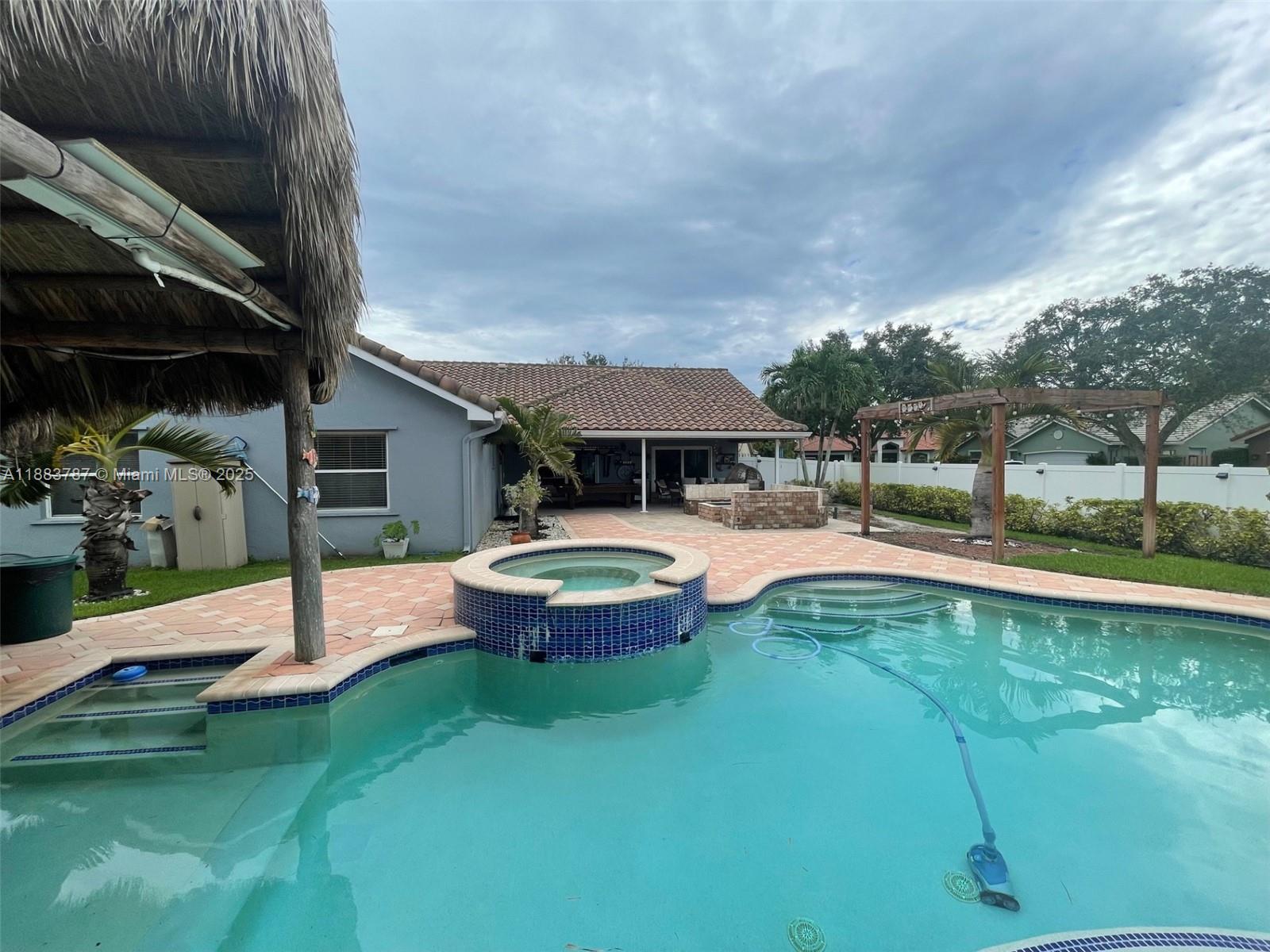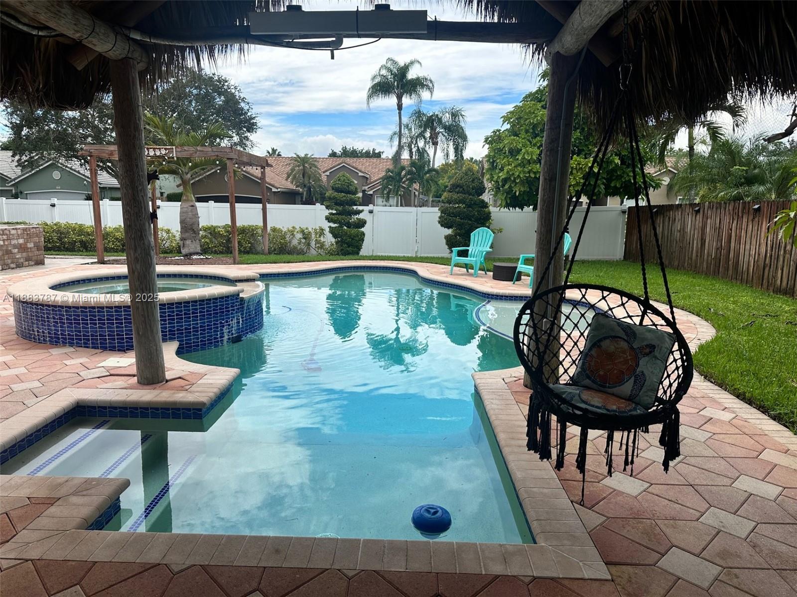 Beautifully maintained 4br/2.5 bth split floor plan on a very large and desirable corner lot. Home features huge front and back yard with a pool, tiki hut and fire pit area. Large tile through, open and remodeled kitchen with quartz counter tops, remodeled bathrooms, recently purchased appliances and washer and dryer in a separated room, vaulted ceilings and customs cabinetry. Great location to raise a family with excellent schools and easy highway access. 5 minutes away from Sawgrass Mills and plenty of restaurants in the area.
