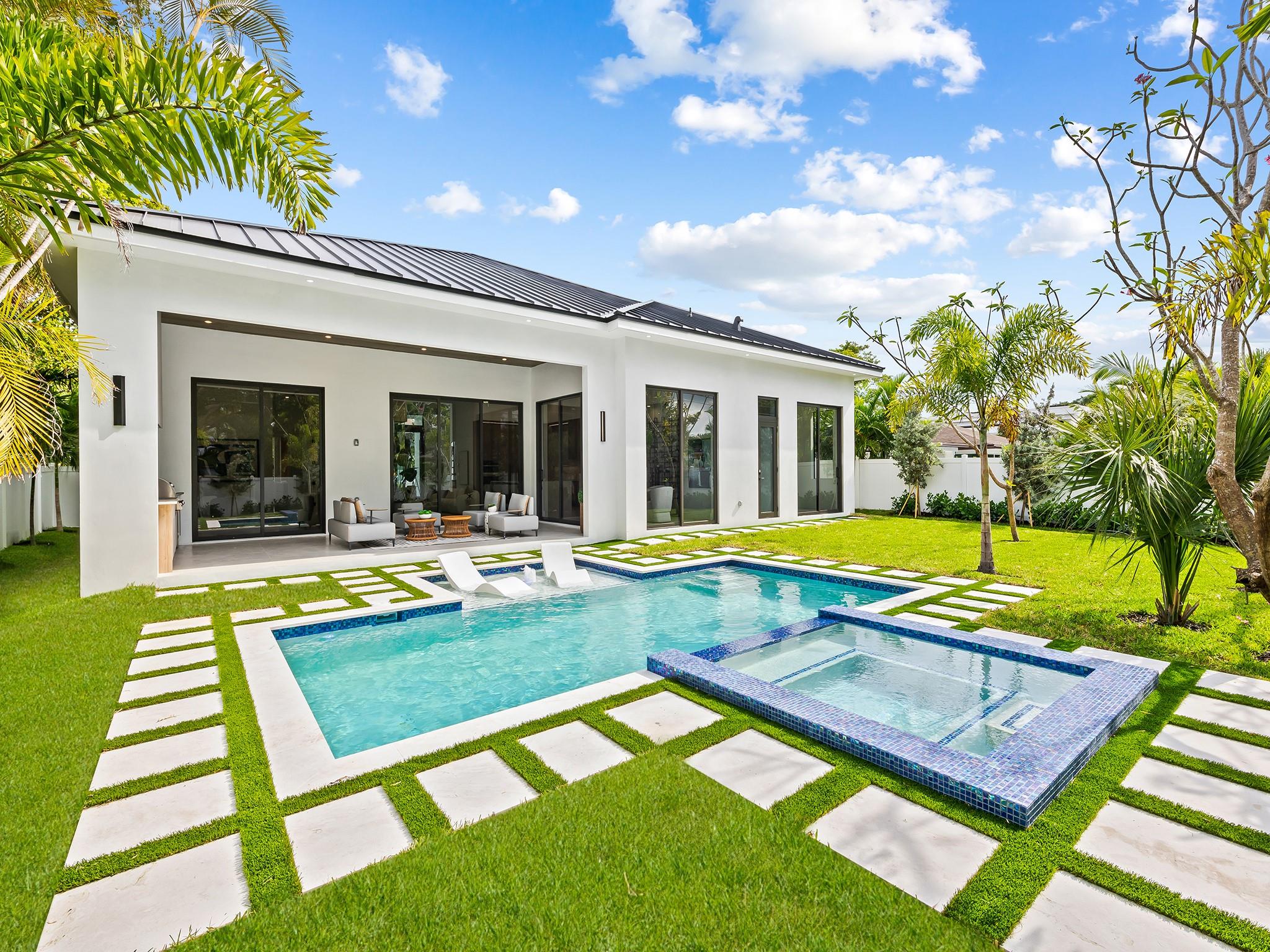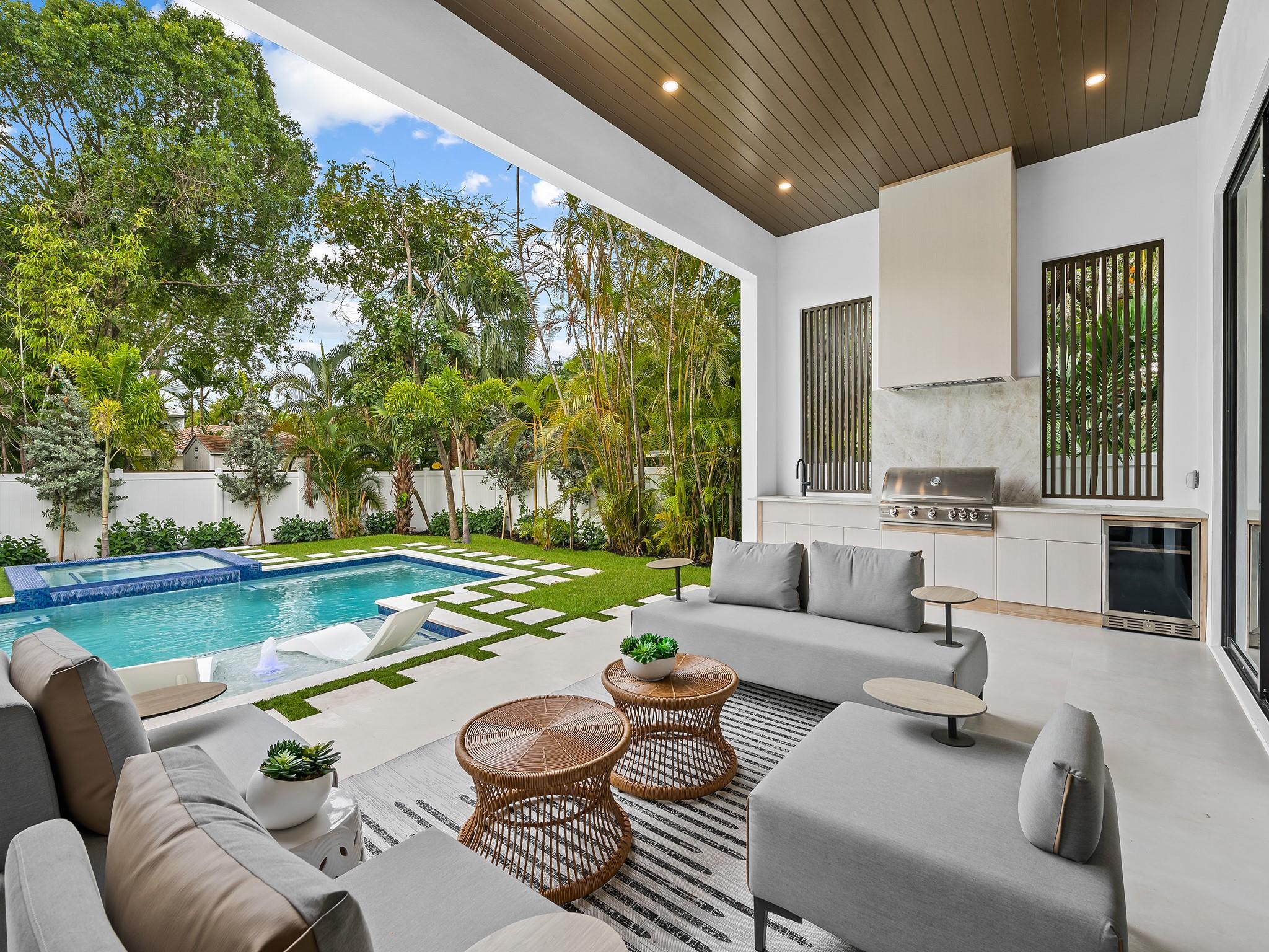 NEW CONSTRUCTION BY MSK HOMES | The Pinnacle of Poinsettia Heights | Coveted Street | 10,000+ Sq ft Lot | One story, Soaring 13' ceilings thru out | 4,042 total sq ft. Luminous open concept layout & curated designer finishes. Culinary kitchen with 12'+ center island, premium appliances & hidden walk-in pantry. The primary suite offers an oversized custom WIC w/glass island & spa inspired bathrm outfitted with Kohler Anthem fixtures. 10' glass walls open to a covered lanai & summer kitchen constructed of marine-grade cabinetry facing the pool, spa & waterfall framed in tropical landscaping. LED tray ceilings, Italian porcelain flooring, integrated speaker system, smart home features, & elevated garage door for car lifts. Delivery April 2026. Customization is available. Sq Ft per architect.