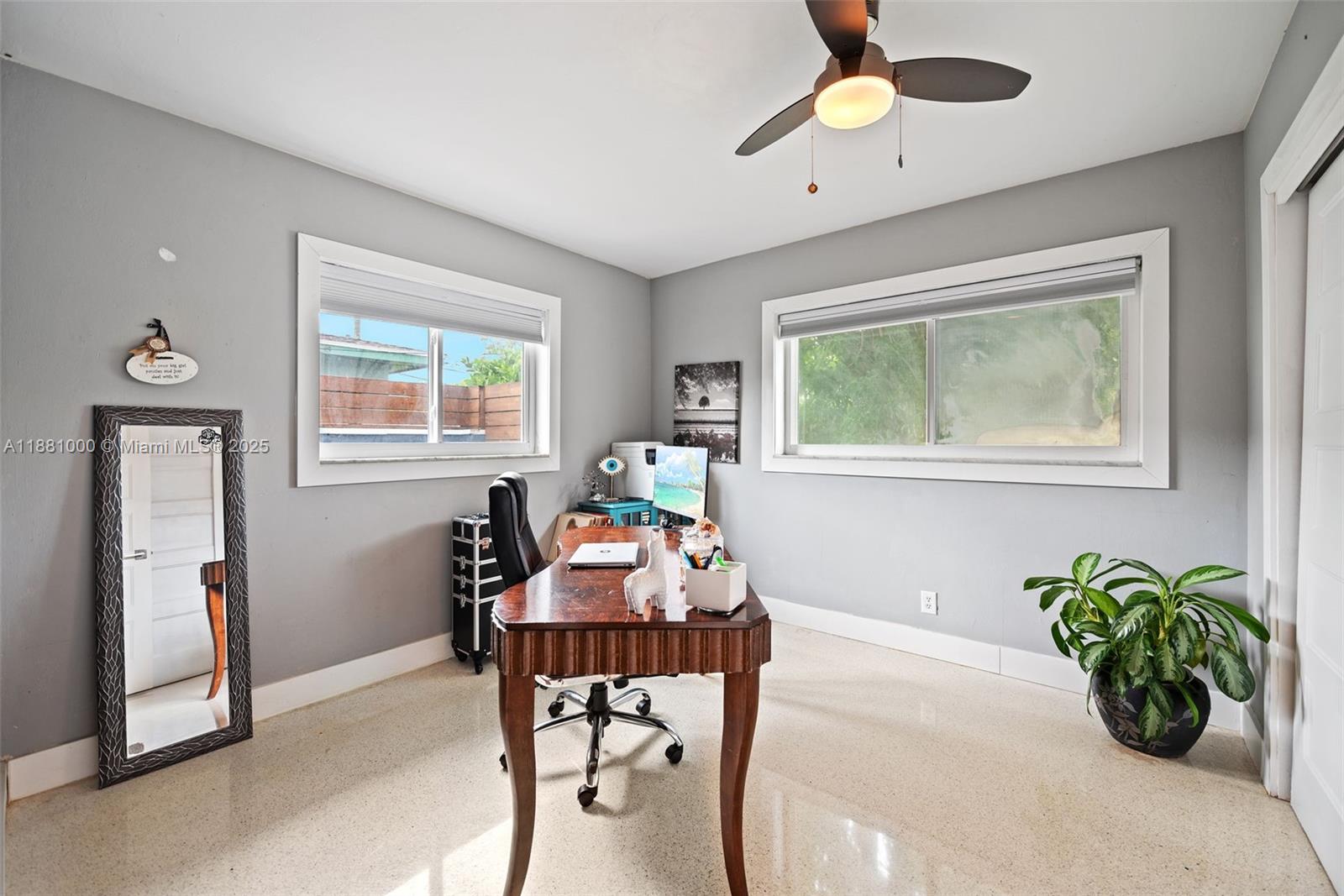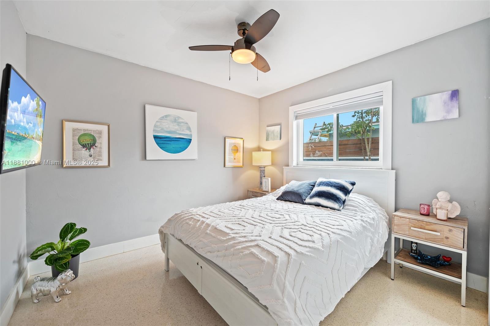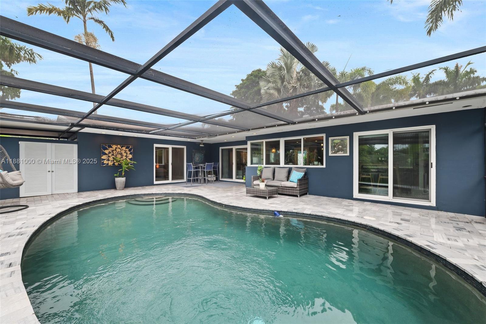Discover timeless Mid-Century Modern style in this 4BR/2BA single-story home built in 1962. Enter through a private gated courtyard and step inside to find terrazzo floors throughout the main living areas and soaring pine wood ceilings in the living room and kitchen. Walls of impact windows and doors flood the space with natural light while offering stunning, unobstructed views of the Middle River. The open layout seamlessly connects indoor and outdoor living, leading to a screened-in pool and tranquil backyard retreat. Perfect for both relaxing and entertaining, this waterfront gem combines charm, character, tranquility and peace of mind with modern upgrades.