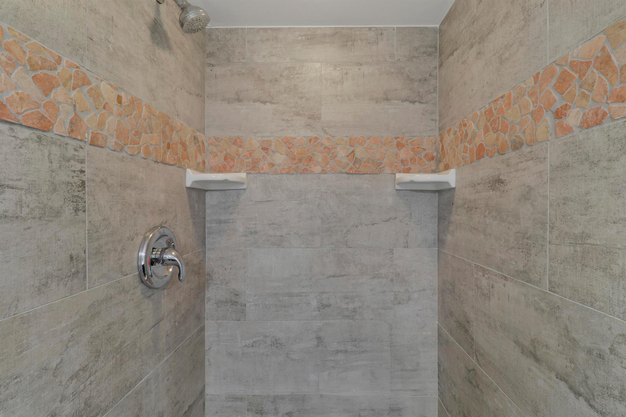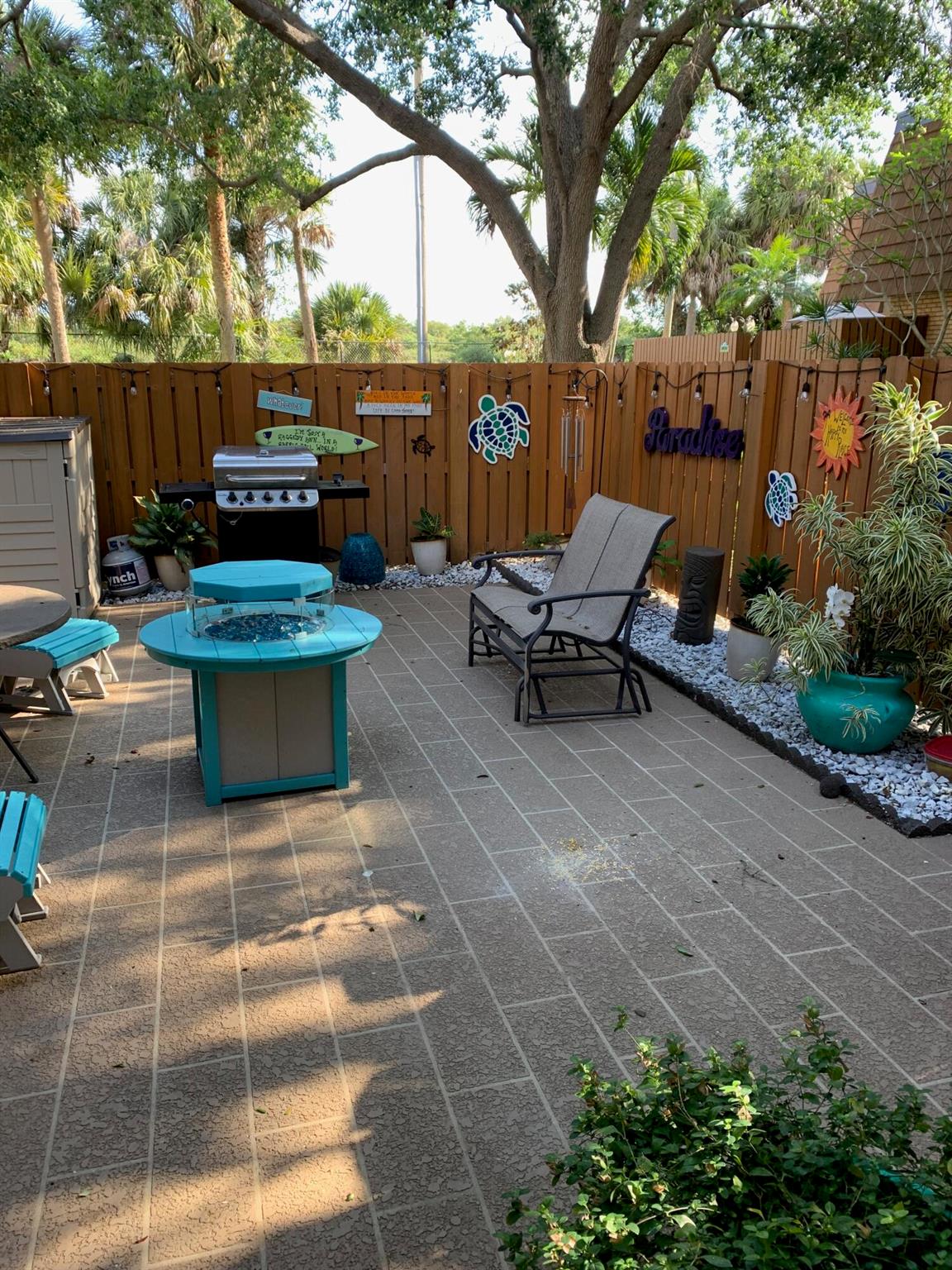 Discover your dream coastal retreat just minutes from Marcinski Beach and the Pier. This beautifully updated home features two spacious primary bedrooms and two and a half bathrooms. The newly renovated kitchen boasts stunning blue lower cabinets, elegant gray uppers, and quartz countertops, complemented by a state-of-the-art stainless steel appliance package with an oven air fryer. Enjoy the exquisite Brazilian pecan porcelain tile floors throughout, with cozy Berber carpet on the stairs. Modern conveniences include hurricane impact glass sliders, a hurricane-resistant front door, and a new washer/dryer. The private fenced patio with SunDek flooring offers a serene space, perfect for relaxation, complete with a shed for extra storage. The knockdown ceiling, lighting and paint scheme add