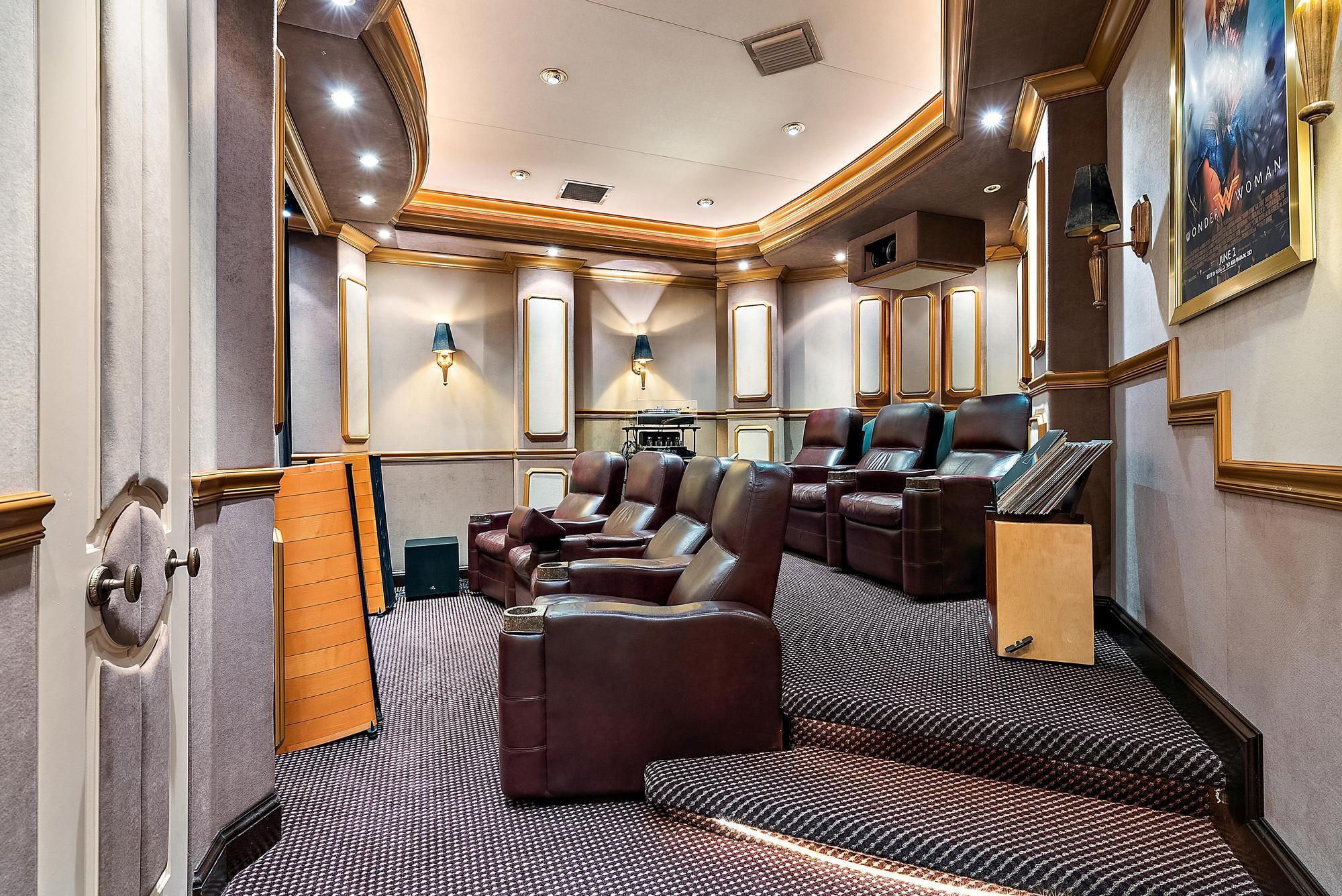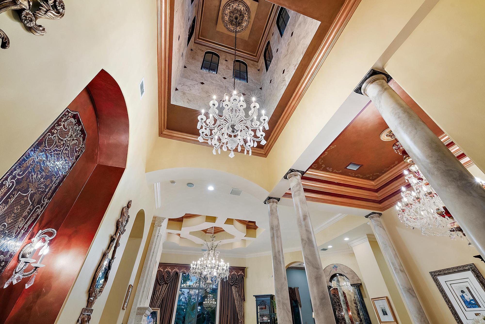 This extraordinary single-story estate in prestigious Bay Hill Estates offers the ultimate blend of timeless craftsmanship and modern convenience. Spanning over 5,400 square feet on a private one-acre lakefront lot, this residence is a showcase of artisan finishes, state-of-the-art upgrades, and resort-style amenities. From the moment you step into the grand foyer, graced with inlaid marble floors and soaring coffered ceilings, it is clear that every detail of this home has been designed with sophistication in mind. The living spaces are adorned with custom millwork, hand-selected marbles, solid wood cabinetry, and designer chandeliers, while a coral stone fireplace anchors the formal living room with warmth and elegance.