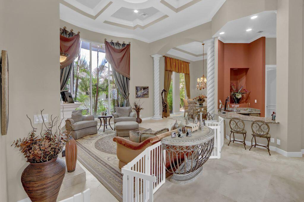GOLF MEMBERSHIP AVAILABLE & CAN CLOSE BY OCT 31! Don't miss this opportunity for a GOLF MEMBERSHIP DAY 1 before the increase in initiation & transferability. This charming one-story courtyard of 3 bedrooms + office, 31/2 baths & 3-car garage is elegant & tastefully appointed featuring volume ceilings with crown moldings; Saturnia marble floors & neutral carpet; an inviting Living Room with an electric fireplace & wet bar; Family Room entertainment center; built-in office in Bedroom 4; solid core molded doors; custom window drapes & shades.The kitchen features maple cabinetry, granite counters,tumbled marble backsplash,butler's pantry and charming breakfast nook. Roof-2022; water heater-2023; pool resurfaced & tiles-2023; circular driveway;epoxy garage floor; accordion hurricane shutters.