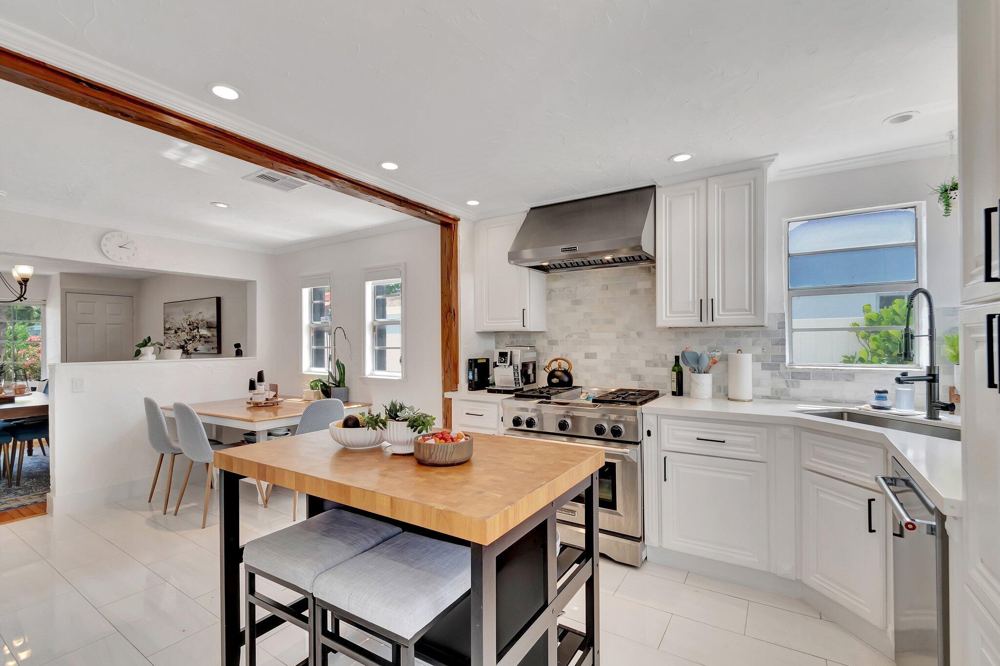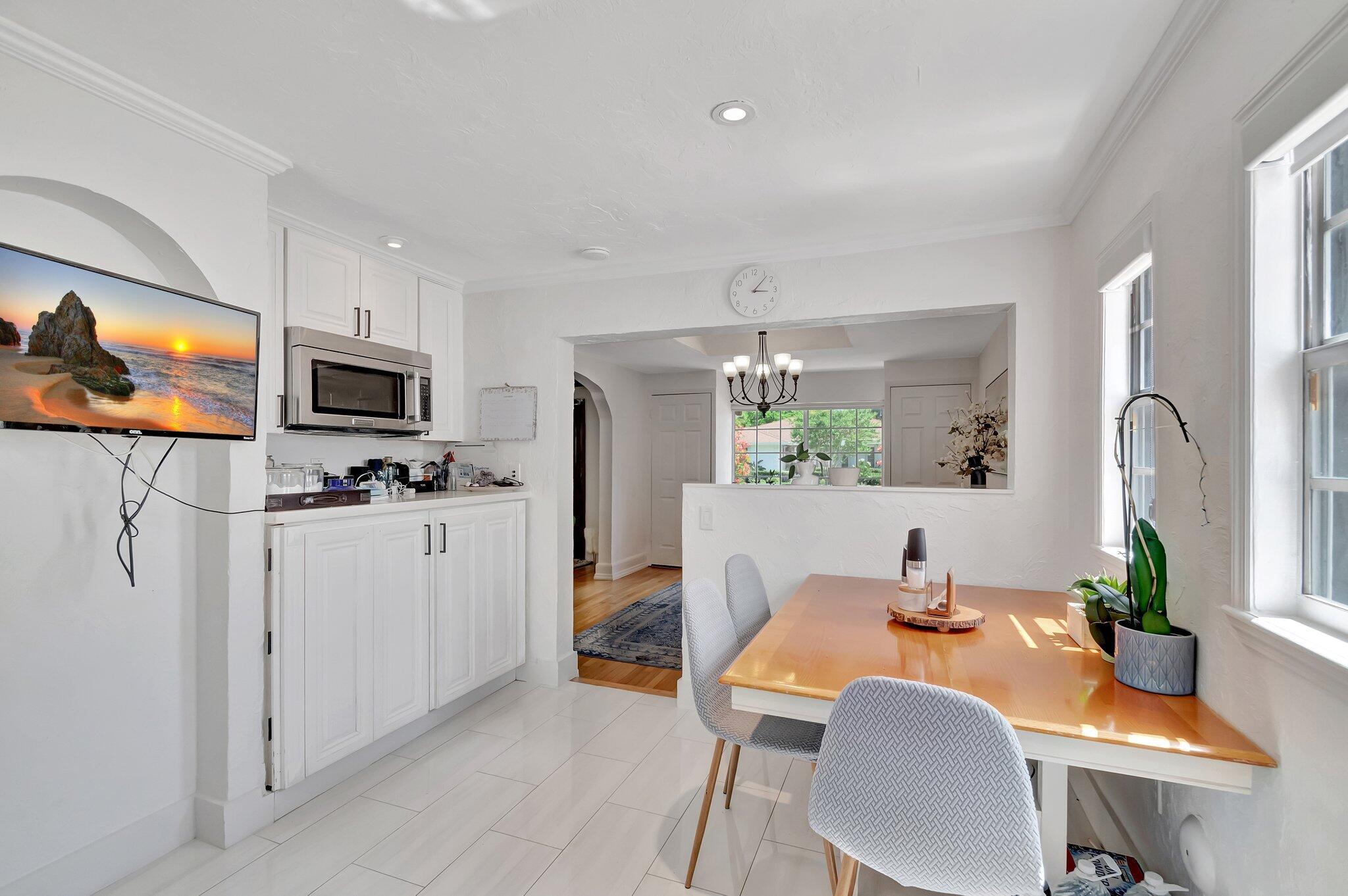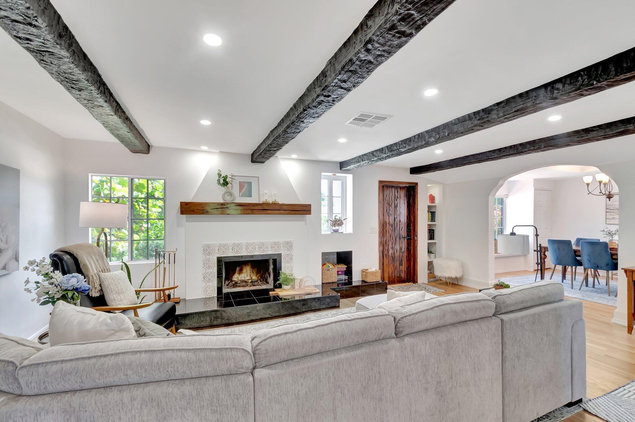 Step through the lovingly restored Pecky Cypress door of this 1923 impressive dwelling, into a modernly updated home. Located in the Historic District of College Park in Lake Worth Beach, is a blend of old charm and new comfort. This bright open living area with wooden beams has lumen lighting, working fireplace and restored hardwood flooring throughout. In the dining room with recessed wood inlaid tray ceiling, double hung windows and a window seat below. Esthetically modern eat in kitchen includes a country farm sink, gas range, stainless steel appliances and new ceramic tile floor. The cozy terracotta tiled den with french doors leading out to covered patio.Notable backyard's size and freeform pool make enjoyment and entertaining top on the list. Four bedrooms and bathroom upstairs