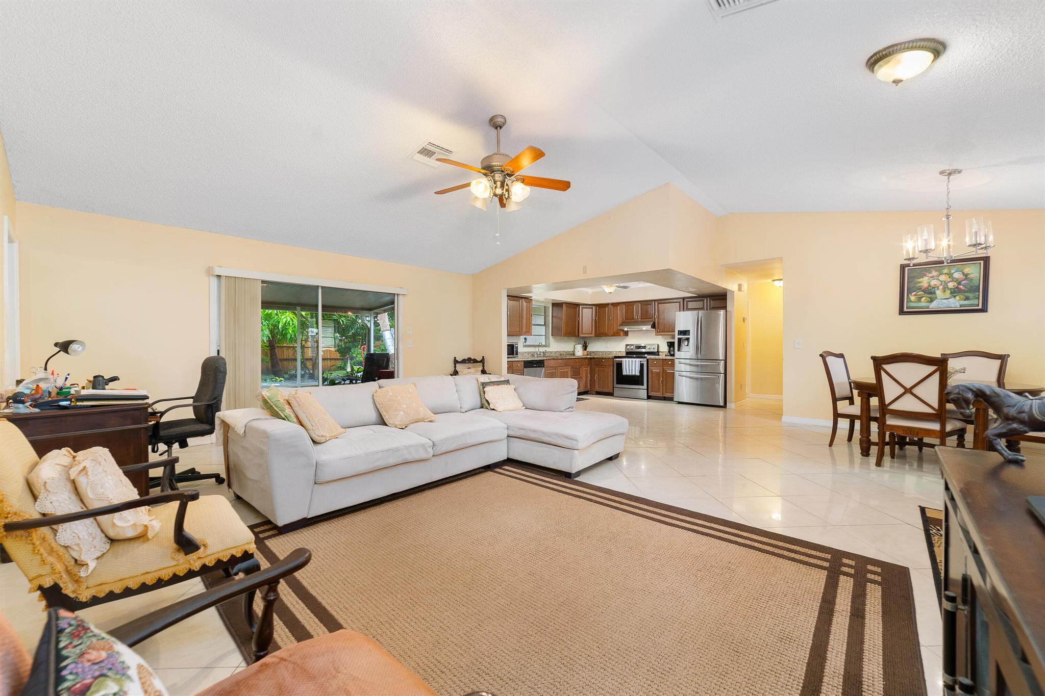 This well-maintained home shows like a model and offers a spacious open floor plan designed for both comfort and style. The main living areas feature tile flooring throughout, while the kitchen is beautifully appointed with granite countertops and stainless steel appliances. A generous primary suite is complemented by two full bathrooms, creating a functional layout for family or guests. Step outside to enjoy Florida living at its best. The large screened patio overlooks a fenced backyard that provides privacy and tranquility. This outdoor oasis is enhanced by a tree garden with an abundance of rare tropical fruits (mango, soursop, june plum, sweetsop, naseberry, avocado trees, custard apple, star fruit).