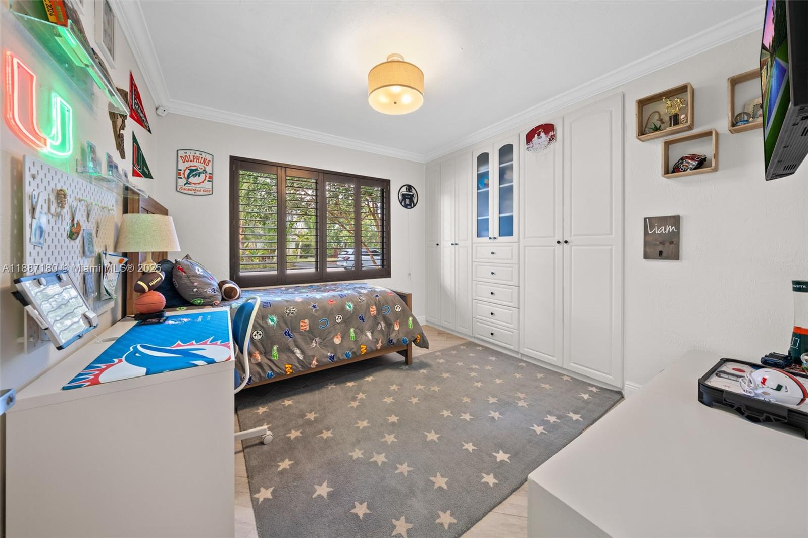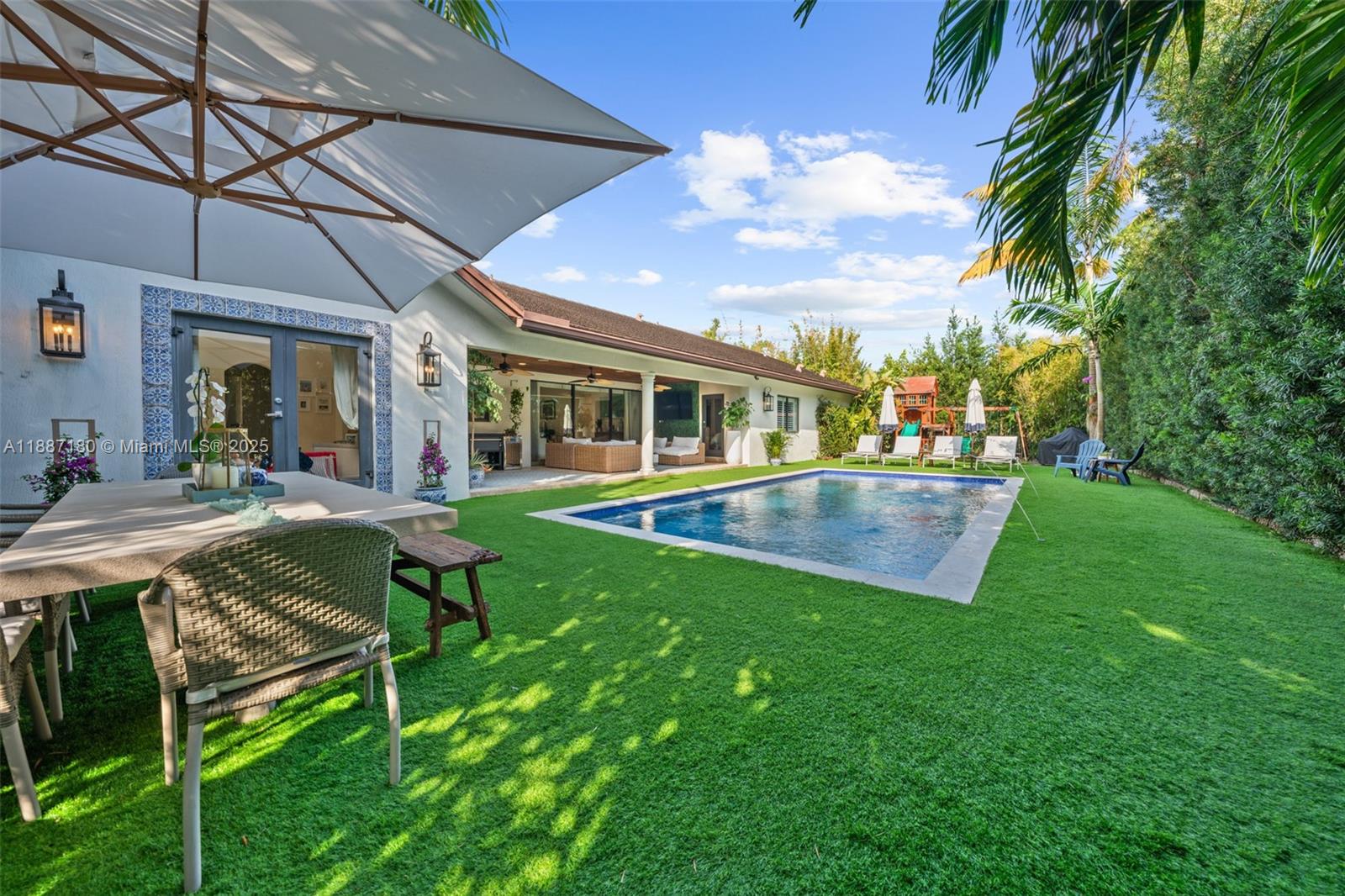Experience luxury living at its finest in this exquisite South Miami home, perfectly situated on a private, tranquil street. This stunning residence boasts soaring ceilings, elegant high-hat lighting, and seamless surround sound throughout. The gourmet Ital Kraft kitchen features premium Thermador appliances, ideal for culinary enthusiasts. Indulge in the spacious primary suite with a custom walk-in closet and a spa-inspired bathroom retreat. Impact windows, plantation shutters, and a tankless gas water heater ensure comfort and peace of mind. Step outside to your backyard oasis — a covered patio, sleek saltwater heated pool, and lush artificial turf create the perfect setting for relaxation and entertaining.