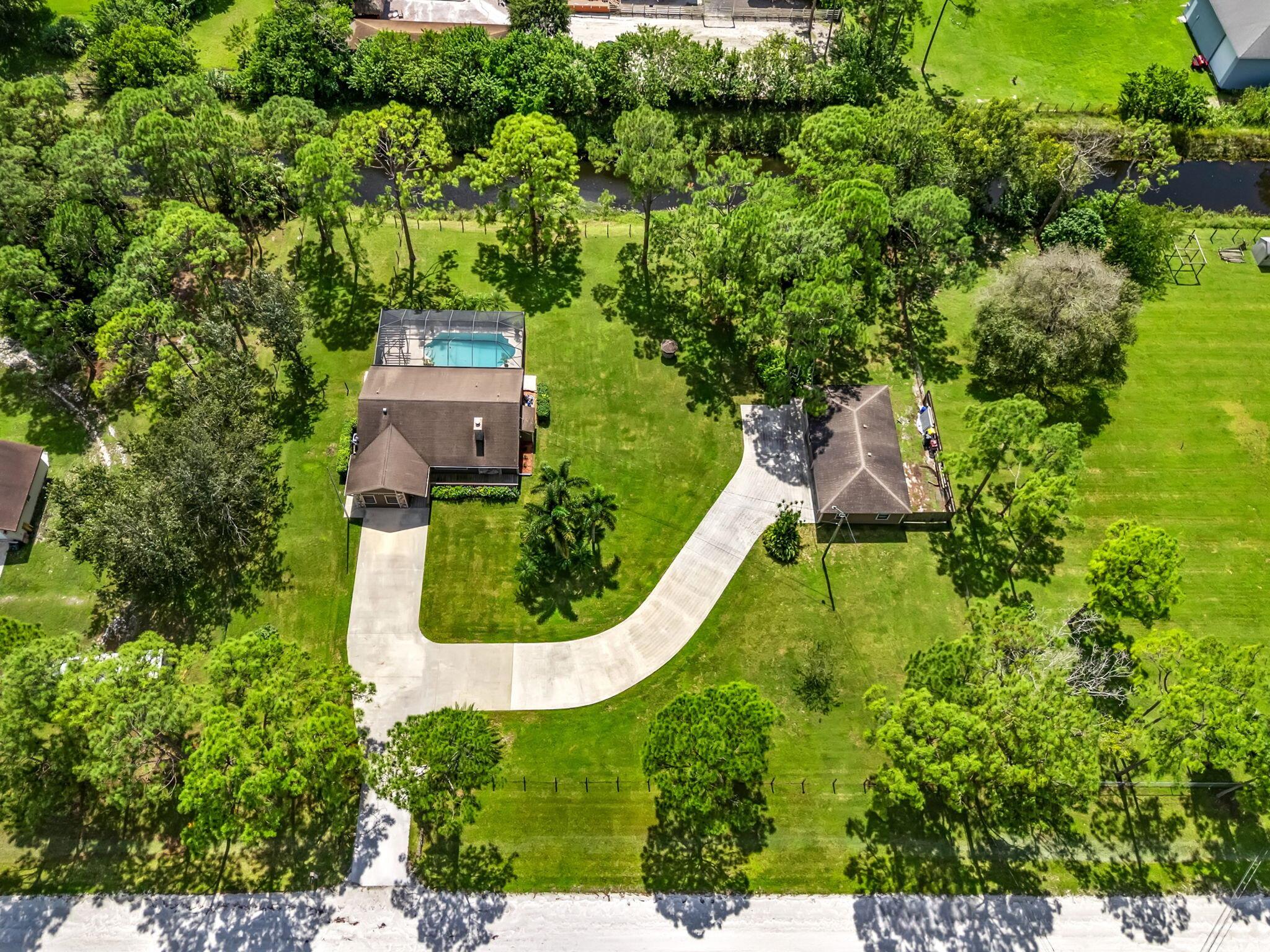 Welcome to this charming 3-bedroom, 2-bathroom home nestled on 1.29 acres in the heart of Loxahatchee. Built in 1990, this single-story home offers nearly 1,400 sq. ft. of living space with a split-bedroom layout, vaulted ceilings, and an inviting floor plan. Large detached garage that is 1,057 sq ft (fits up to 4 cars). The kitchen is equipped with all stainless steel appliances and opens to spacious living and dining areas, perfect for gatherings and everyday living. The primary suite includes ample closet space and a private bath, while the additional bedrooms provide comfort and flexibility for family or guests. Step outside and enjoy your private Florida oasis featuring a sparkling screened pool, large patio, and plenty of yard space with canal frontage for added views and privacy.