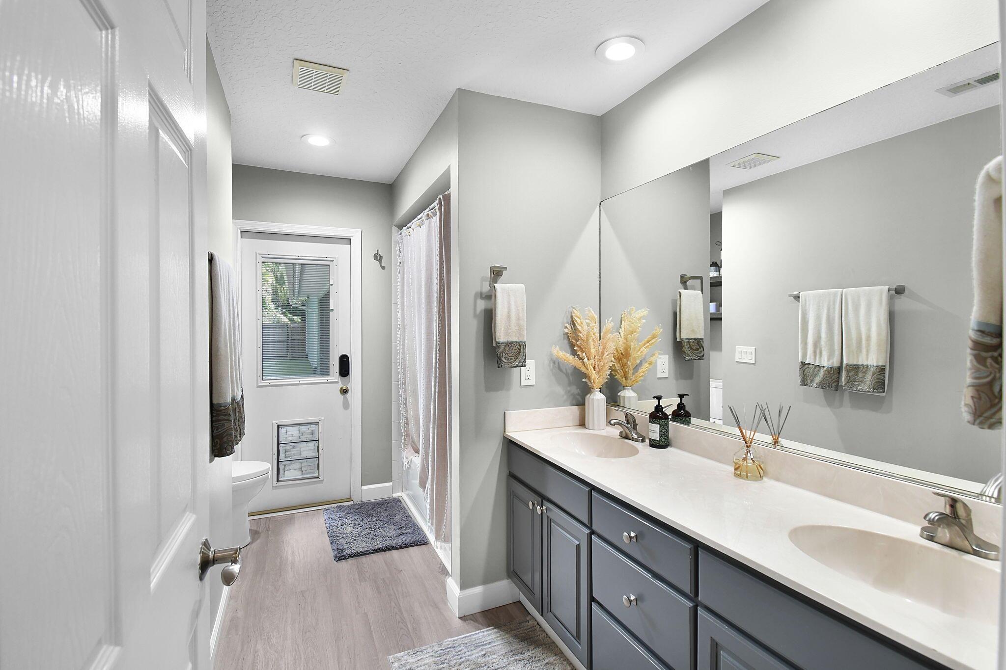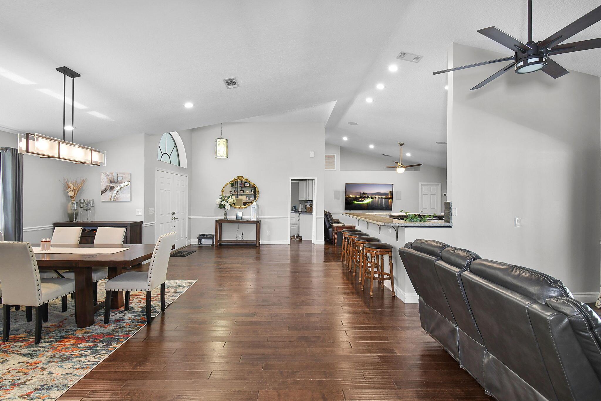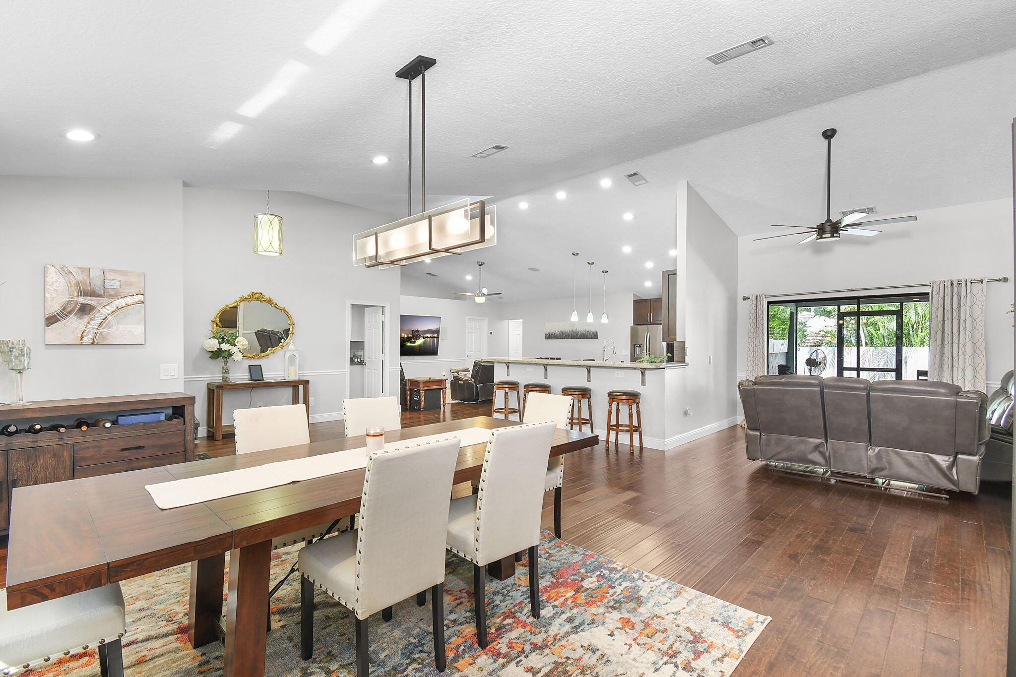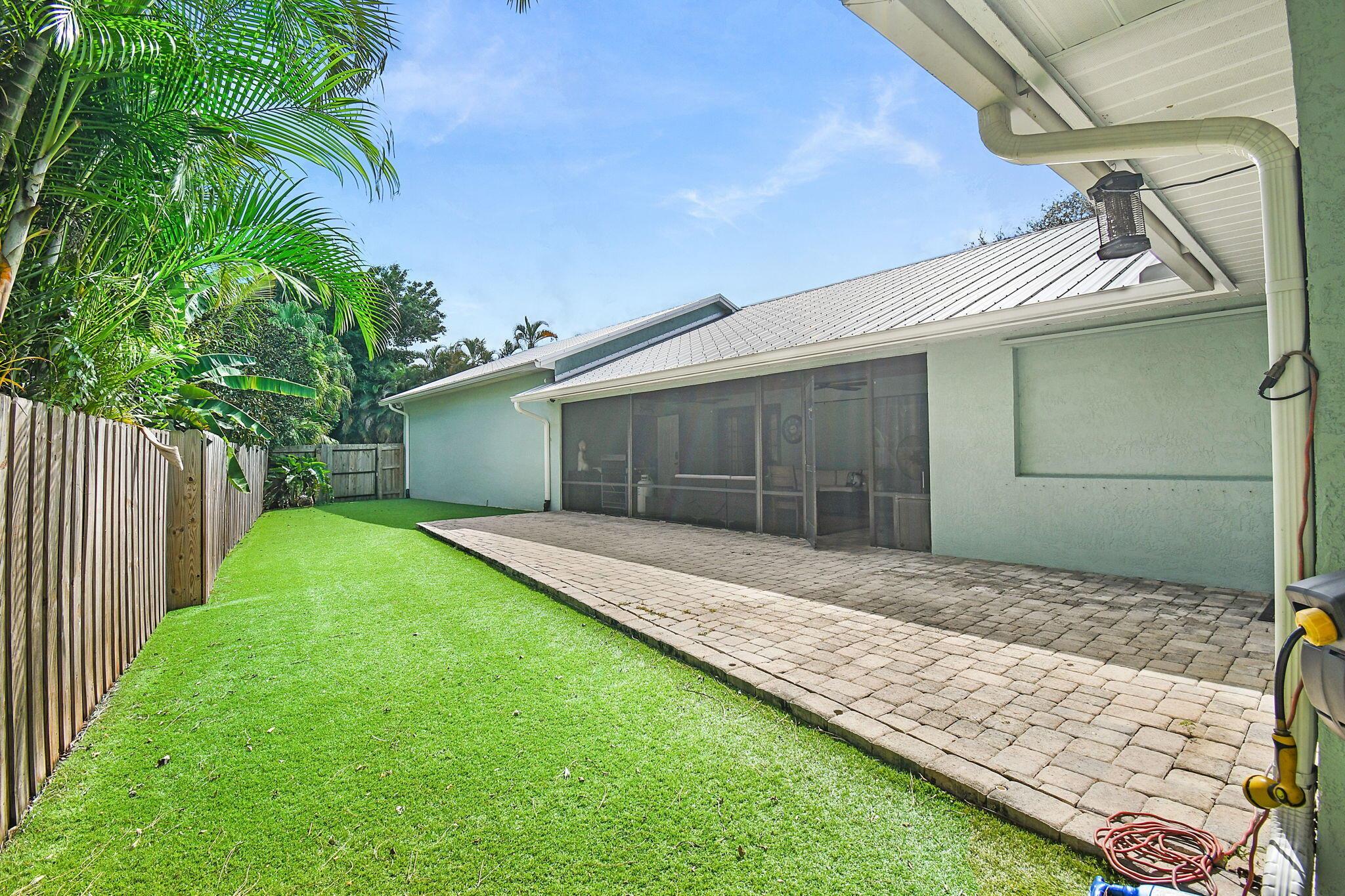 Don't miss your chance to own this charming 4-bedroom home nestled in the peaceful cul-de-sac of Magnolia Bluff in Palm City. This 4/2 split floor plan features a new metal roof, a cozy living area with surround sound media, stunning wood floors, security cameras and a renovated gourmet kitchen with granite, cabinets galore, two breakfast bars and an oversized pantry. Unwind on the screened patio while your furry friends enjoy the fenced-in astroturf dog run. The property includes two garages (one is HUGE), offering covered space for five cars and a workshop, and ROOM FOR A POOL. Additional perks include a generator hookup, two driveways, and ample attic storage. With a top-rated school district, this property is ideal for families seeking luxury and location.