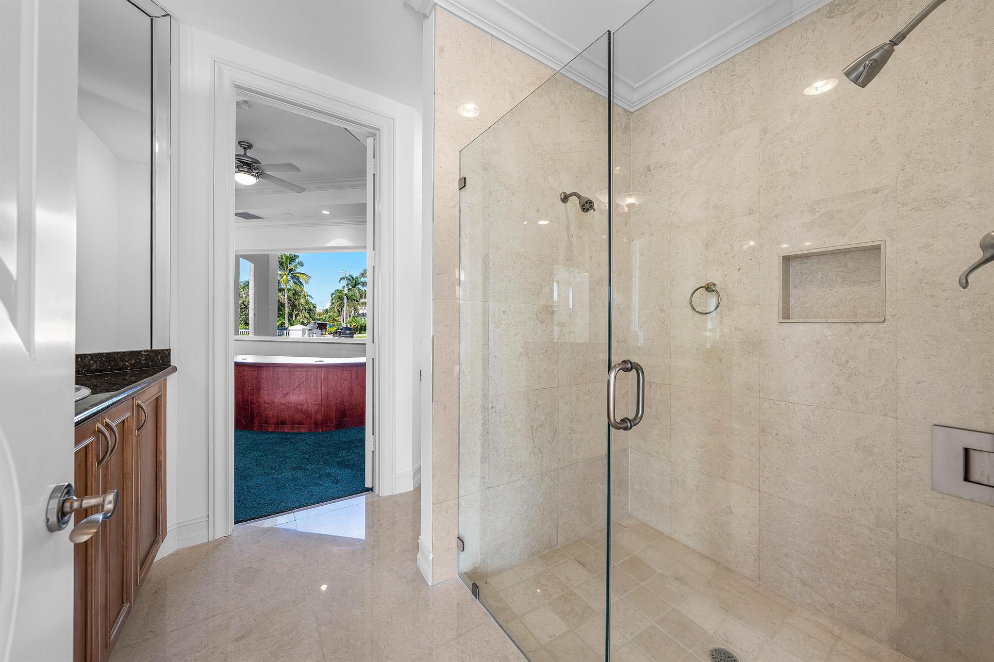 This extraordinary waterfront residence offers over 7,300 square feet under air, plus an additional 2,000 square feet of covered outdoor living space and balconies, creating a seamless indoor-outdoor lifestyle. Thoughtfully designed for both elegance and comfort, the home features five bedrooms and nine bathrooms, including two primary suites, one on each level. Situated on a coveted point lot in Delray Beach, the property boasts 126 feet of direct Intracoastal frontage and 125 feet of canal frontage, with direct ocean access and no fixed bridges. Boating amenities include a 50-foot dock with electric service, ample room to extend, and a 100-foot-wide canal, allowing for effortless yacht maneuvering and docking. From the moment you enter, you are greeted by panoramic water views