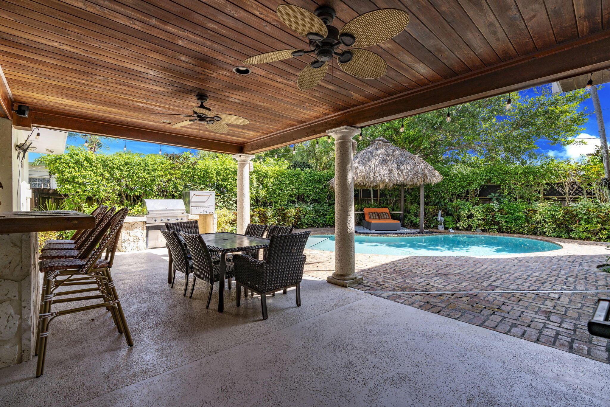 This 4-bedroom, 3-bath pool home is made for Florida living! The open layout highlights the pool and backyard oasis with outdoor kitchen, and new tiki hut. Perfect for entertaining! Inside features tile floors, granite counters, stainless appliances, and a 110-gallon faux fish tank. Upstairs, the master suite offers a walk-in closet, balcony overlooking the pool, steam shower, and jetted tub. Metal roof, impact sliders, and shutters complete the package -- all minutes from the Intracoastal, beaches, and downtown Lake Worth Beach.The furniture is negotiable.