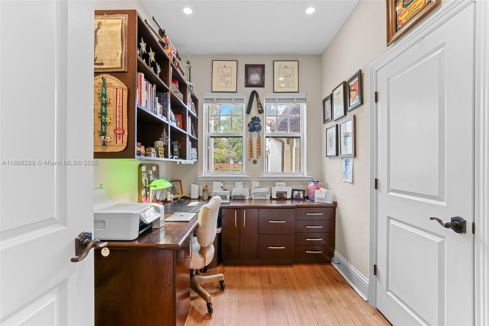 The Banyan House radiates timeless South Florida elegance in East Miami Shores. Set on an expansive double corner lot, this Mediterranean Revival residence showcases original hardwood floors, archways, a charming fireplace, and soaring beamed ceilings awash in natural light. French doors open to a colorful screened porch, while renovated baths and upgraded systems complement its preserved architectural character. A majestic banyan tree anchors the lush grounds, joined by a 2011-built detached 2.5-car garage with breezeway. Just a short walk to Bayfront Park, this rare estate blends historic charm with modern comfort in a vibrant neighborhood.