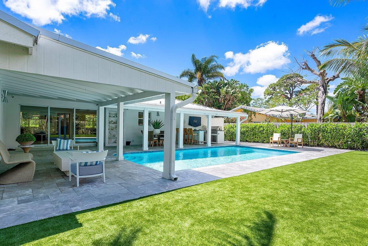 Step into luxury living at its finest with this completely renovated home in the heart of Boynton Beach. No detail has been overlooked in the transformation of this home, where modern amenities blend seamlessly with timeless elegance. From the moment you enter, you'll be greeted by the impeccable craftsmanship and attention to detail evident throughout. New electrical and plumbing (no cast iron pipes)! Step outside to discover an expansive pool area with covered loggia and summer kitchen/bar, perfect for outdoor entertaining. Custom landscaping, complete with landscape lighting and security cameras, enhances the curb appeal and security of the property. Practice your putting skills on the backyard putting green.