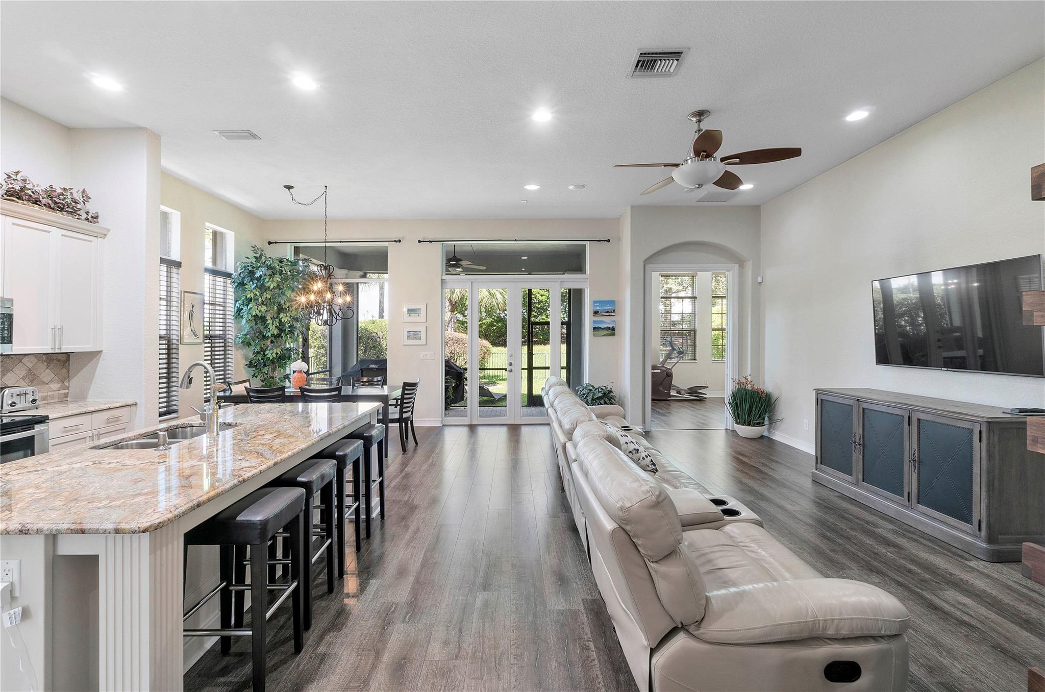 Beautifully updated 3BR/2BA single-story home in sought-after Creekside at Heron Bay. This light-filled home features accordion shutters throughout, elegant French doors, and updated flooring. The modern kitchen boasts a center cooking island, stainless steel appliances, and a walk-in pantry, flowing seamlessly into a spacious family room. The large primary suite offers two walk-in closets and a spa-like bath with dual vanities, soaking tub, separate shower, and private commode. Enjoy outdoor living in the private fenced yard with a screened-in patio, perfect for relaxing or entertaining. A move-in ready gem in a premier community!